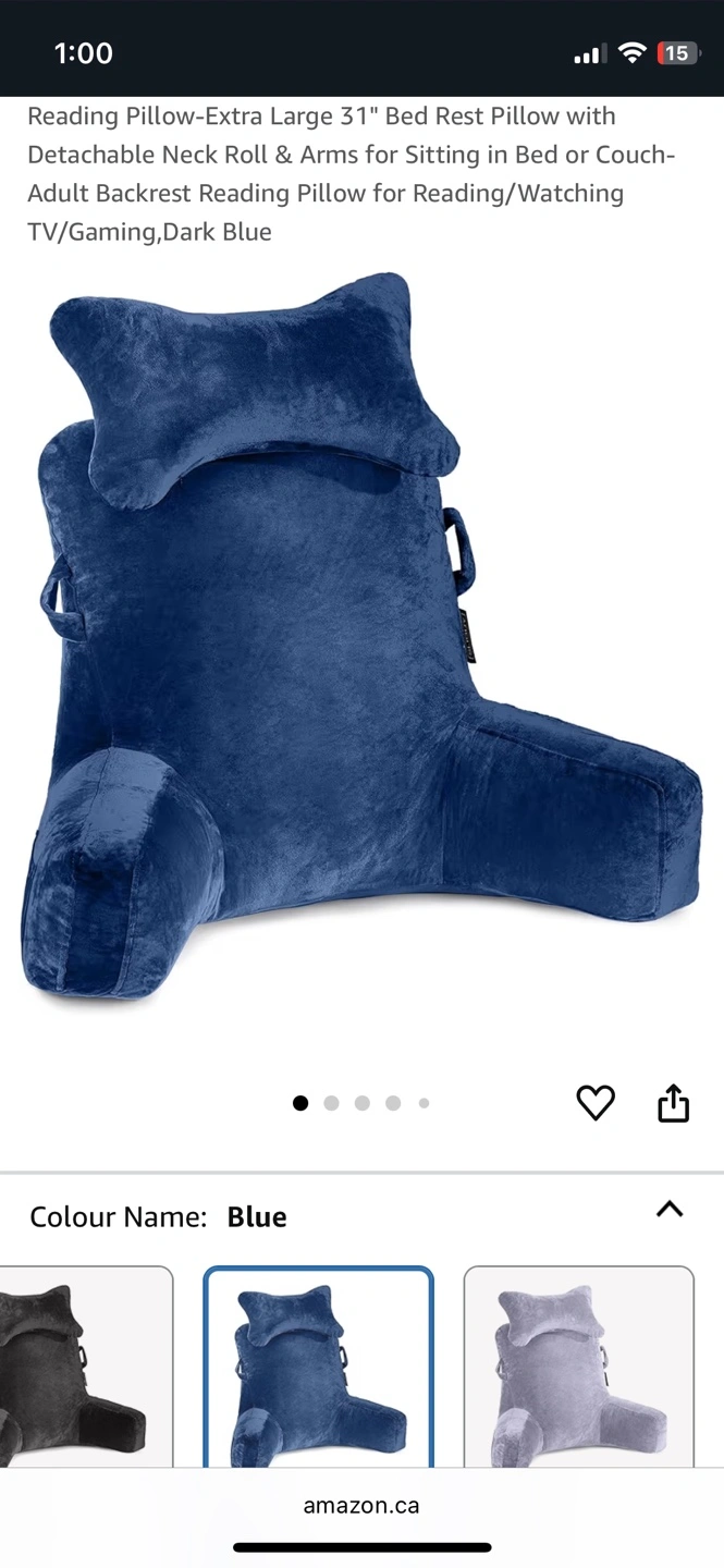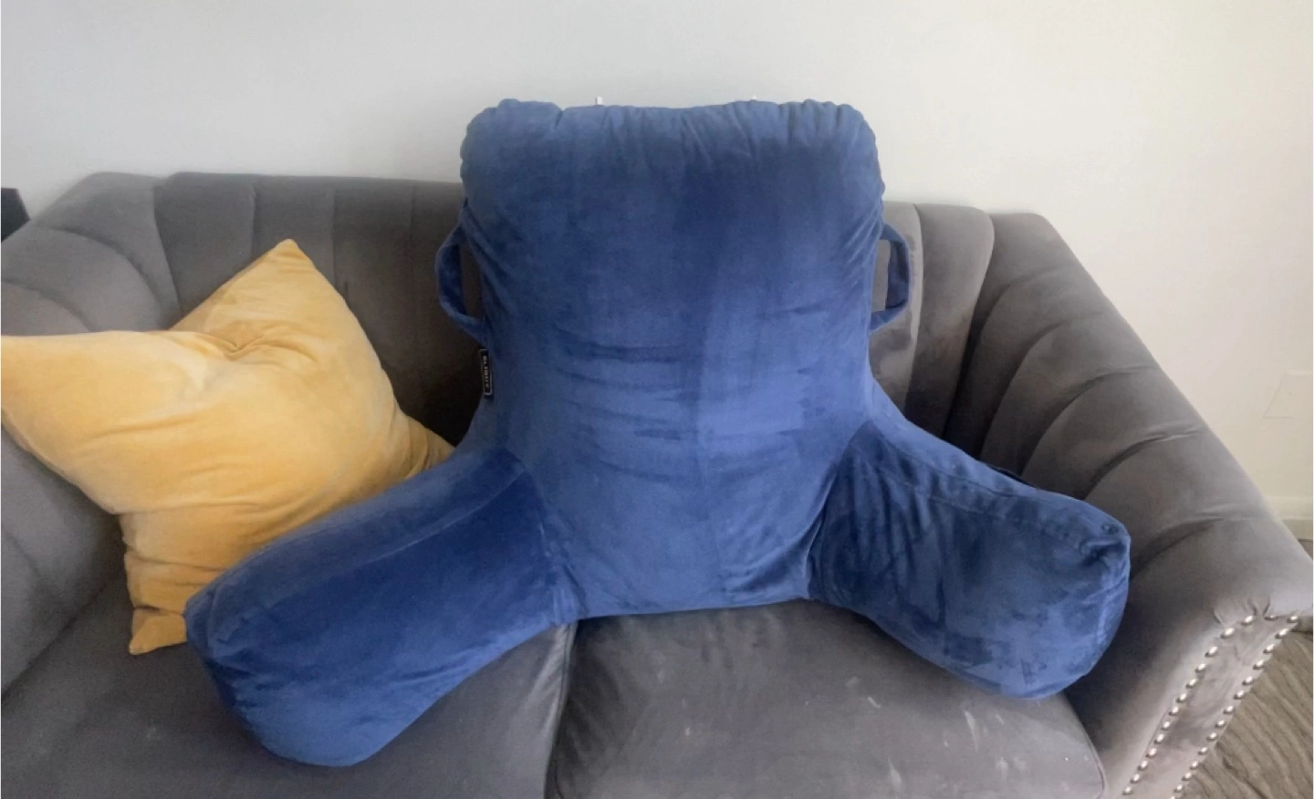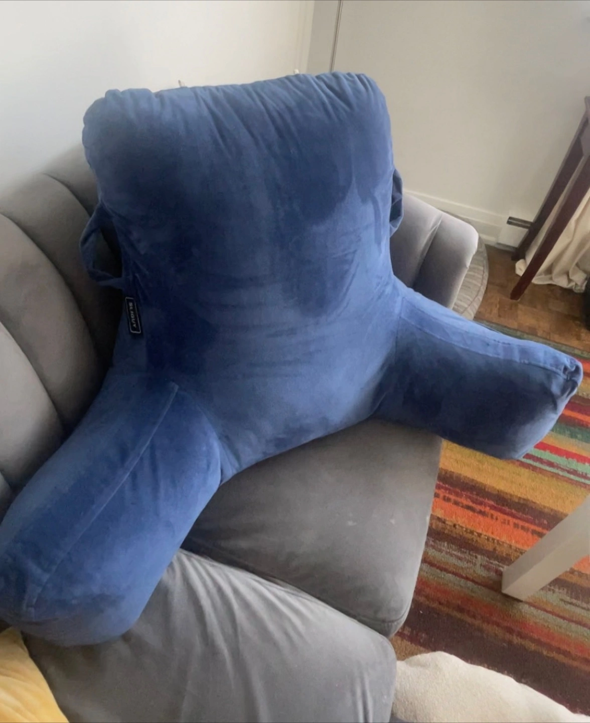 A luxurious blue backrest pillow. Features arm rests and a pockets on each arm, large pocket at the back, handles and phone cord loops. You'll find this pillow is a great source of comfort when relaxing.