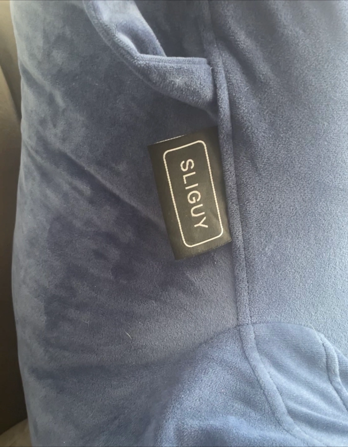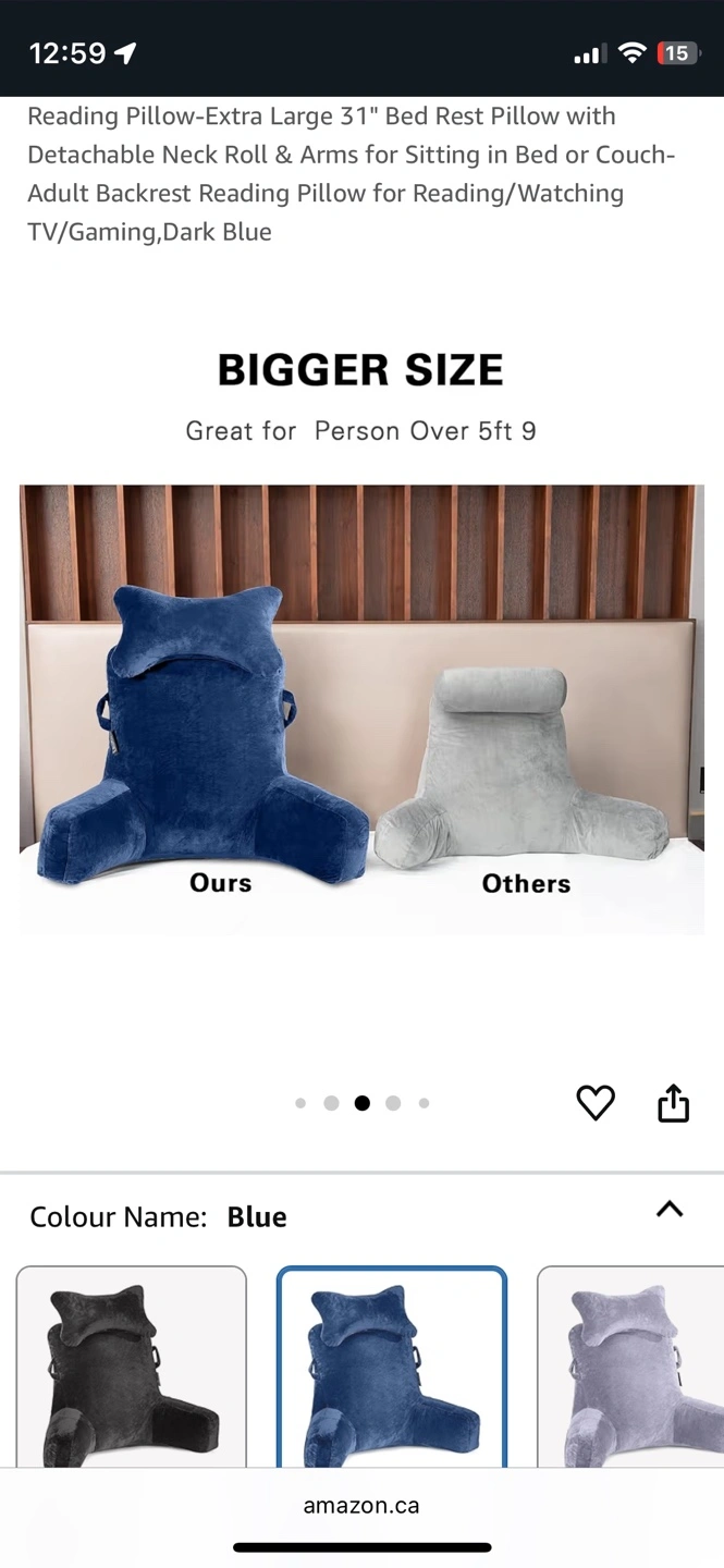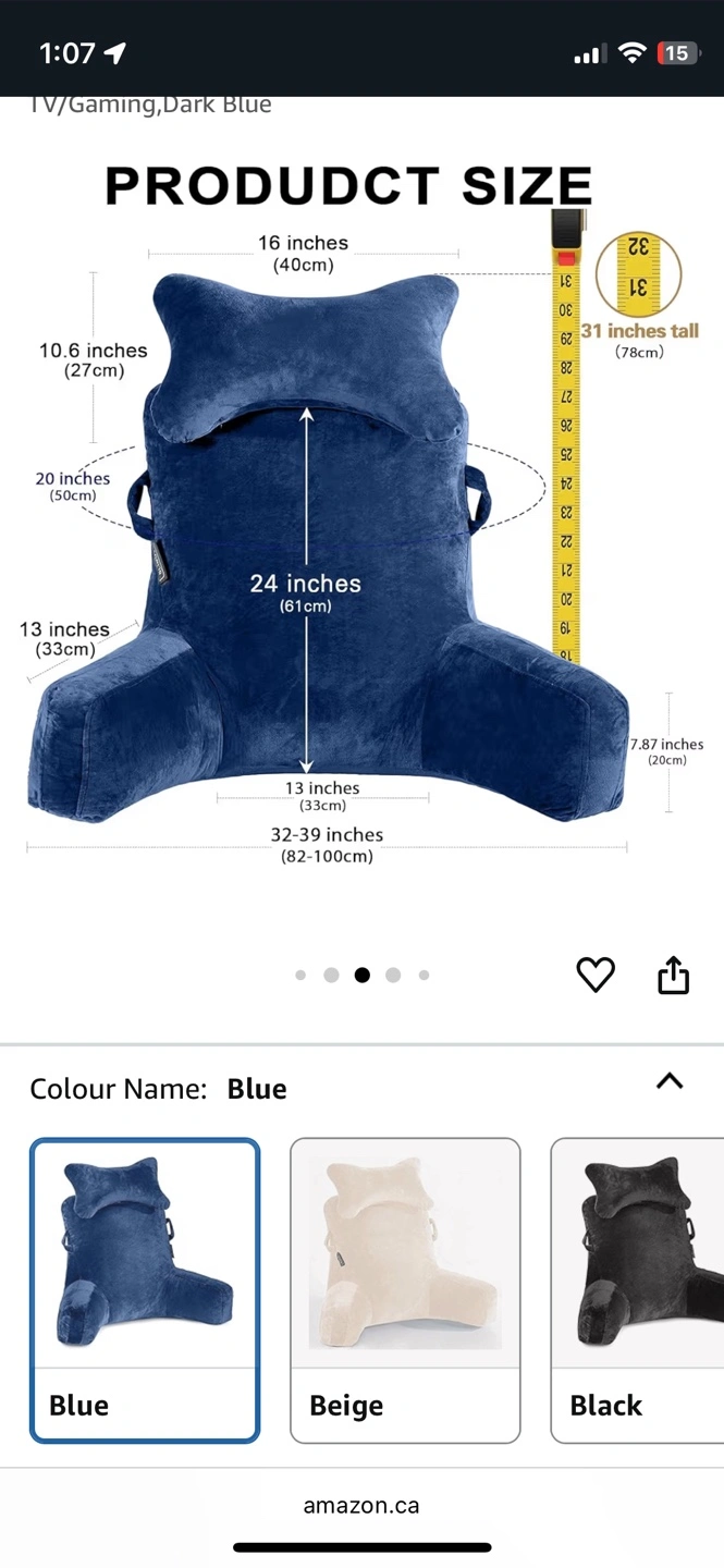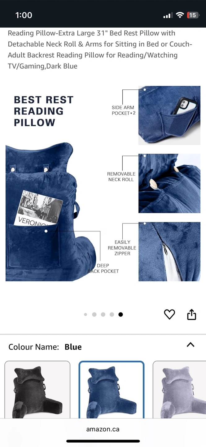 A luxurious blue backrest pillow. Features arm rests and a pockets on each arm, large pocket at the back, handles and phone cord loops. You'll find this pillow is a great source of comfort when relaxing.