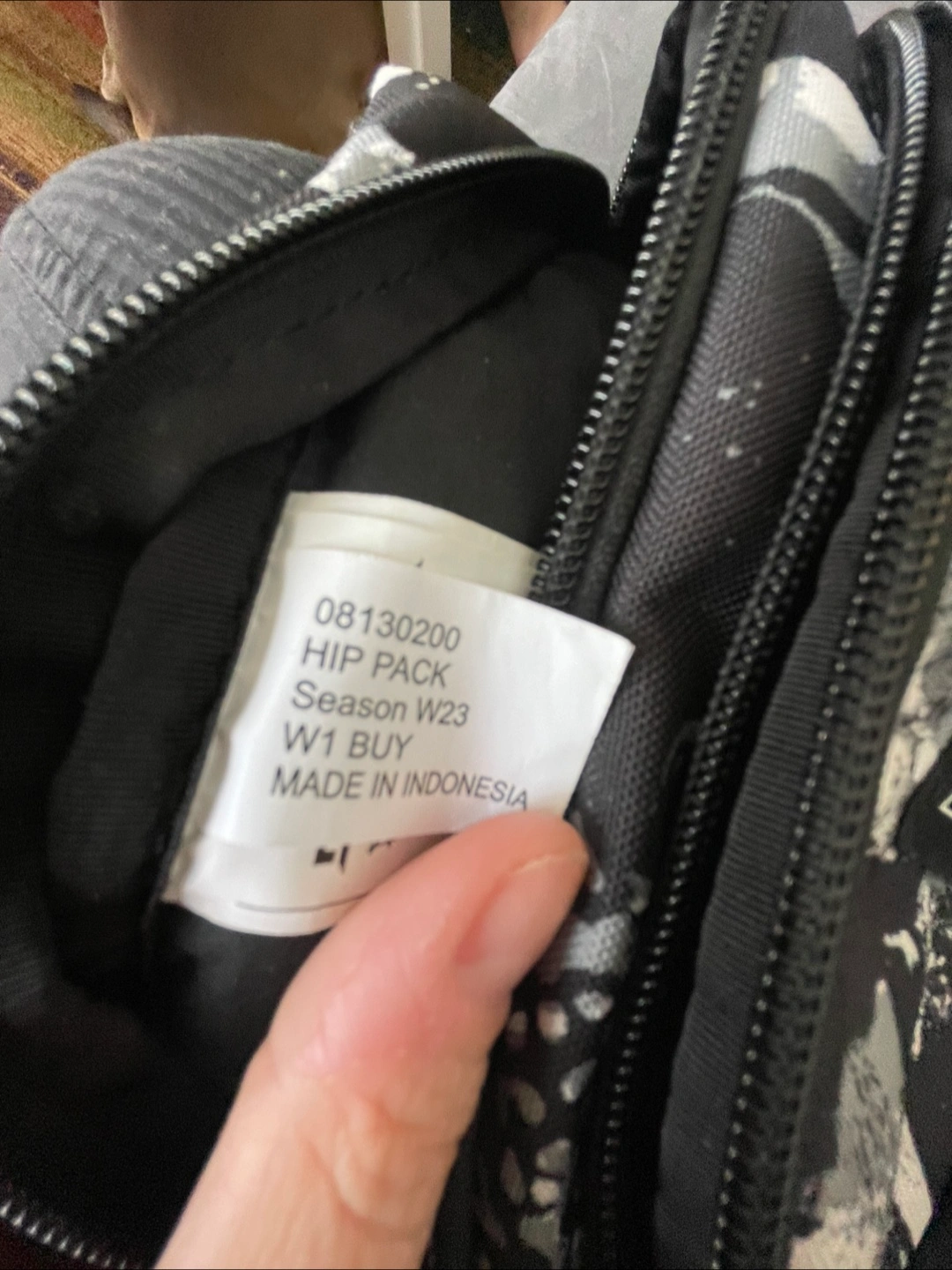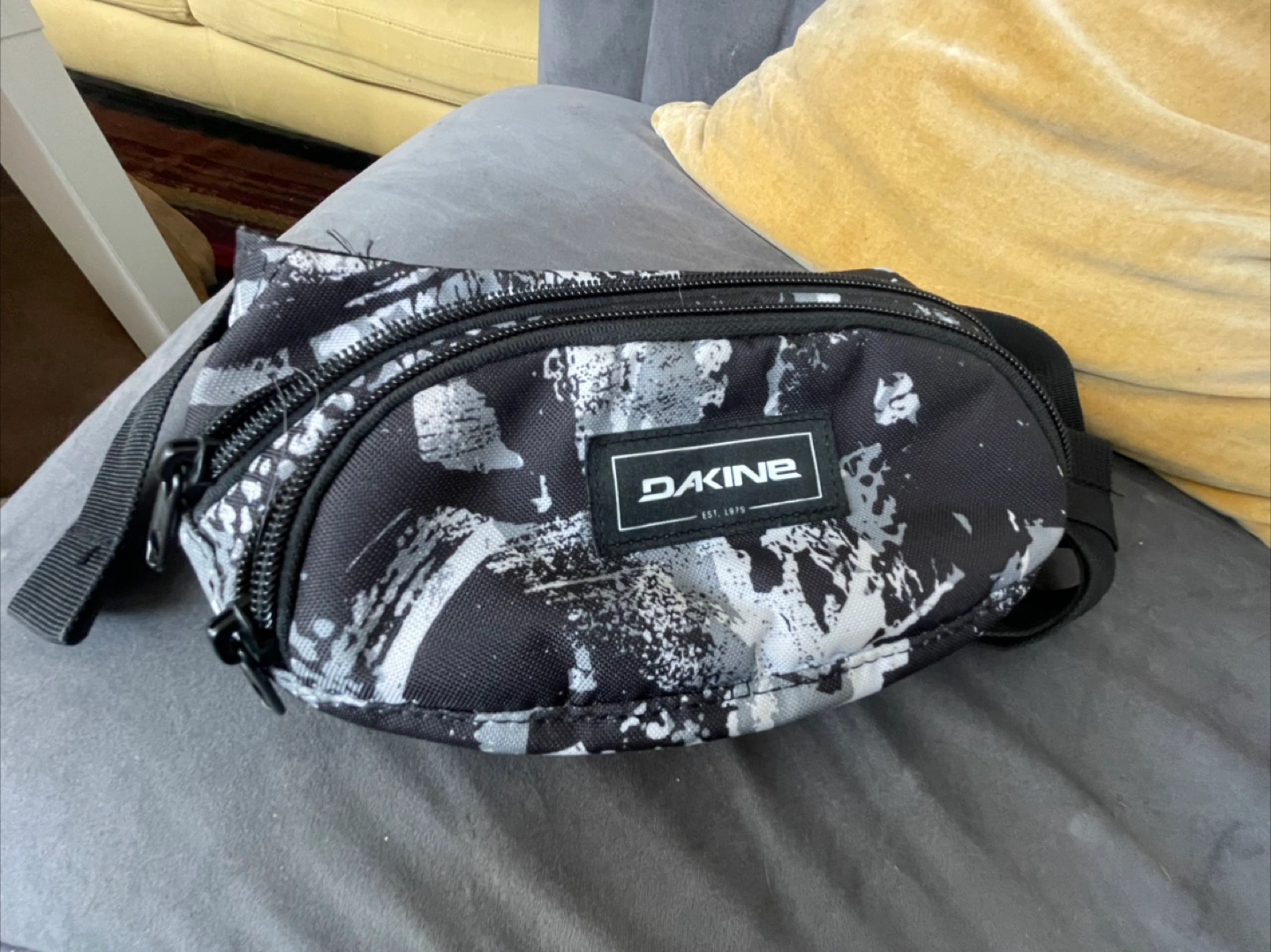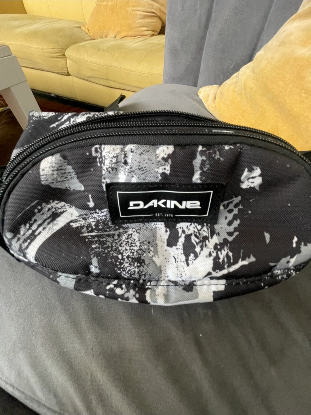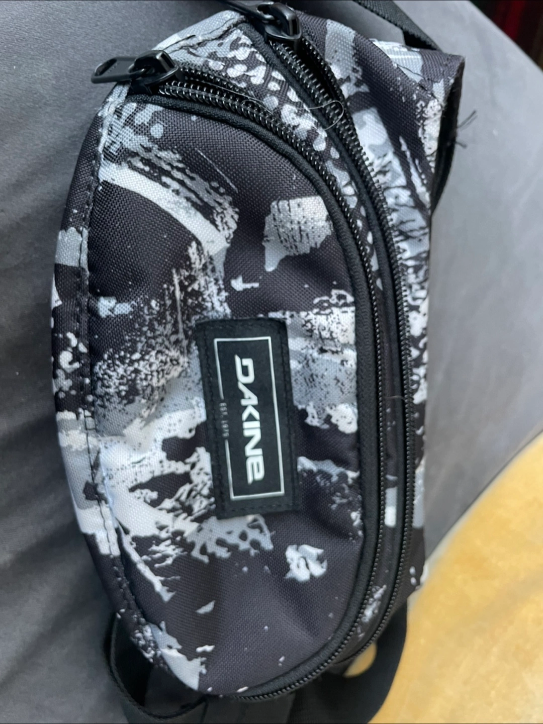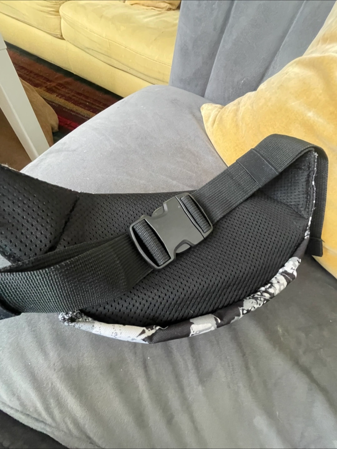 Black and white patterned hip pack. Features a zippered closure. Adjustable strap with a buckle. Perfectly sized to bring along your essentials for a relaxing day out.