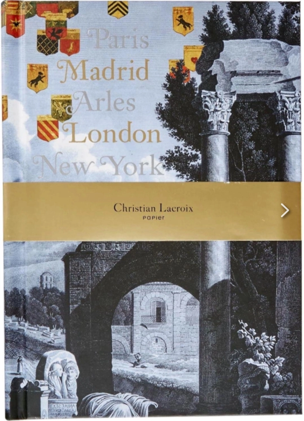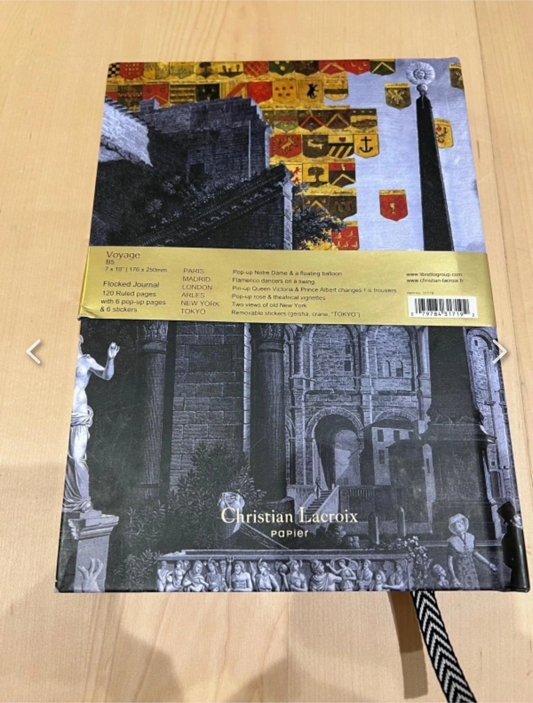 Incredible Christian Lacroix Voyage Travel Journal, 7 x 10 Inches, 120 Ruled Pages Since its inception in 1987, the House of Christian Lacroix has electrified the fashion world with its collections inspired by Gypsy and Provencal traditions, and by the flamboyant Haute Couture scene in Paris and London during the Swinging 60's. Today, with the Christian Lacroix Paper collection you are invited to share in this celebration of the singular French joie de vivre. The Voyage Travel Journal features a flocked hardbound cover and 96 ruled ivory pages. A book with multiple uses: travel journal, diary and journal. Cover engraving with the Roman ruins of Arles celebrates six great cities: Paris, Madrid, London, Tokyo, Arles, and New York with each city name in gold or silver hot stamp. Four end papers with ornate world maps. Decorative stickers evoke the character of each city. Paper engineering and pop-up technology bring each city to life: Arles, London, Madrid, Paris, New York and Tokyo. Black and white striped chevron ribbon marker. Gilded page edges. Express yourself with classic French flair with the Christian Lacroix Paper Collection.