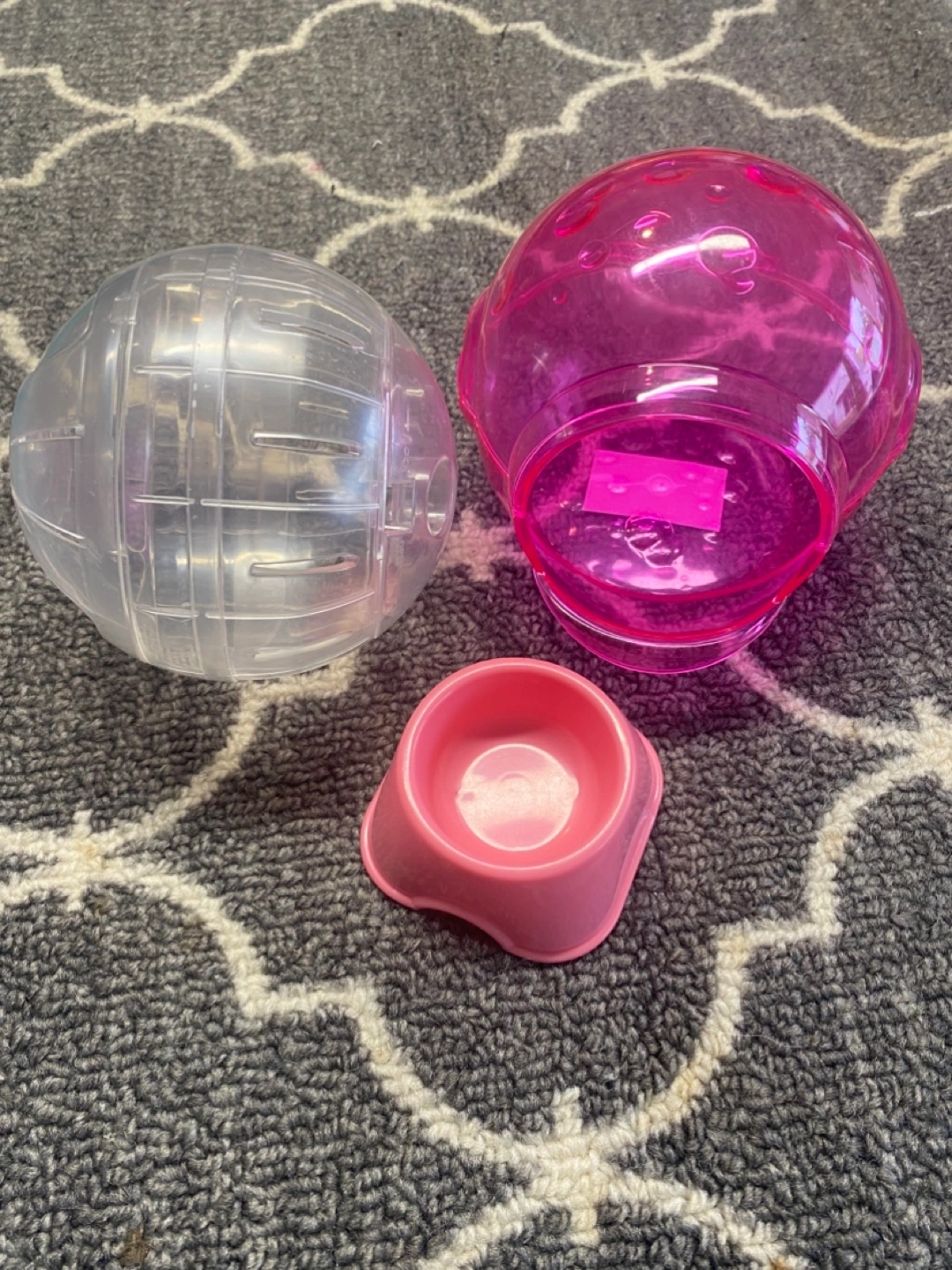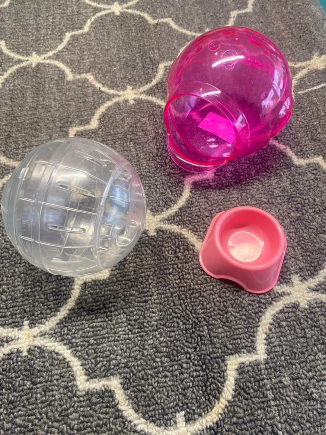 Clear plastic exercise ball. A pink hamster house. Small pink food bowl. A perfect way to provide exercise for your furry friend. All clean and in good condition. Cash and pick up only, Lakeshore and Cawthra area in Mississauga. Take all 3/$5