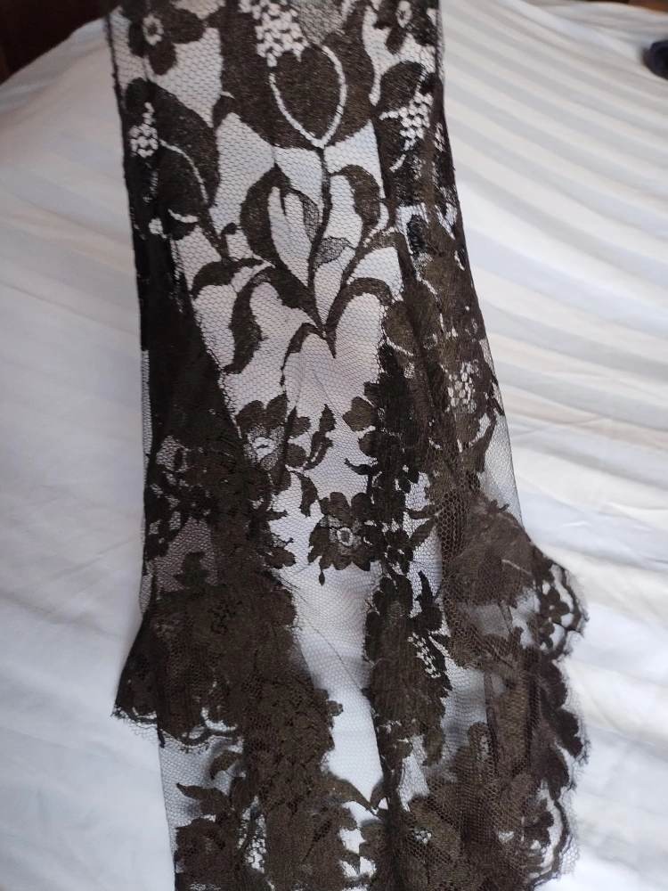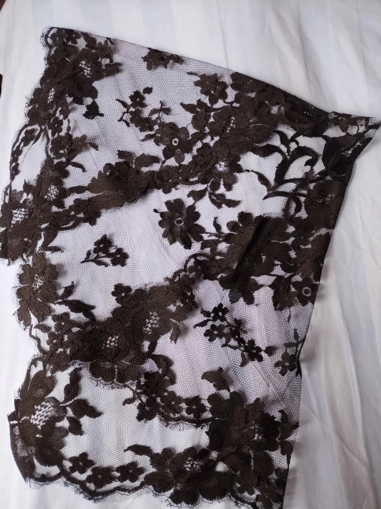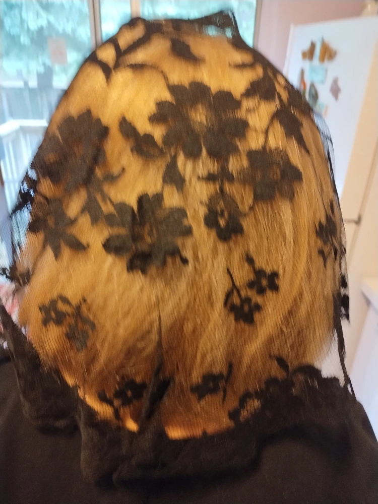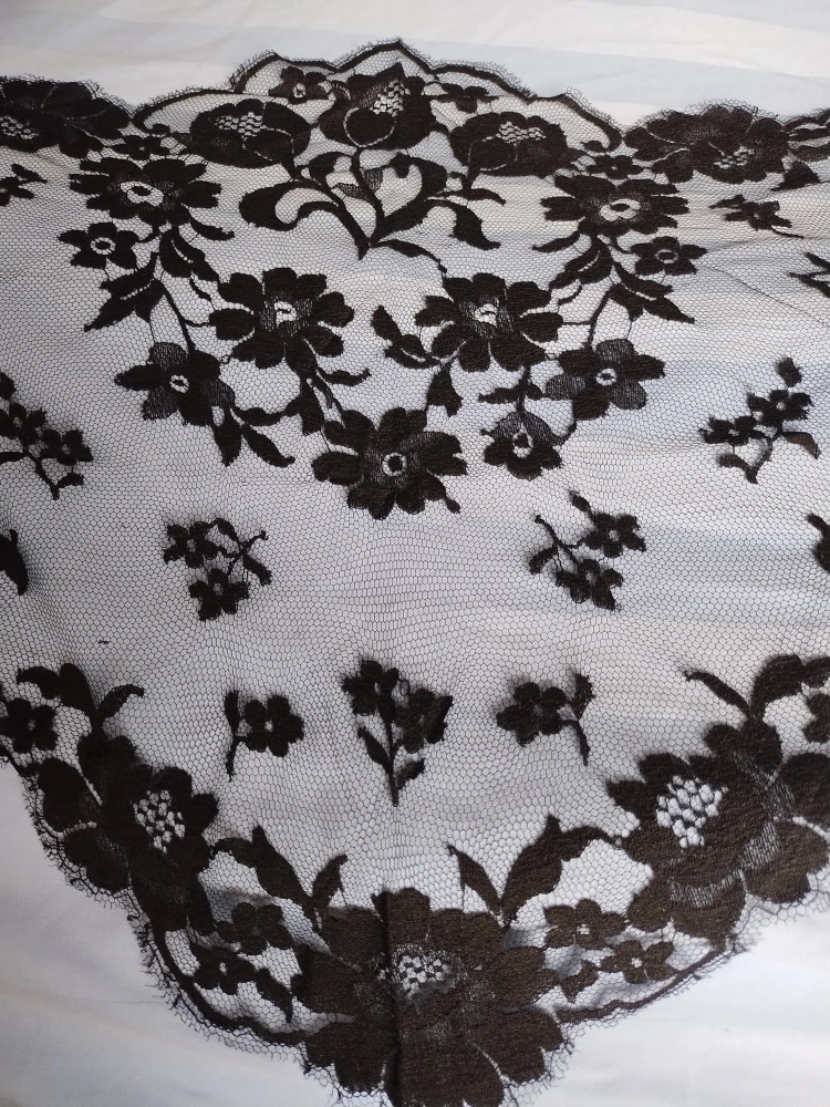 A sheer black lace head covering from Spain. Features a floral design. Great for offering a sense of privacy or serenity in any space.