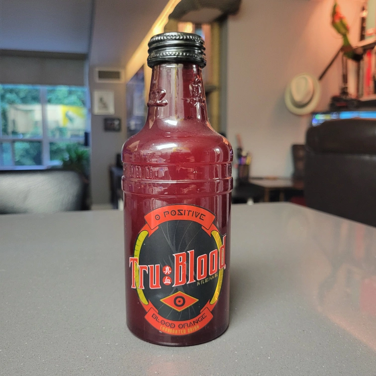 A bottle of blood orange carbonated drink. O positive. Contains writing in what appears to be Japanese characters. Enjoy this drink while refraining from human blood.