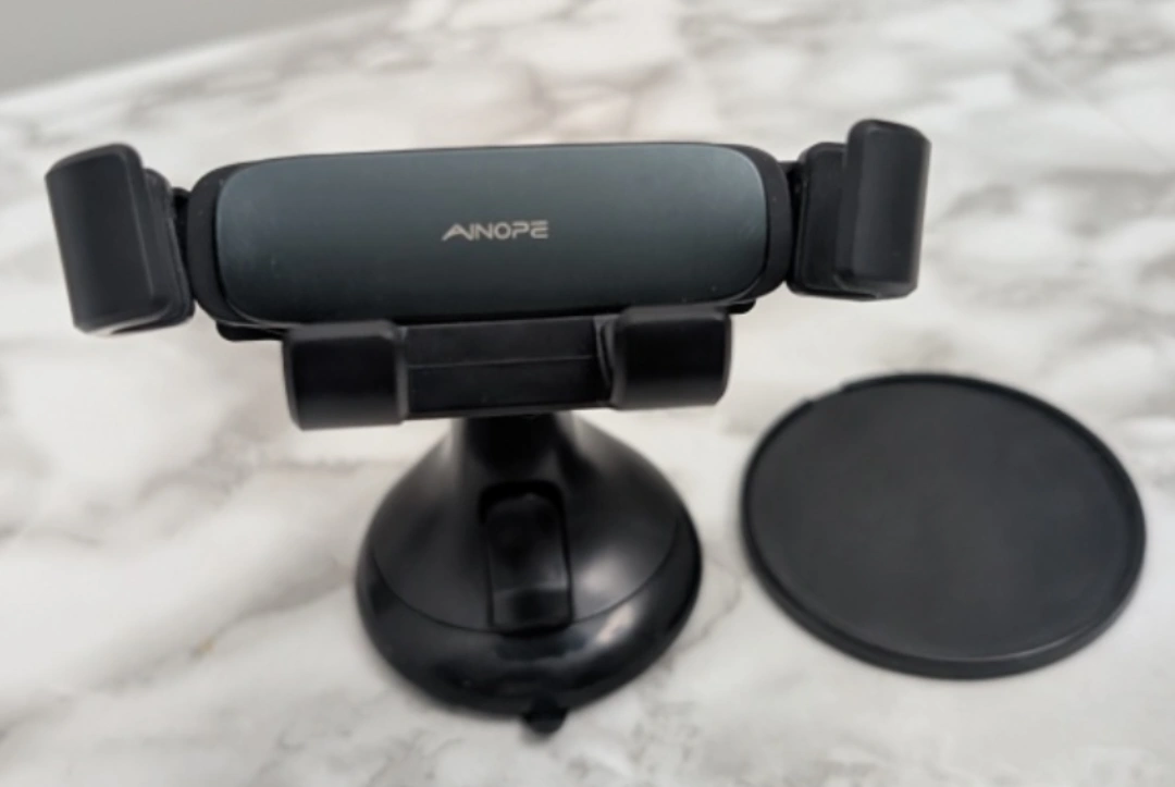 A phone mount for your car. Includes a suction cup base. The phone holder can be adjusted to fit your phone. You can easily use this for hands-free navigation.
