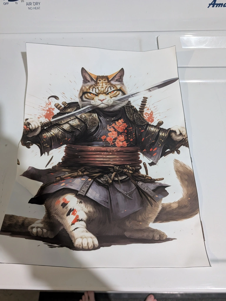 Featuring a cool cat wearing samurai armor, holding a katana. A print to add a touch of whimsical flair. You can hang it on your wall to enjoy a relaxing and unique piece of art.
