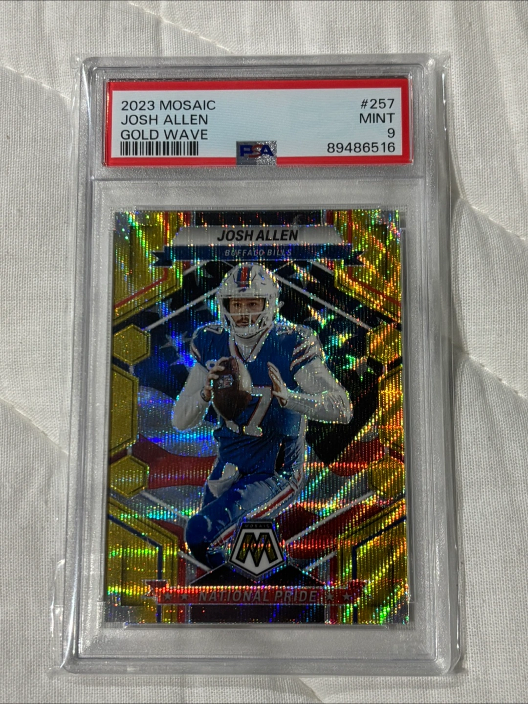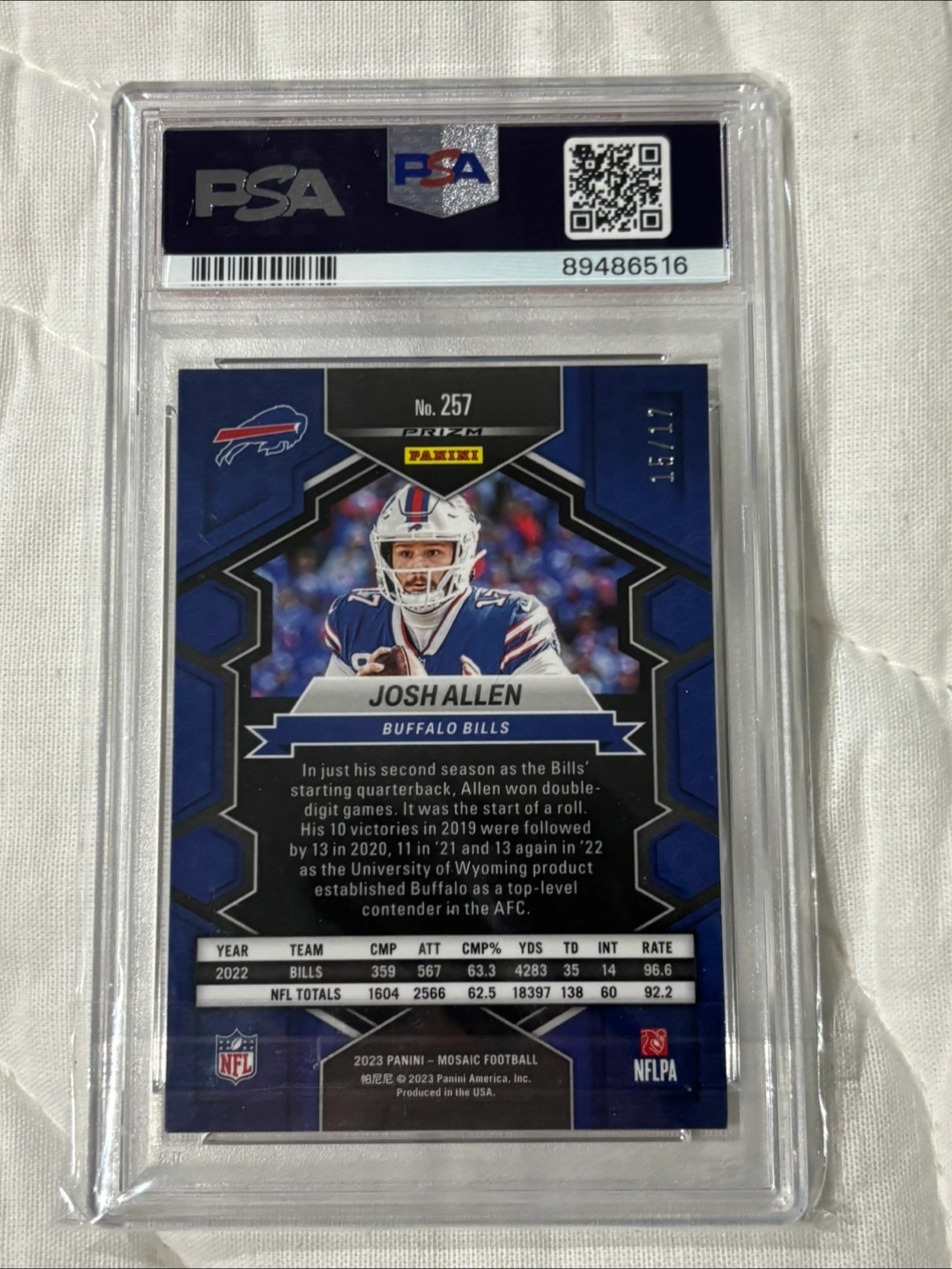 A collectible sports card featuring Josh Allen. The card is encased in a protective holder. An excellent item to add to your collection. **NFL MVP** - Numbered /17 - PSA 9 - message for inquires - located at dufferin and Lawrence