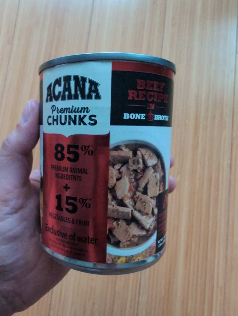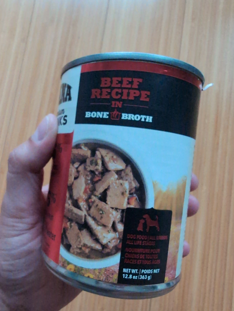 Canned food for dogs. Features beef recipe in bone broth. Contains premium animal ingredients with vegetables and fruit. This food is a great way to give your best friend a healthy and delicious meal. It's free because the pull tab came off and I cannot open the can