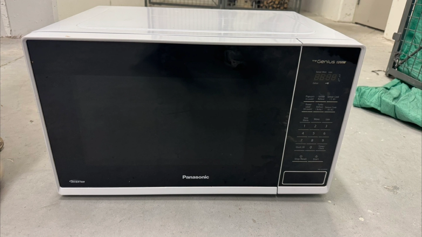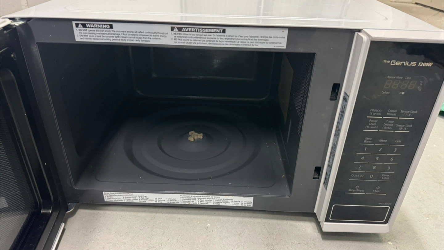 A white microwave with a black front. Features a digital display and several buttons. Ideal for quickly heating up leftovers. Needs inside round glass