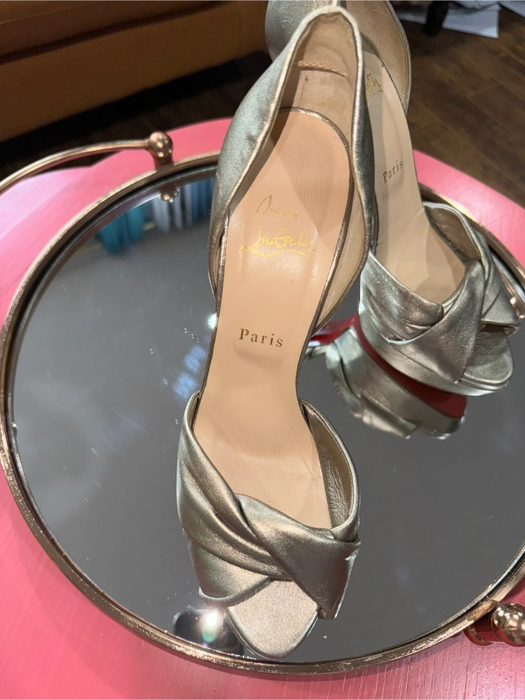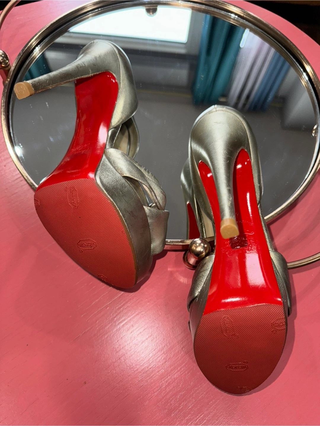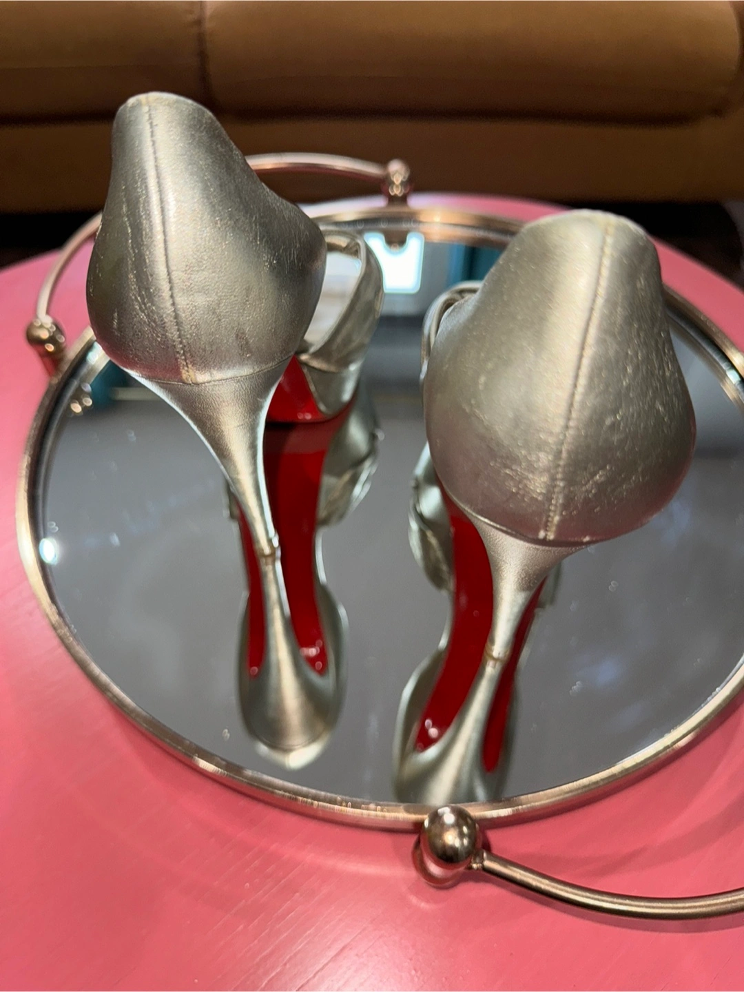 I am selling a pair of stunning metallic heels. The design is elegant and the colour gives a glamorous touch. These shoes would be a perfect complement for a night out with friends, making you feel confident all night long.