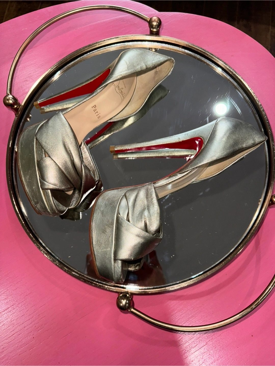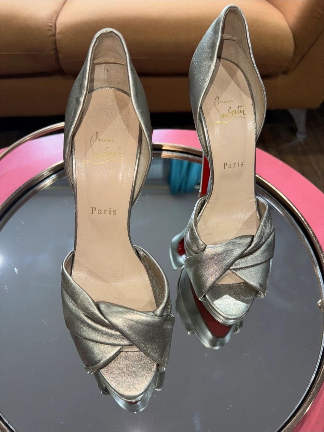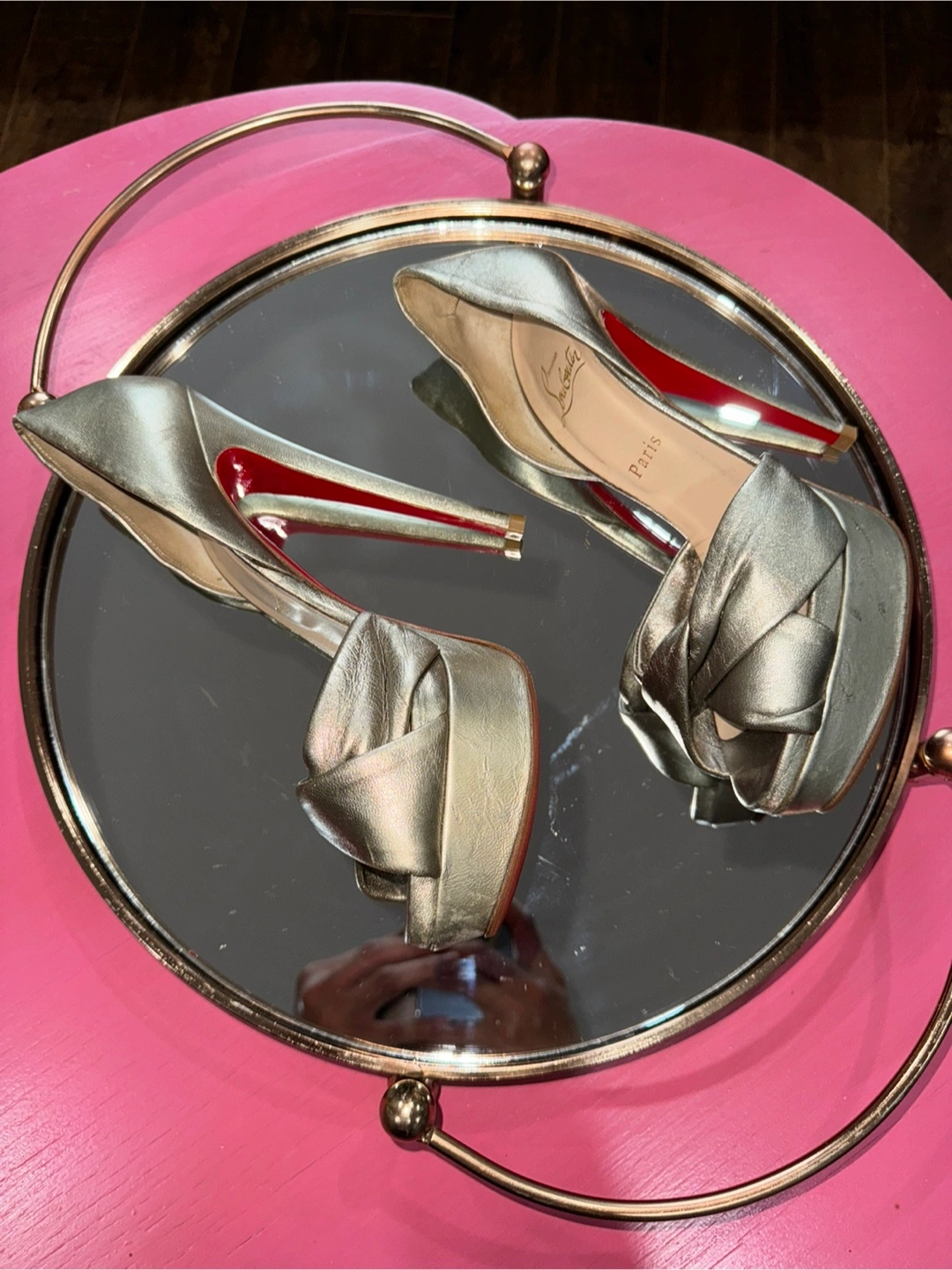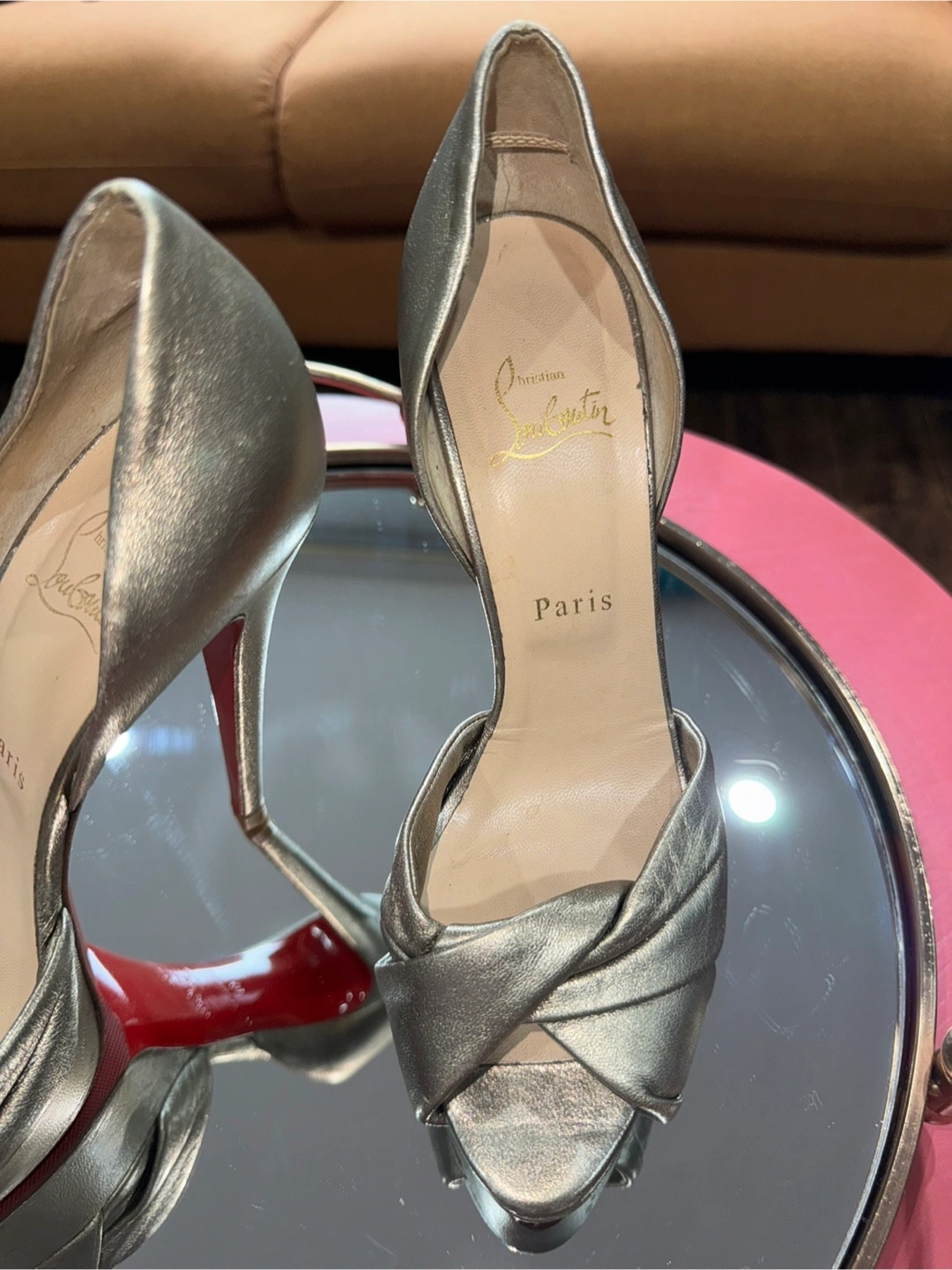 I am selling a pair of stunning metallic heels. The design is elegant and the colour gives a glamorous touch. These shoes would be a perfect complement for a night out with friends, making you feel confident all night long.