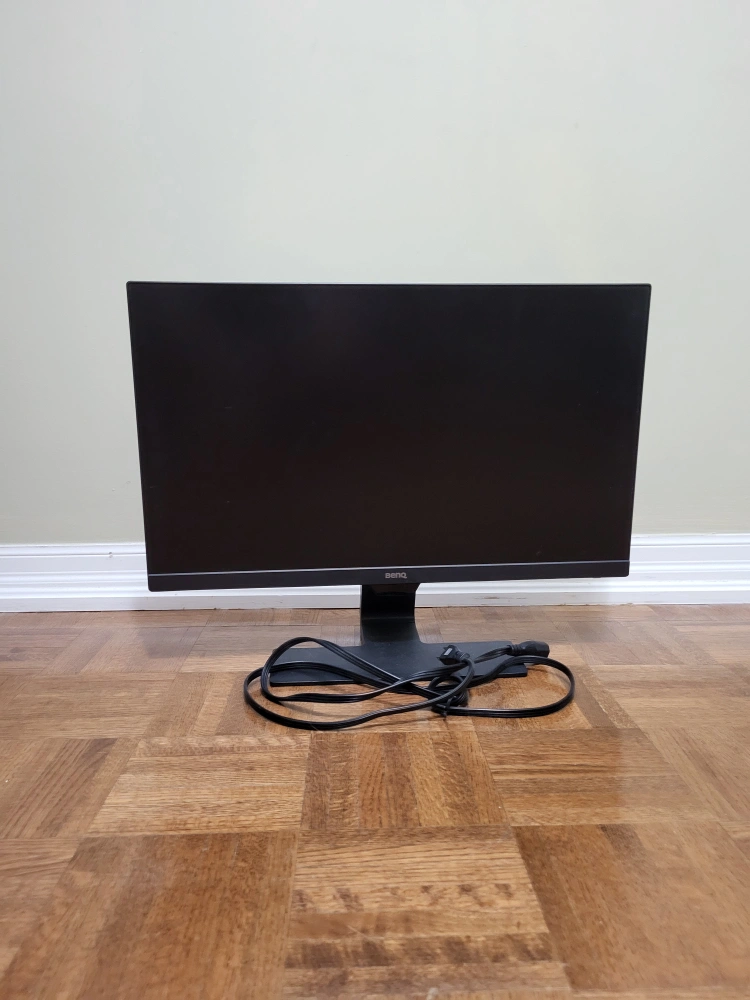 A black BenQ computer monitor. A power cord is attached. It has a black stand, and it looks great to use while working from home.