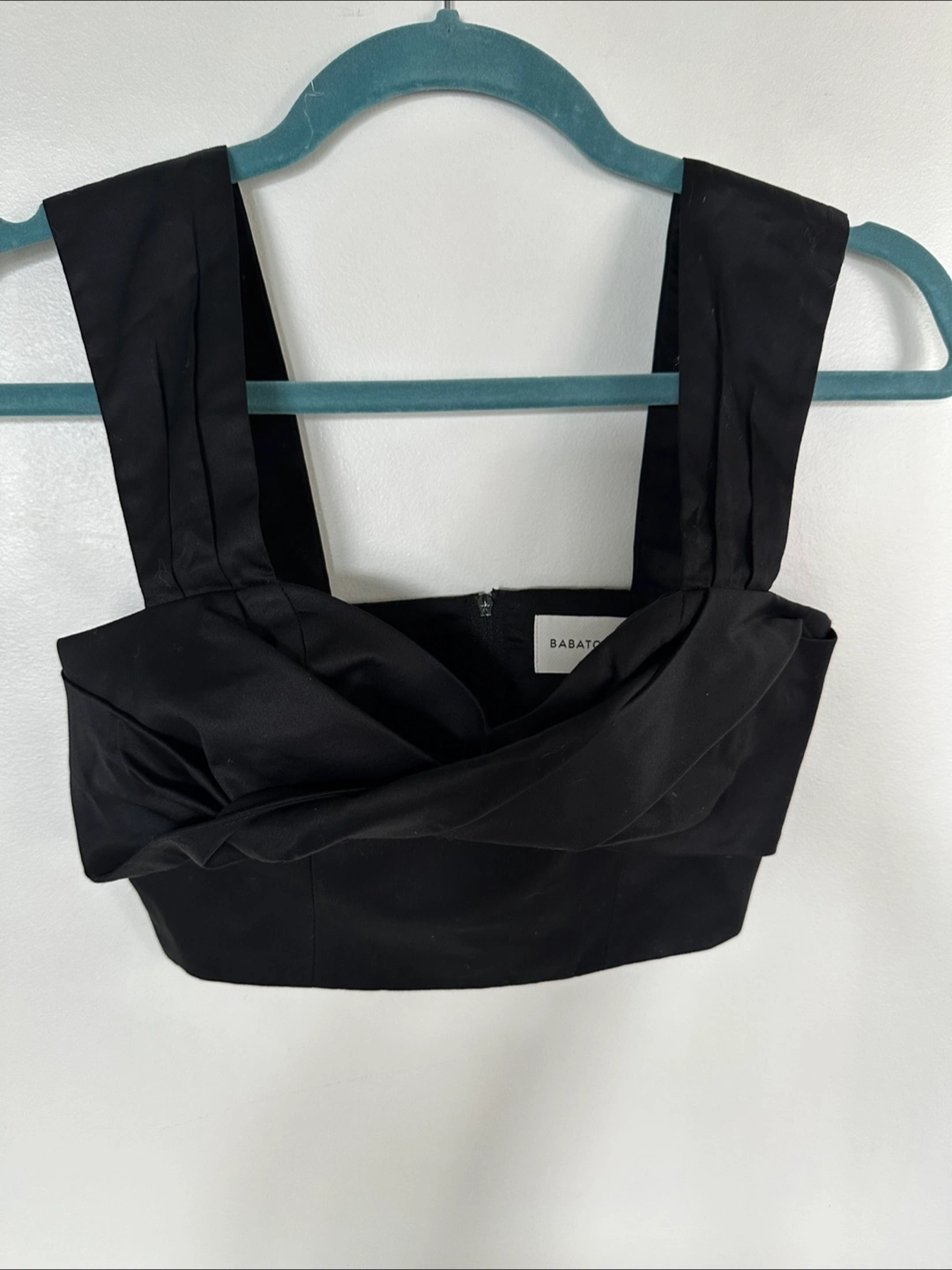 A stylish black crop top. Featuring large straps. Front has a twisted design. A versatile top that can complete any outfit and bring you peace of mind.