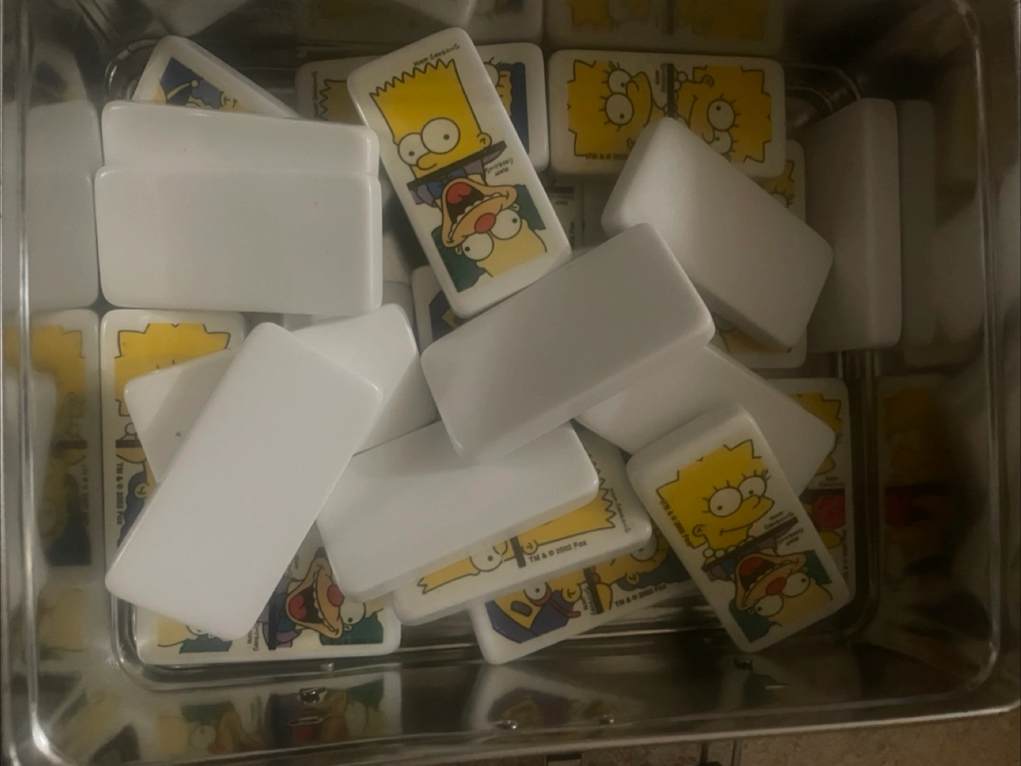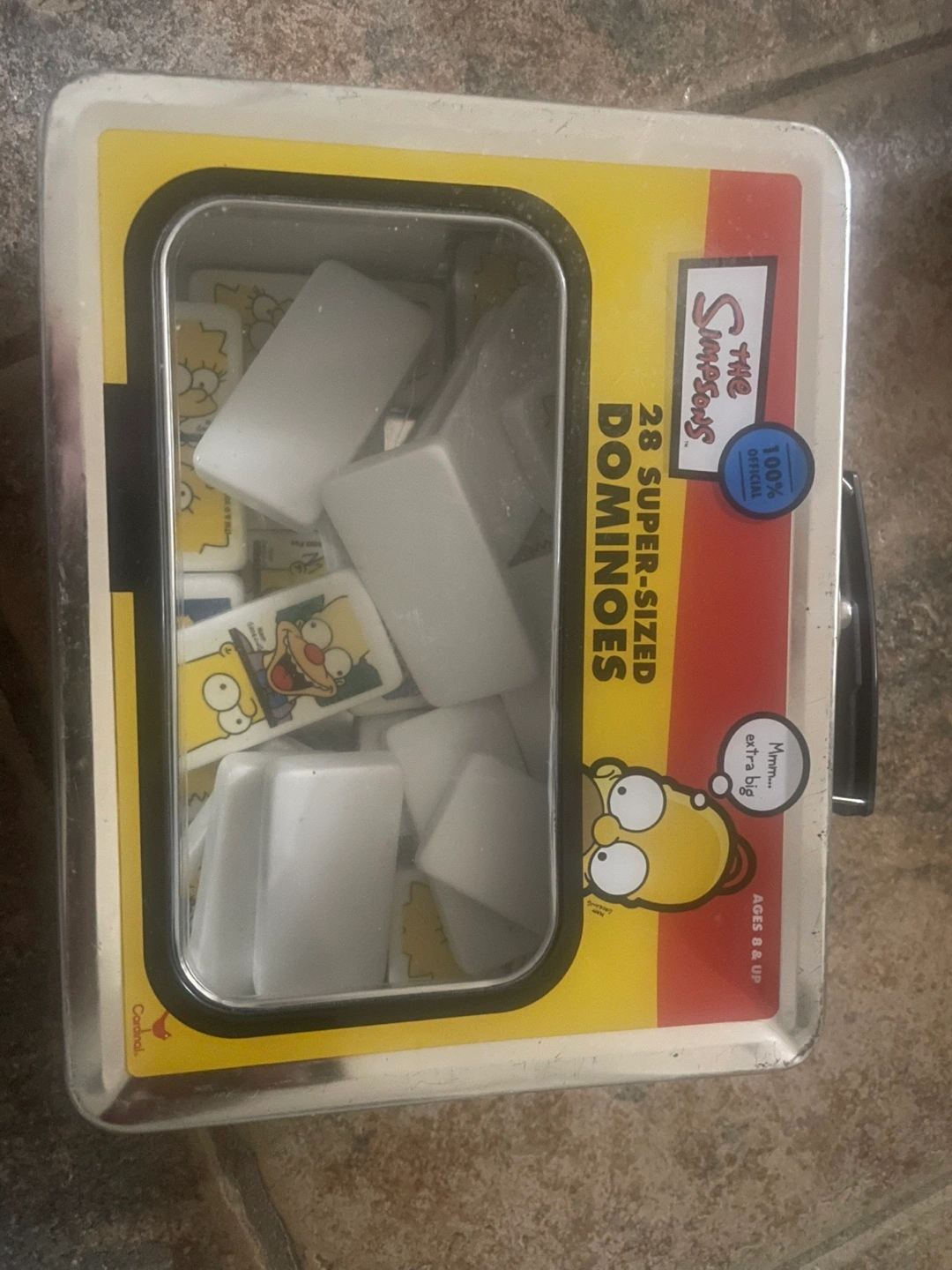 A fun game for the whole family. Dominoes are in a metal container. Features The Simpsons character faces on the dominoes. Pick up is Chappelle .