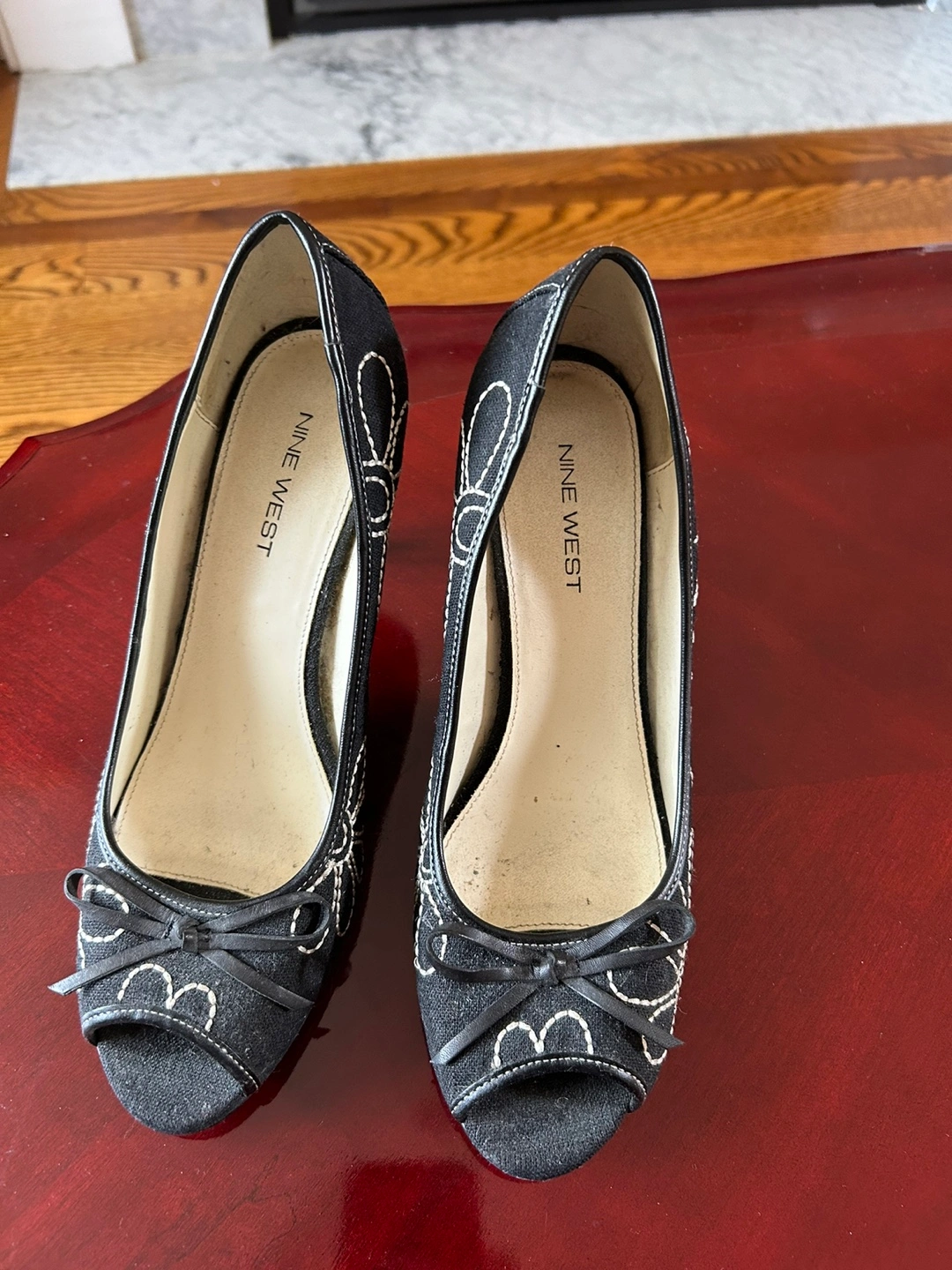 Black heels. Detailed with a white floral design. Featuring bows on the front.