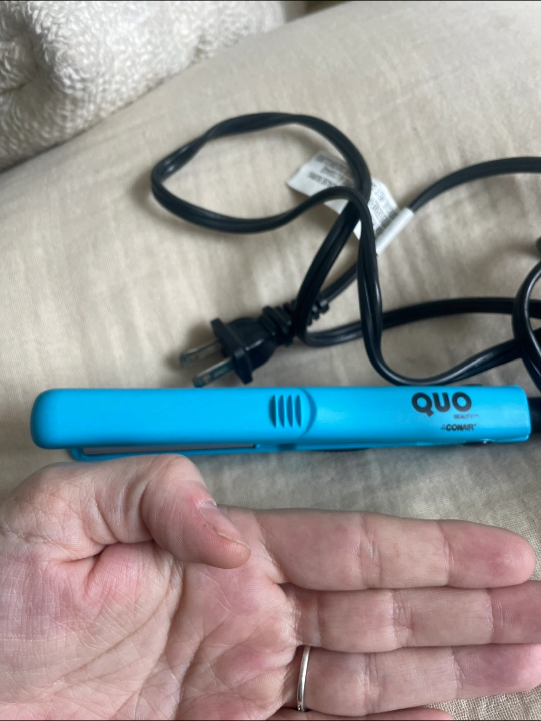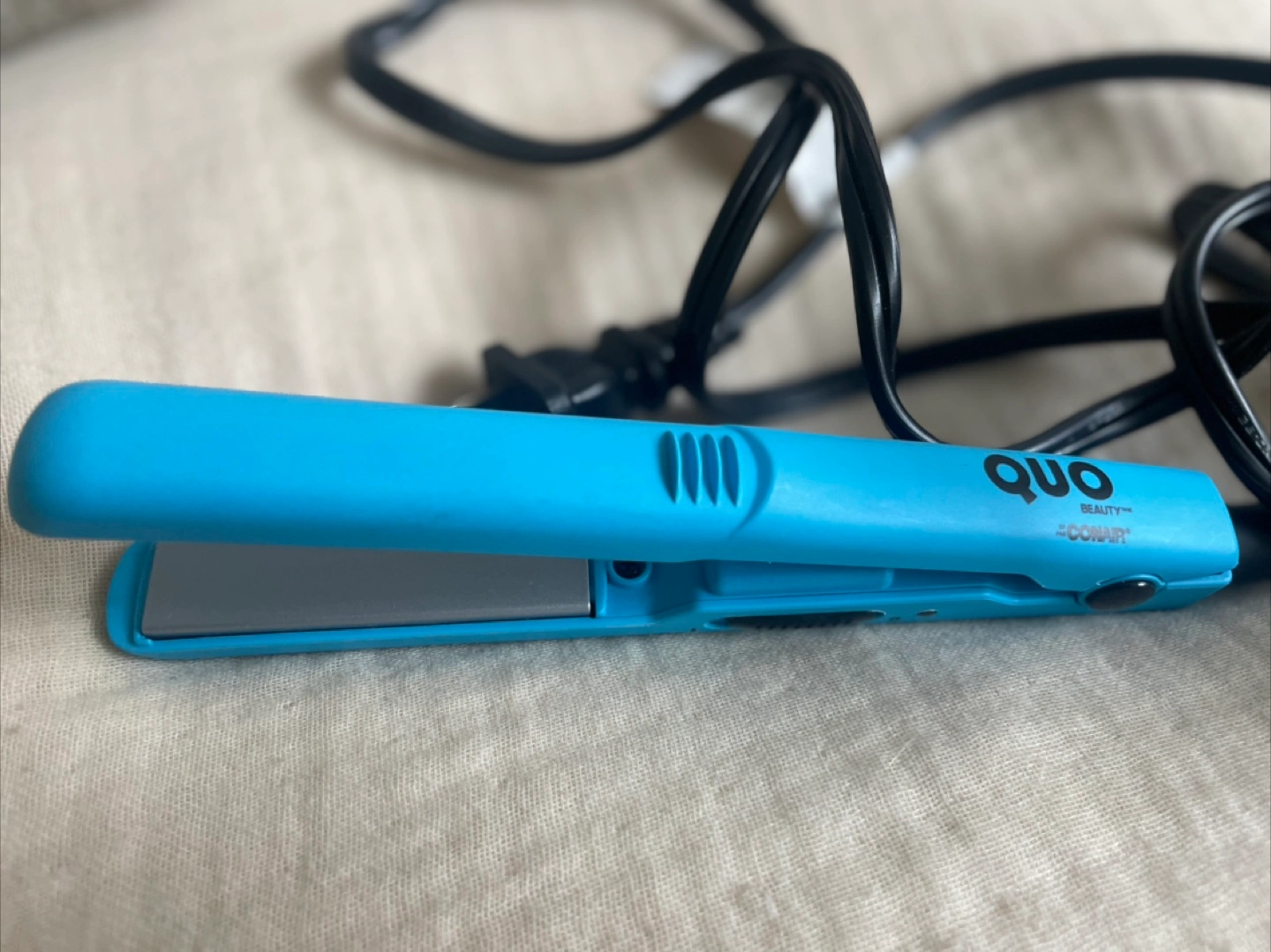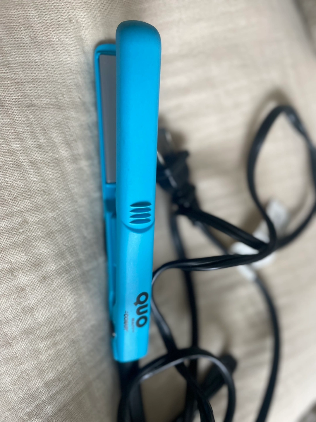 A blue hair straightener. Features a black power cord. Ideal for smoothing hair. Take some time for yourself and use this straightener to relax.