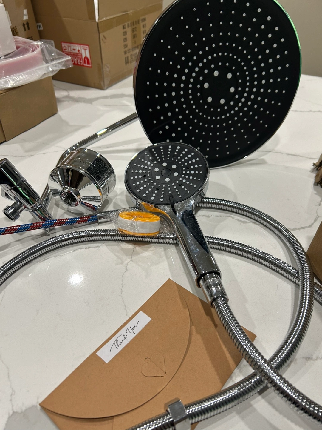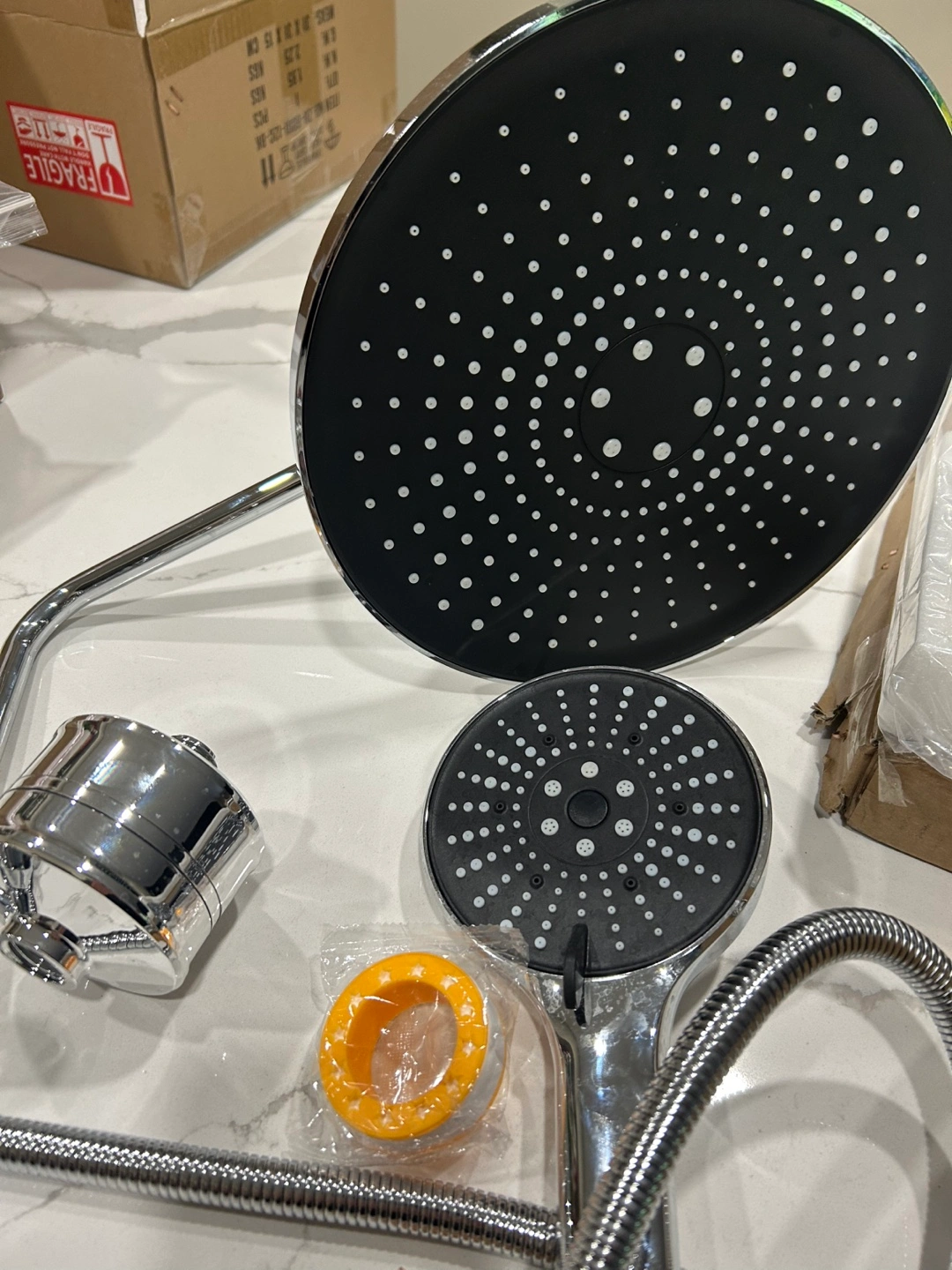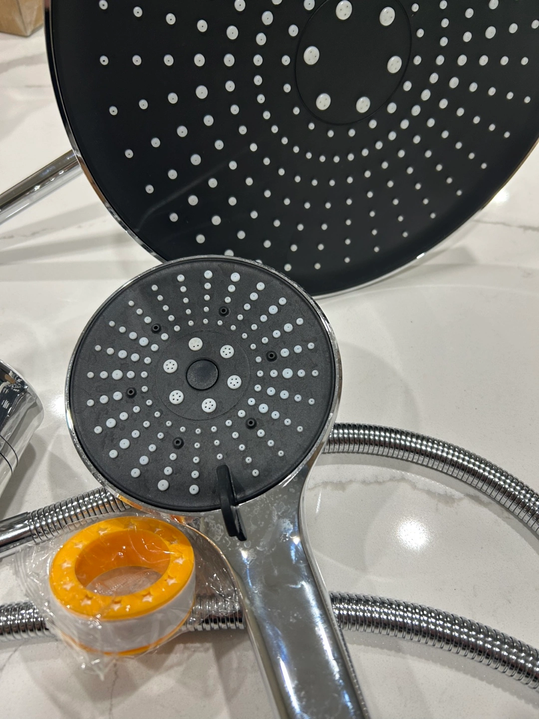 10 inch rainfall shower head and a handheld shower head. Both are black and chrome. There is also a hose, connector, and fittings.