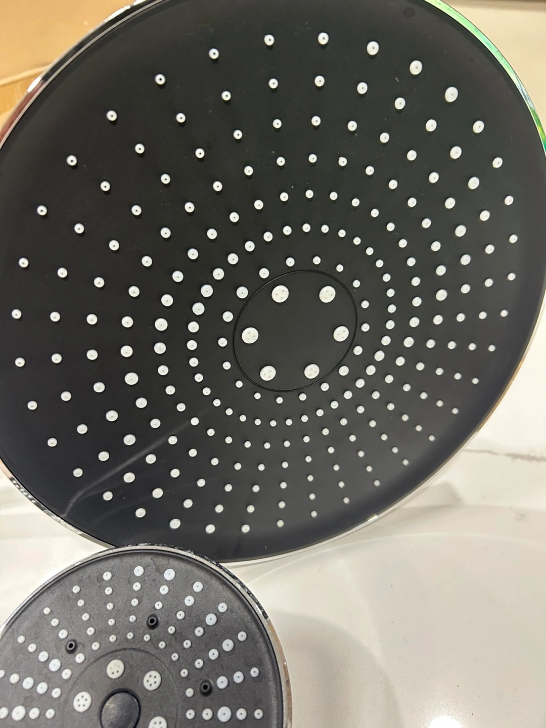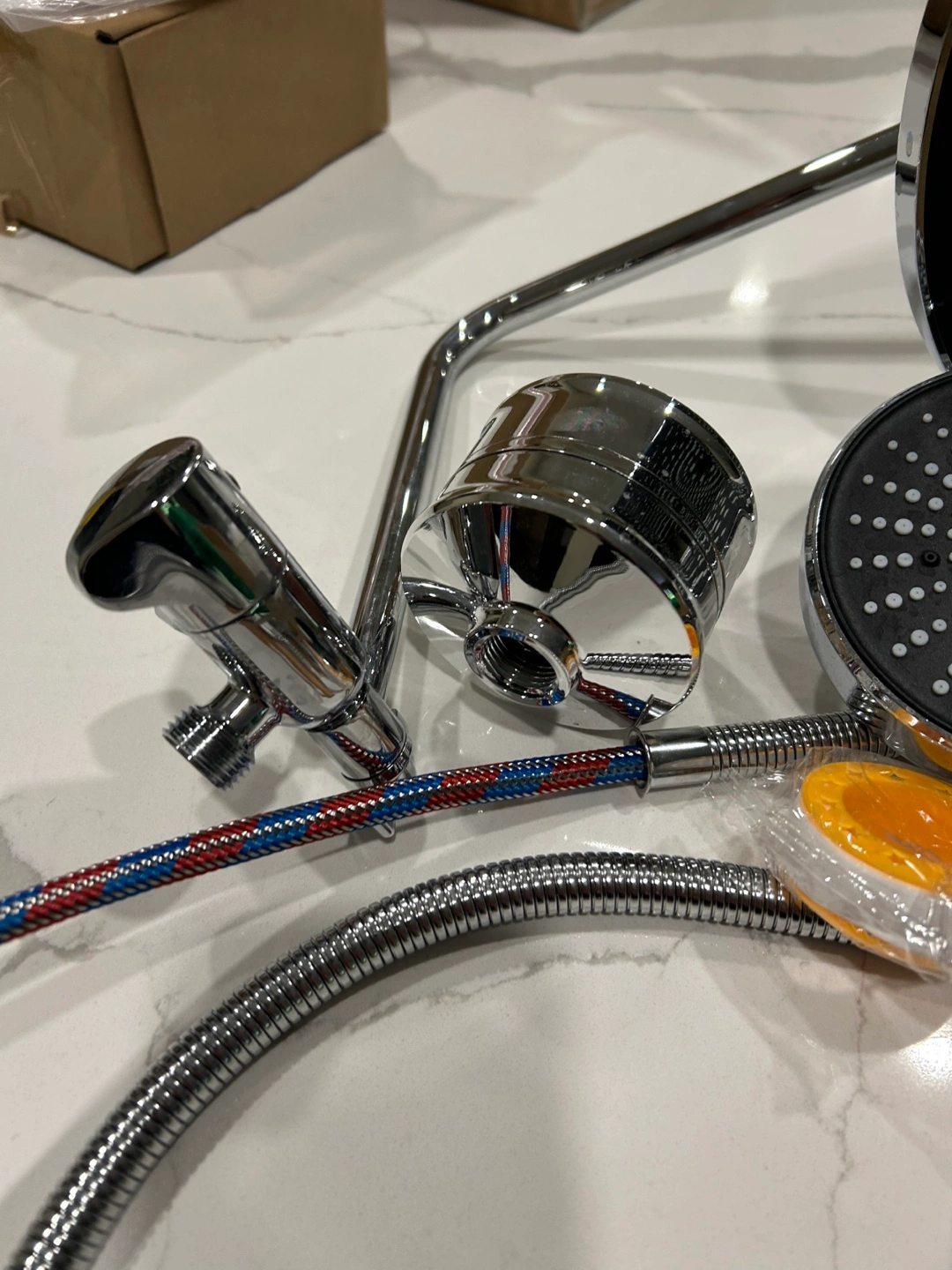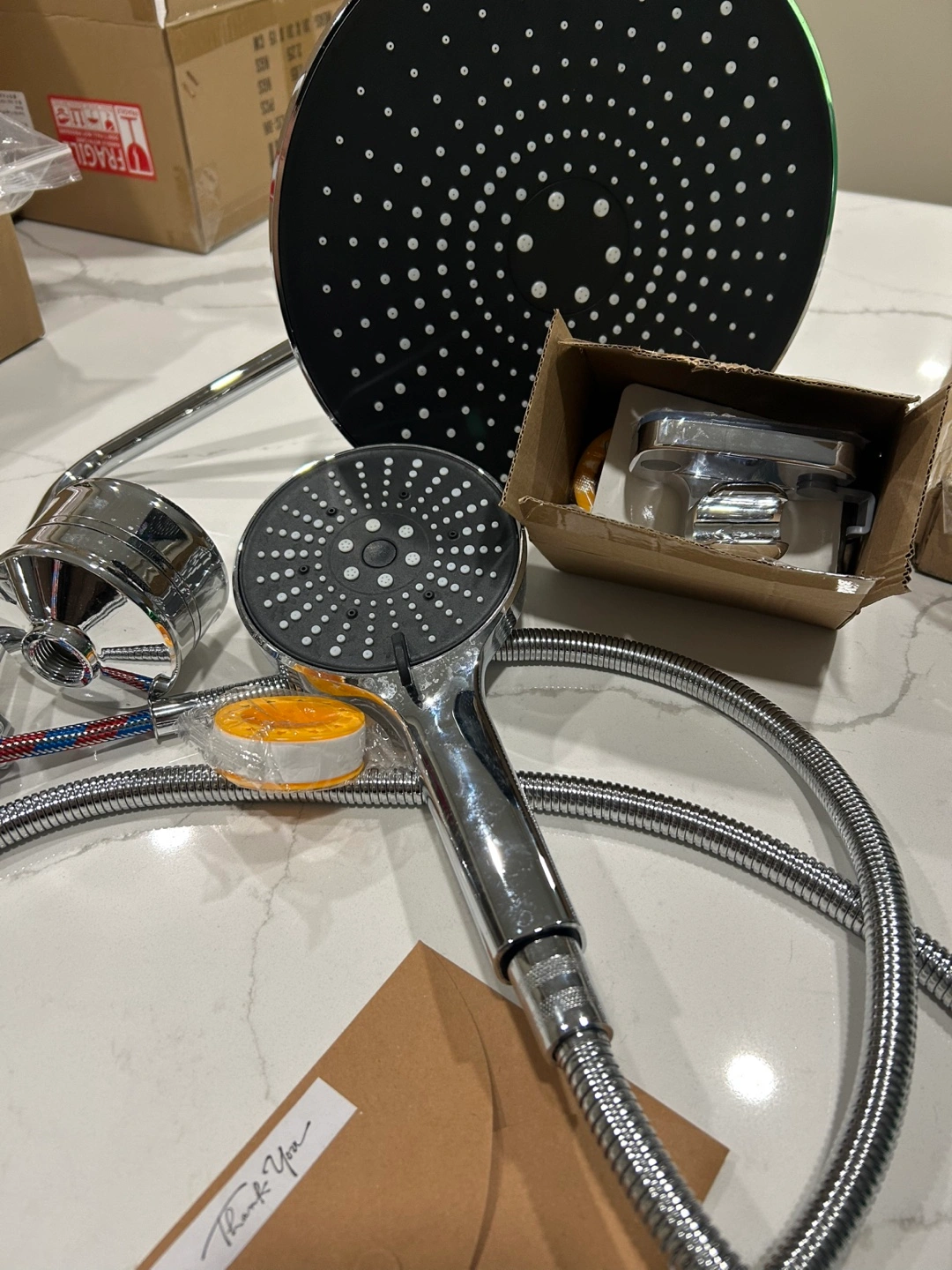 10 inch rainfall shower head and a handheld shower head. Both are black and chrome. There is also a hose, connector, and fittings.