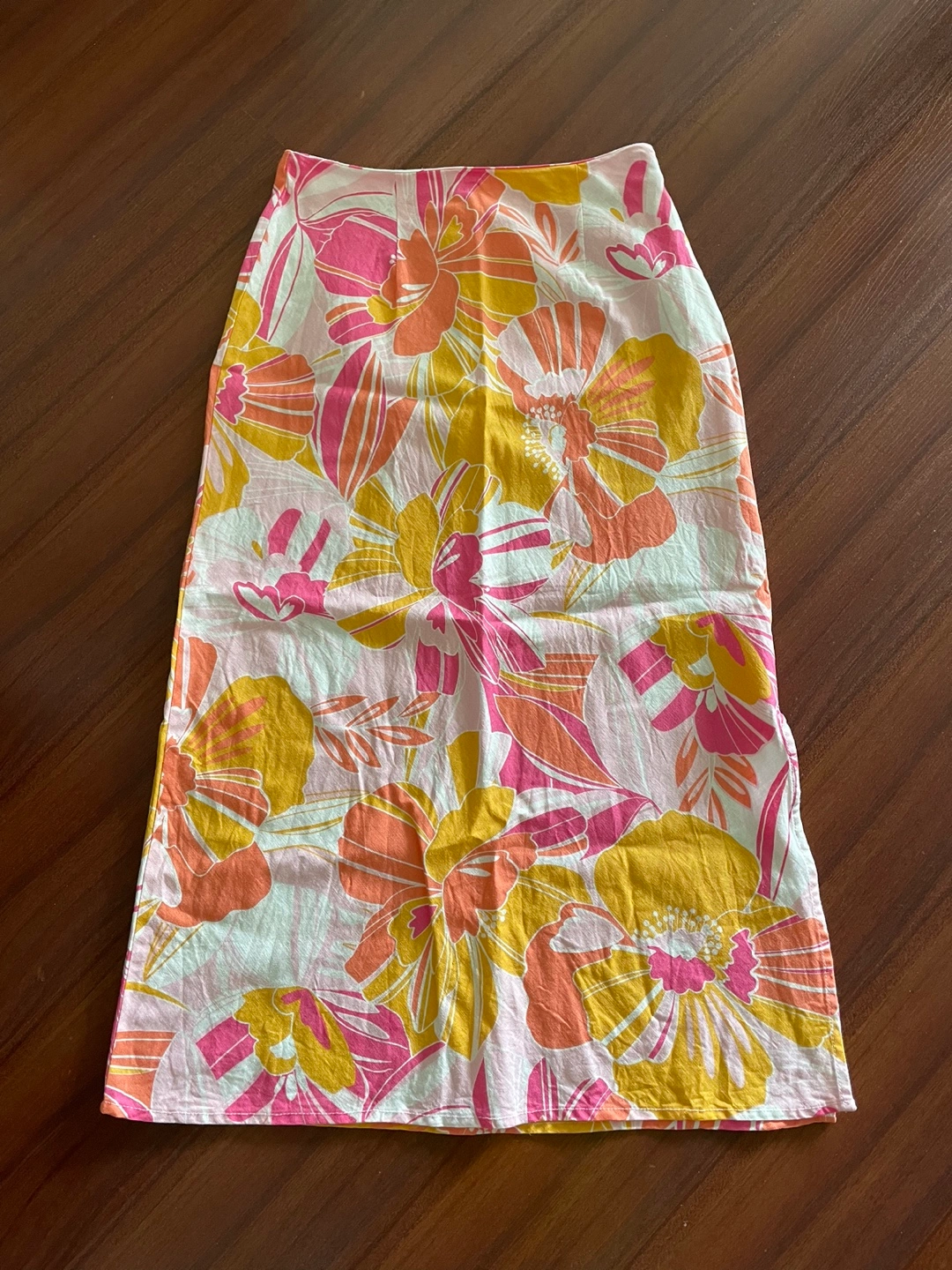 Linen blend floral skirt with slit and side zipper. Perfect to wear this summer on its own or at the beach over your swimsuit. Brand new and washed but never worn.