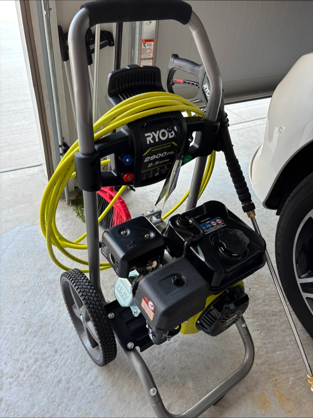 Highlights • 2900 PSI 2.5 GPM for heavy duty residential cleaning • Powerful 212cc horizontal engine with large capacity fuel tank for longer runtime • Ideal for use on fencing, decking, siding, sidewalks, driveways and other outdoor applications • 2.5 GPM provides more efficient and effective cleaning compared to a lower GPM • Metal spray wand with ¼" quick-connect nozzle coupler for increased durability and convenient nozzle changes • Easily transport with durable hand truck frame and 12" flat-free wheels • Convenient on-board nozzle, hose, wand and cord storage • Versatile cleaning with 4 included nozzles (0°, 25°, 40°, & Soap) • Apply detergent by pulling from a soap bottle with the included siphon hose • 25' non-marring high pressure hose A pressure washer with a yellow hose. The item is on wheels. A handle is present on top of the unit. It would be great to use this item for a thorough cleaning session in the sun.