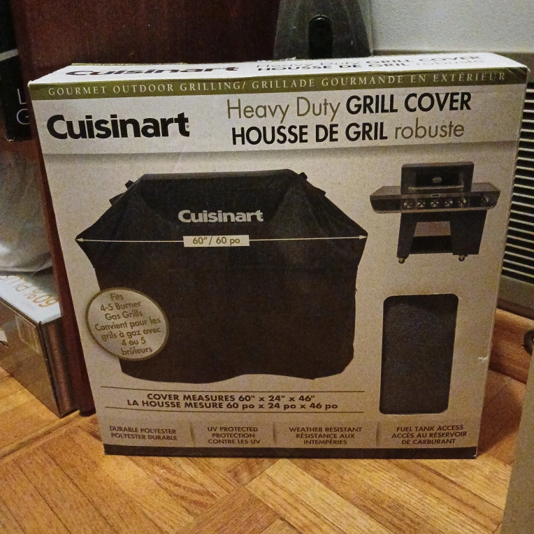 New in box! A heavy-duty bbq grill cover, designed for protection. Fits 4-5 burner gas grills up to 60" length. Features weather resistance and UV protection. Covering your grill can bring you a sense of peace, knowing it is safe from the elements. Dark grey. Smoke-Free home! PICK UP ONLY AT KEELE AND FINCH