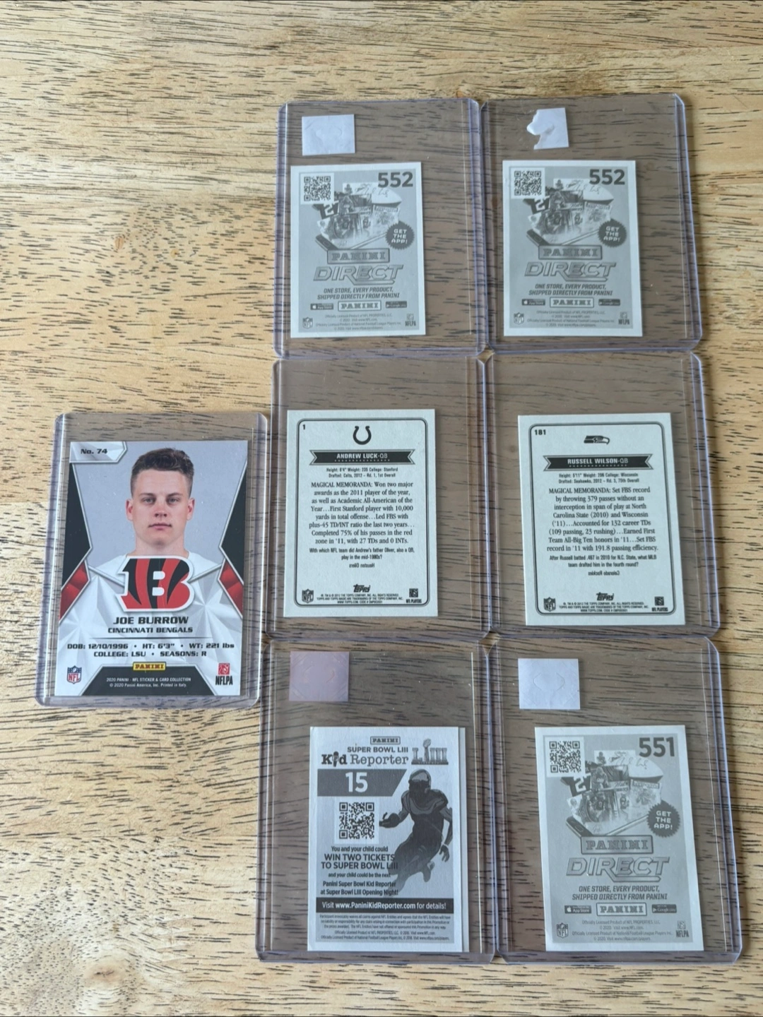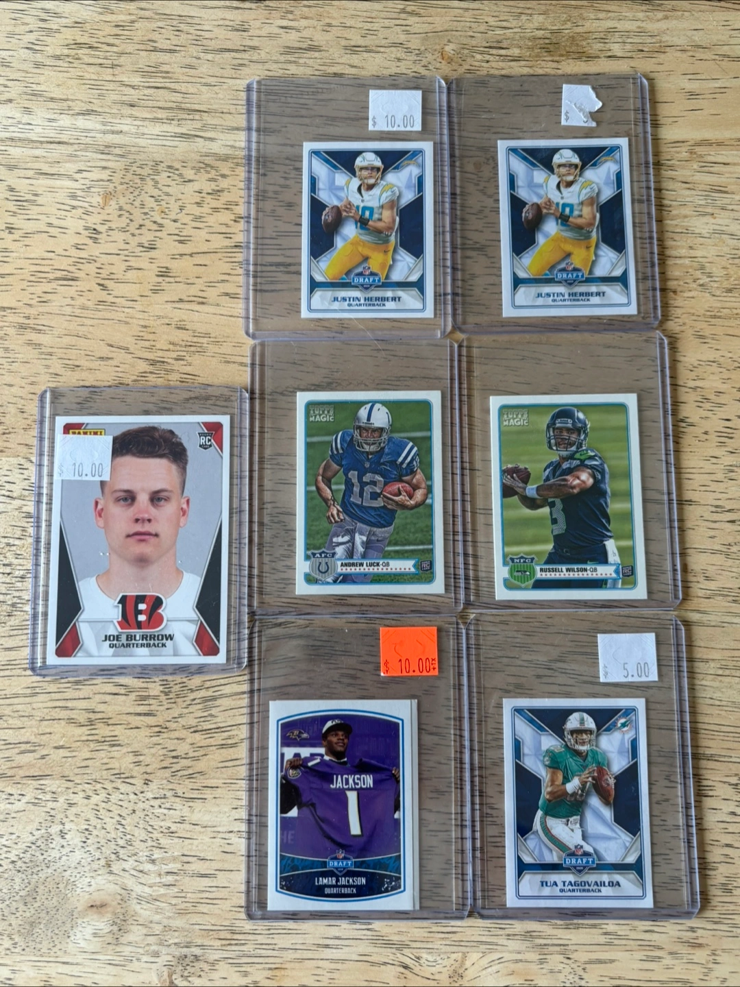 A variety of NFL football trading cards. Each card is encased in a plastic holder for protection. These cards would be a great addition to any football fan's collection, allowing them to reflect on memorable moments or players with a touch of nostalgia. **All for 60** - includes: panini sticker & card collection: Joe burrow rookie, NFL Draft Lamar Jackson Rookie, Tua Tagovailoa Rookie, Justin Herbert Rookie - includes: Topps Magic rookies: Russell Wilson & Andrew Luck - message for inquires - all cards some sleeved and top loaded - located at dufferin and Lawrence