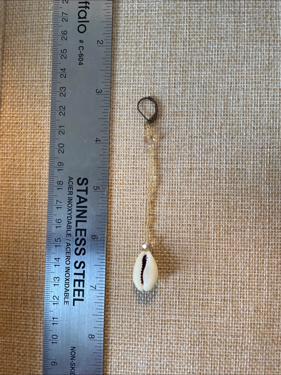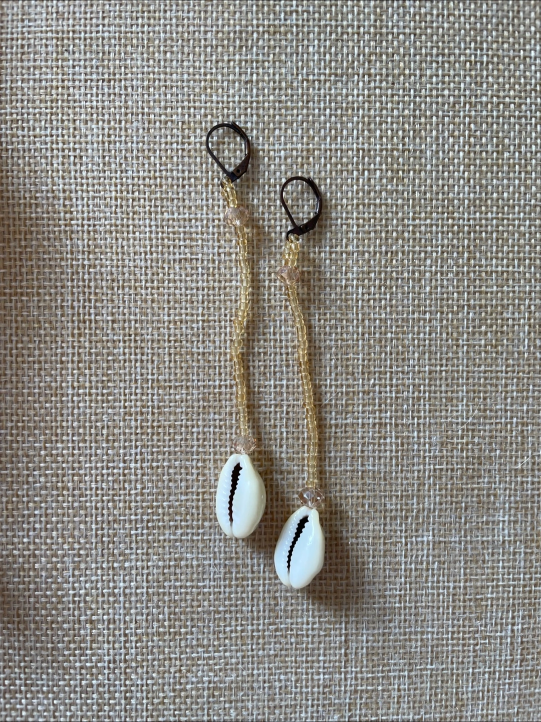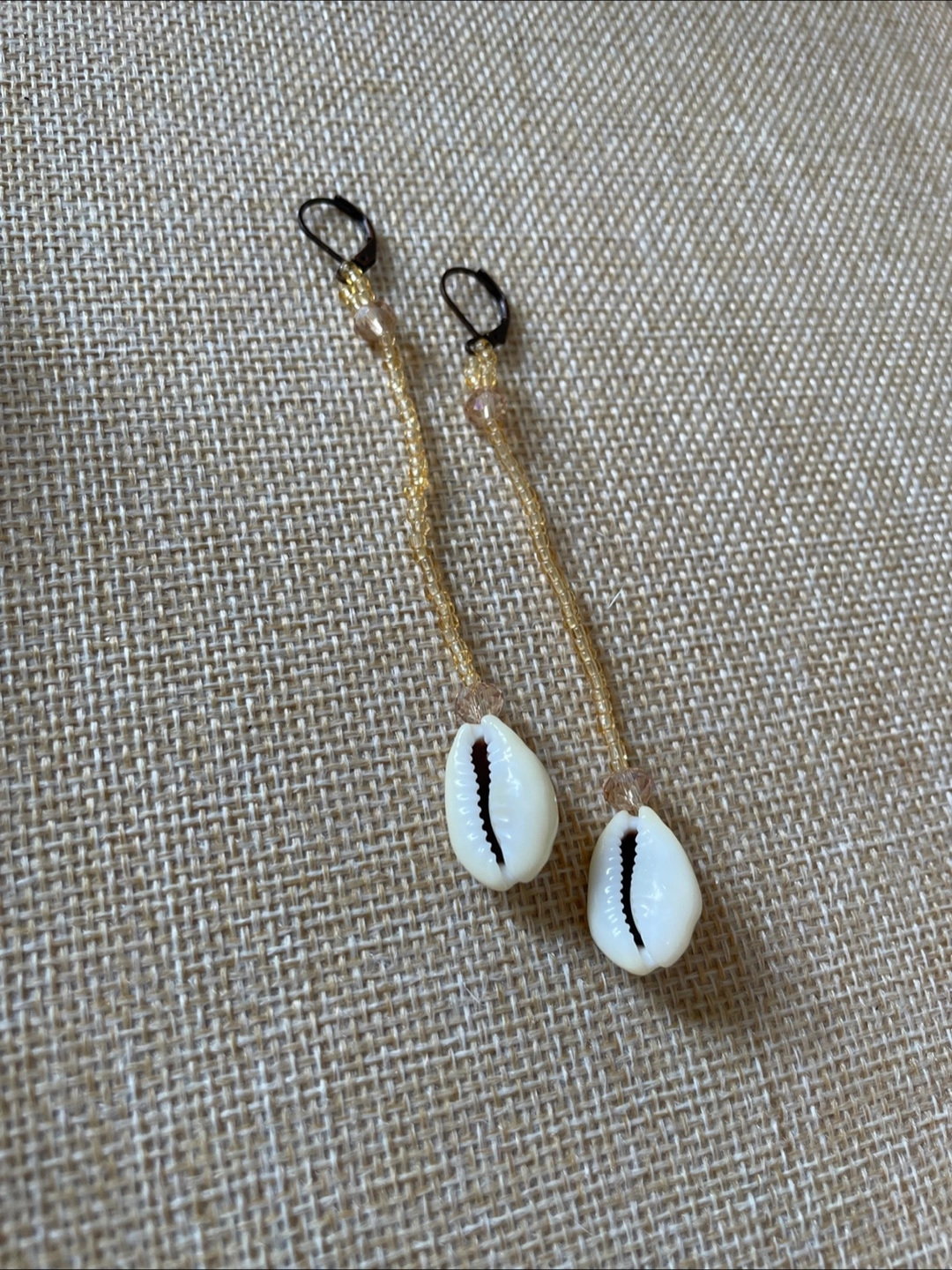 Beautiful dangle earrings. Featuring cowrie shells. Suspended from beaded gold chains. These unique earrings are lovely for a relaxed outing, helping you find your calm.