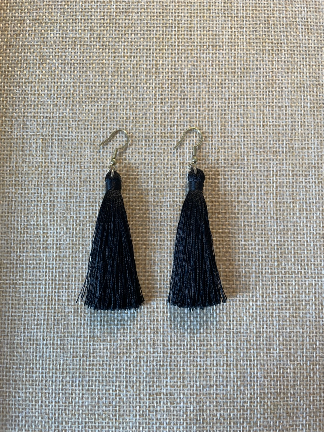 A charming pair of black tassel earrings. Perfect for any occasion, from a casual day out to a formal event. Lightweight.