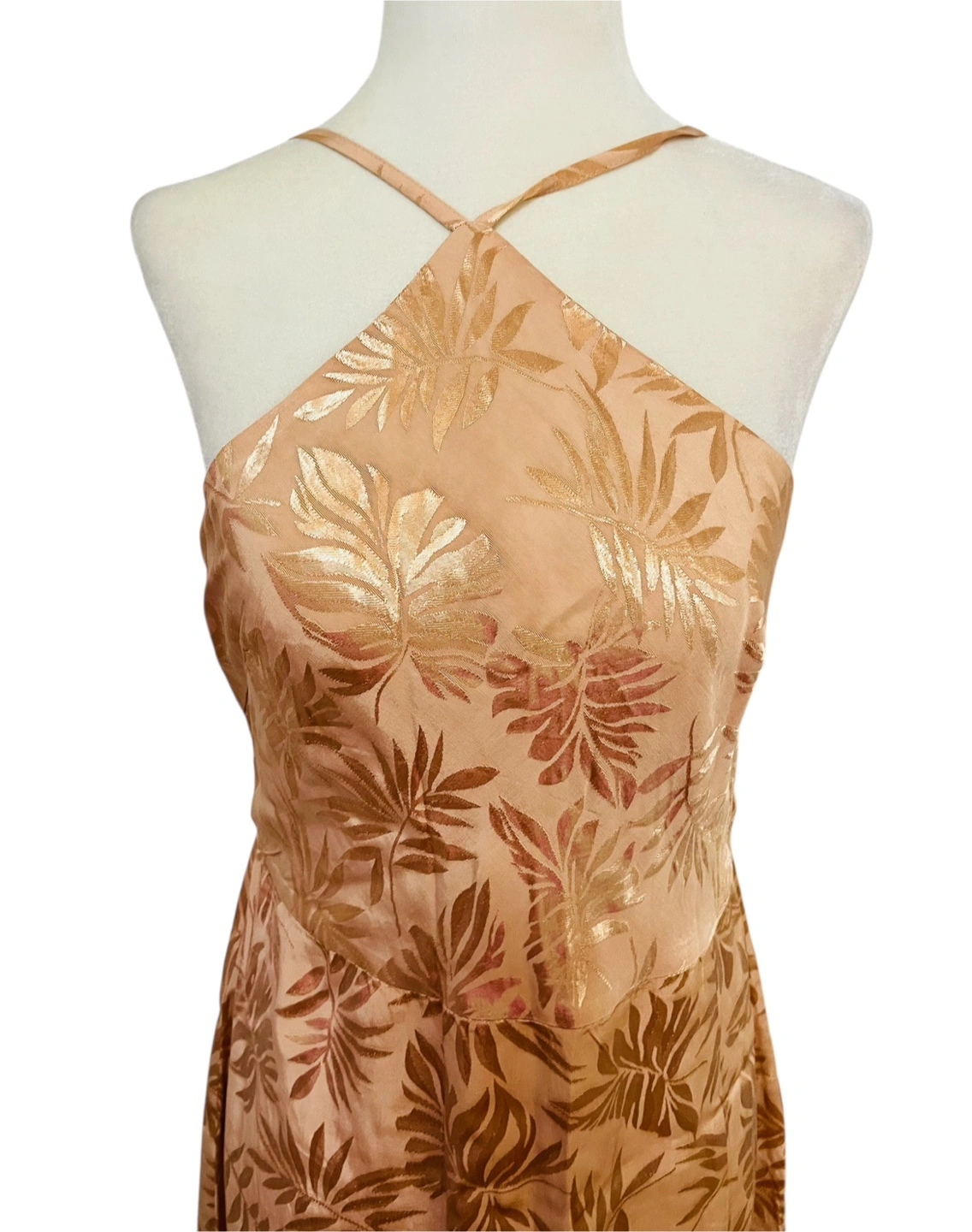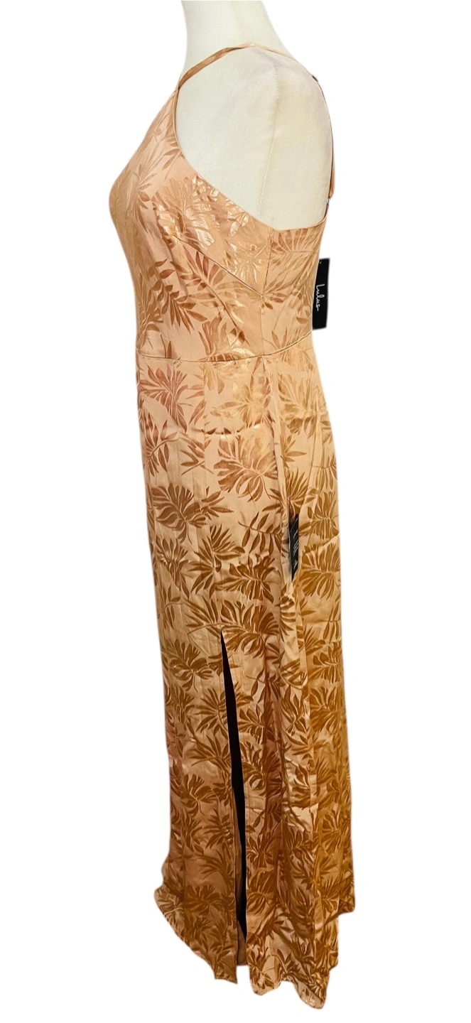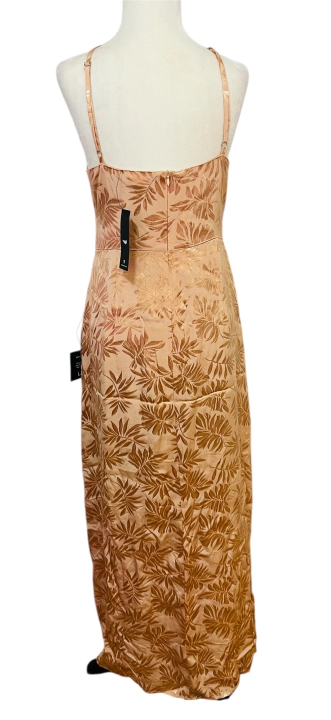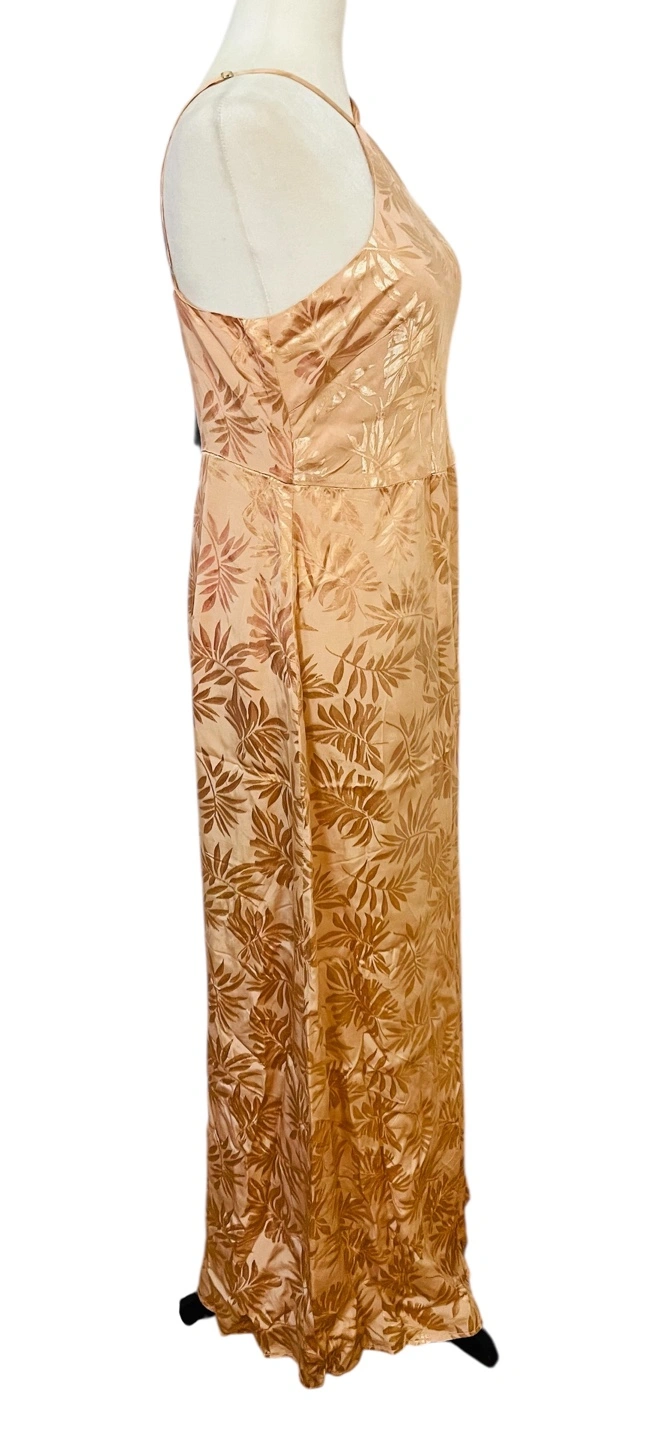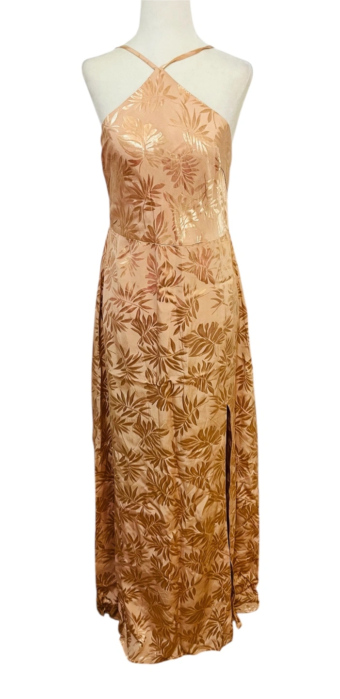 A vision of tropical elegance, this Lulus maxi dress is a stunning choice for your next special occasion. The halter neckline and criss-cross back straps add a touch of allure, while the flowing silhouette and side slit create a graceful and flattering look. The dress features a beautiful floral print in a shimmering gold tone, perfect for making a statement. Imagine yourself twirling on the dance floor at a summer wedding, sipping cocktails at a garden party, or enjoying a romantic evening out in this gorgeous gown. Style: Maxi Dress Length: Long Color: Beige Department: Women Sleeve Length: Sleeveless Pattern: Floral Occasion: Party/Cocktail, Wedding, Formal Material: Polyester Neckline: Halter Fabric Type: Satin Character: Tropical, Summer, Party Girl, Goddess, Bohemian Season: Summer, Spring Sleeve Type: Strappy Sleeve New with tags Length 52” Pit to pit 15” Waist laying flat 14.5” PU Ottawa & Strasburg, Kitchener Keywords: Lulus dress, maxi dress, halter dress, floral dress, tropical print, occasion dress, gown, formal dress, party dress, wedding guest dress, summer dress, slit dress, gold dress, beige dress