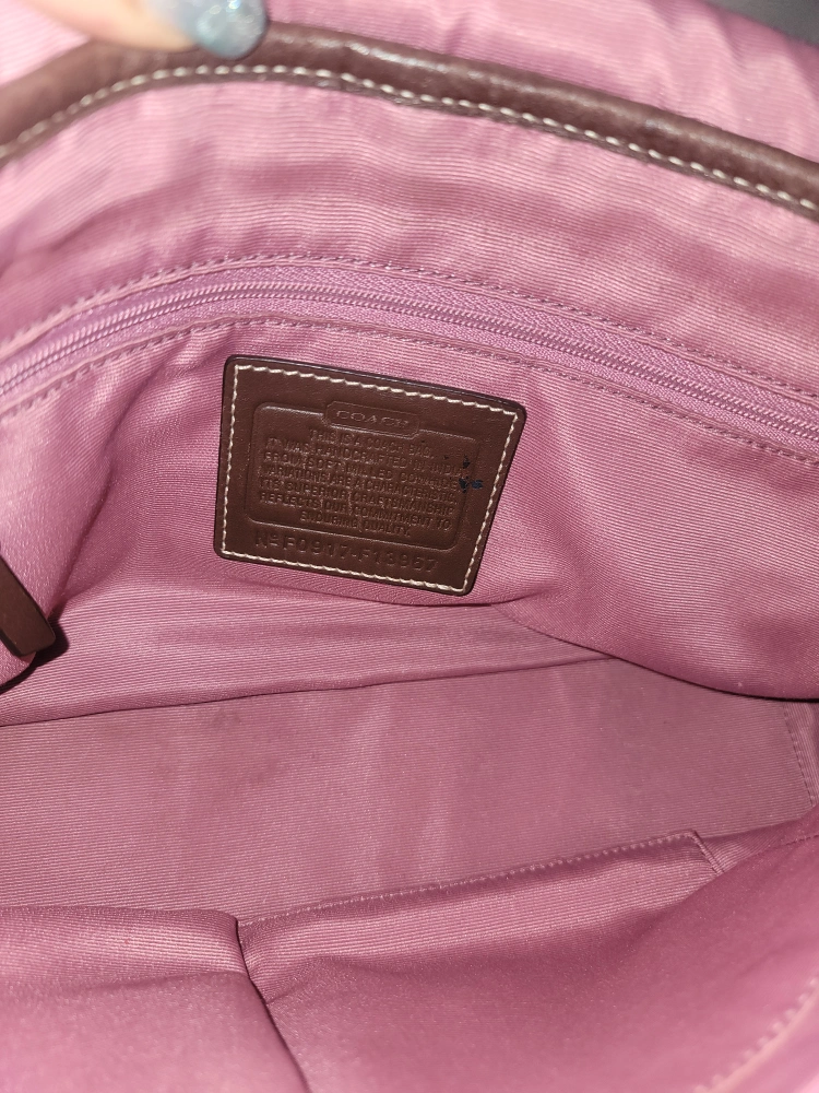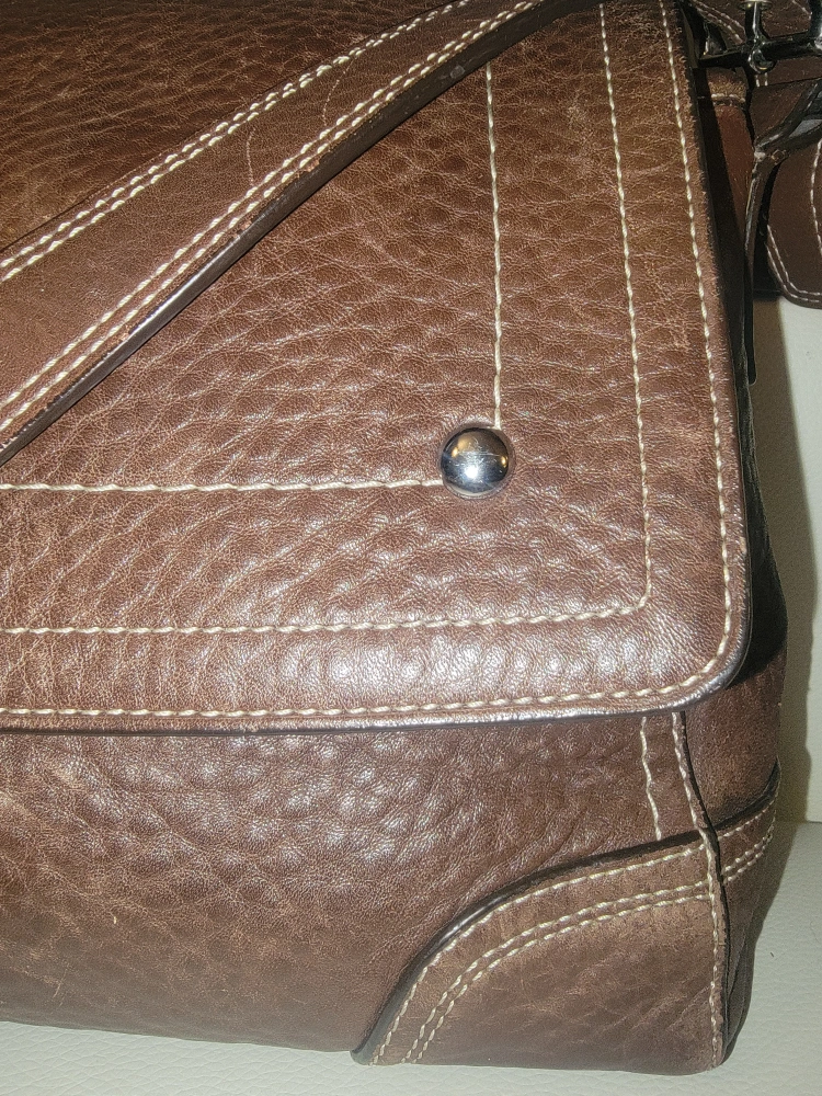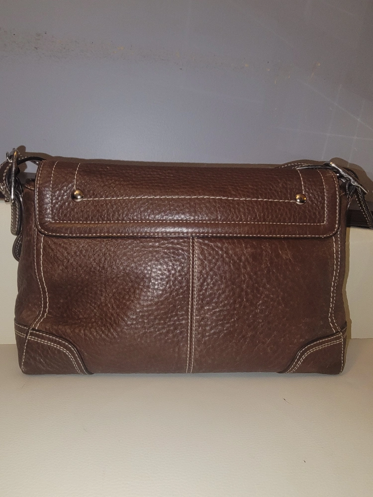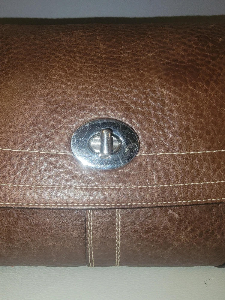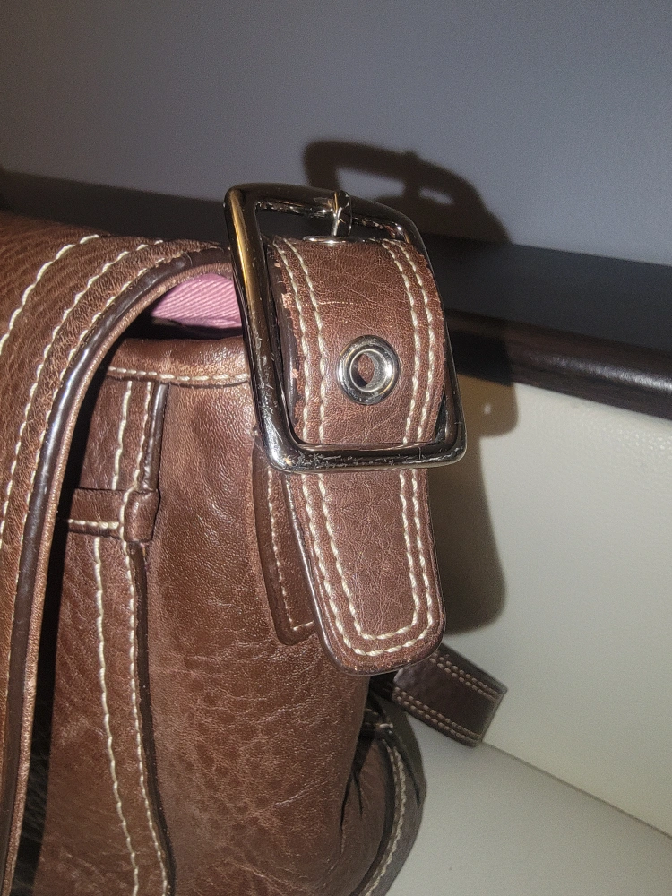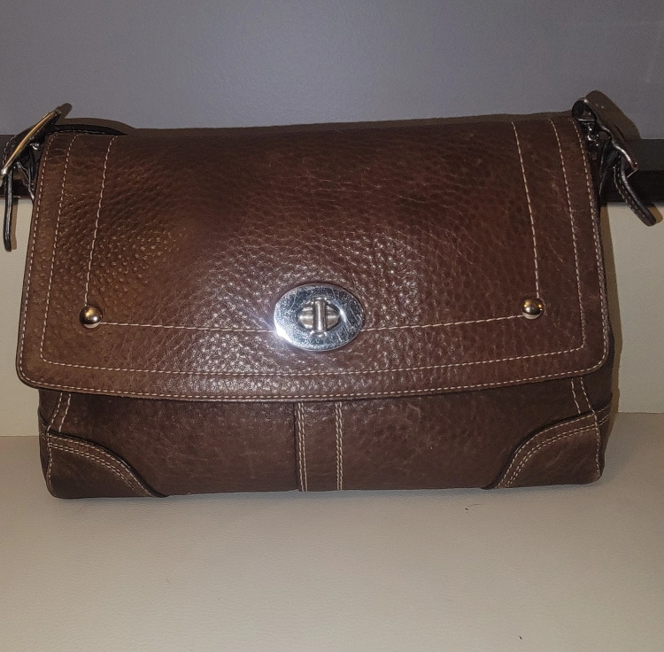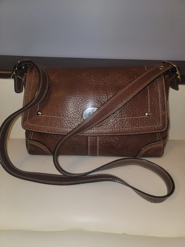 Coach crossbody bag. Featuring a brown leather material. White stitching accents the edges. A silver buckle on the strap. A great way to carry your essentials in style.