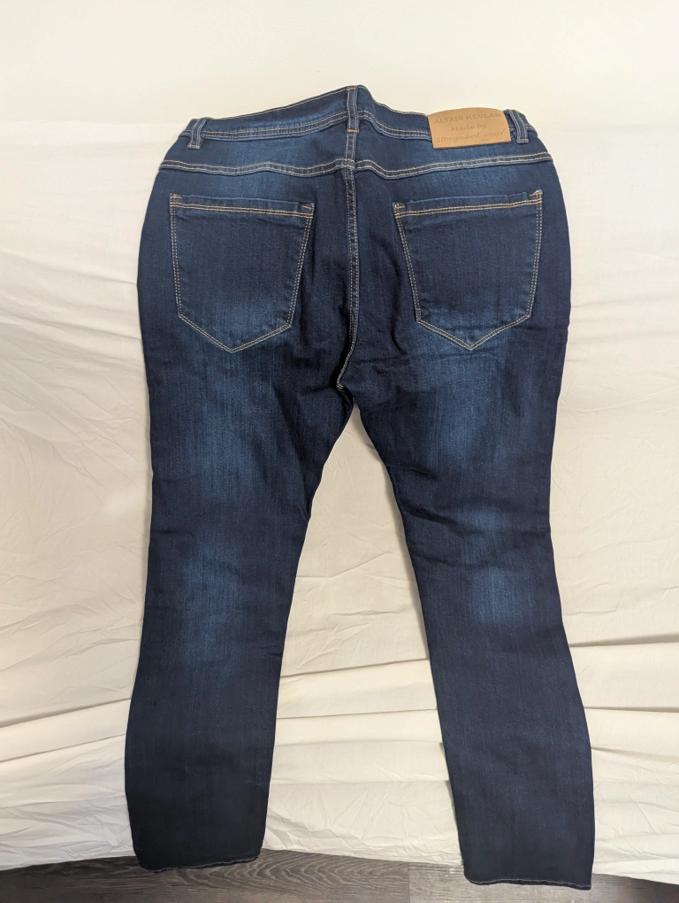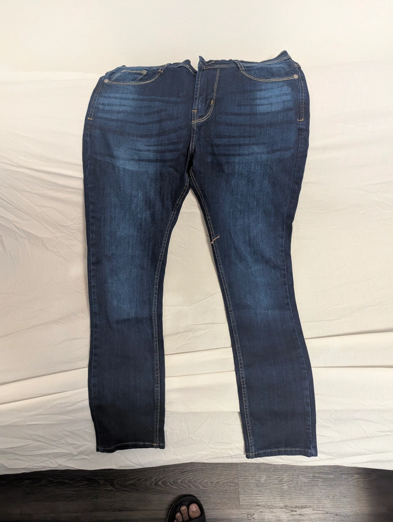 Denim jeans in a dark wash. Features a button and zipper closure. They are a classic style of jeans that you can wear for many different occasions.