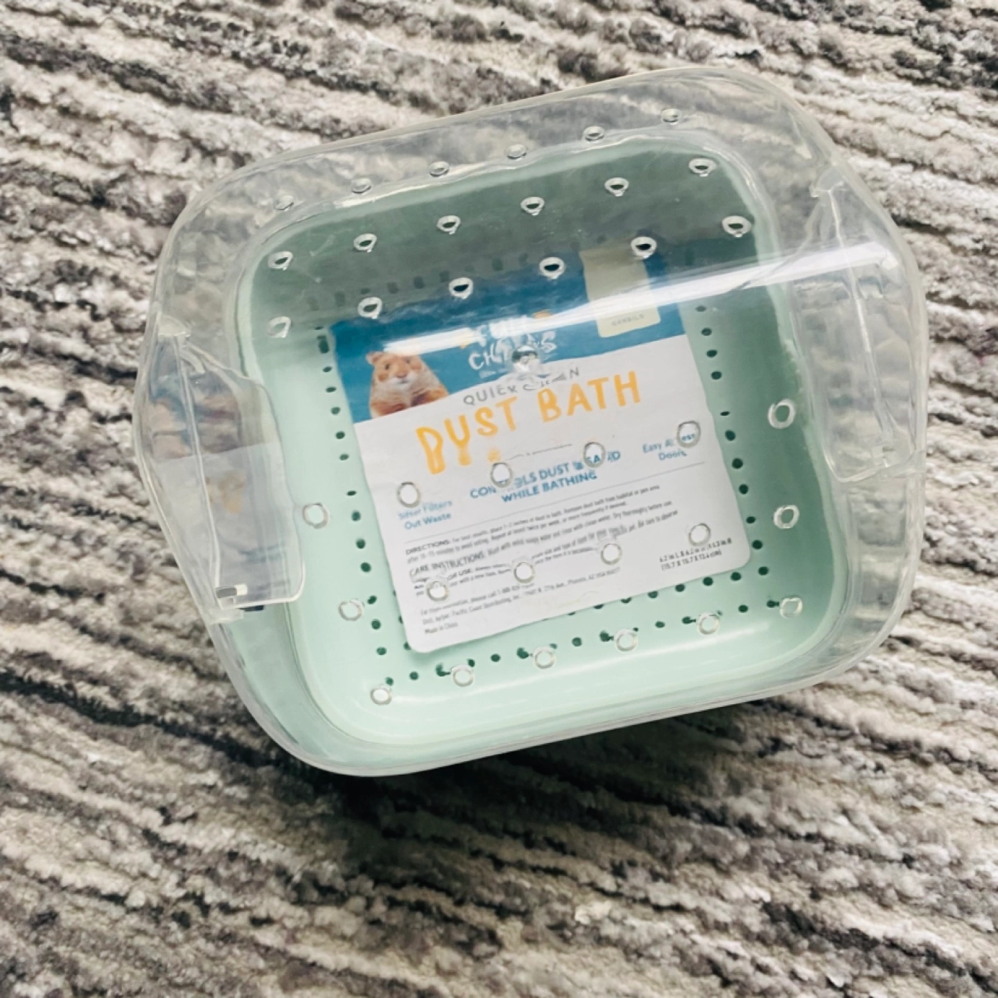 Clear plastic and light green bin. Features a clear, dome-shaped lid. Offers small ventilation holes. Designed for sand bathing. Retails for $11.99+tax at PetSmart. Hammy didn’t end up needing this one. It’s basically unused. It has been washed, sanitized, and safely stored, and ready for your hamster to enjoy 😊 #smallpets #hamsters #mice #dwarf #syrian #robos