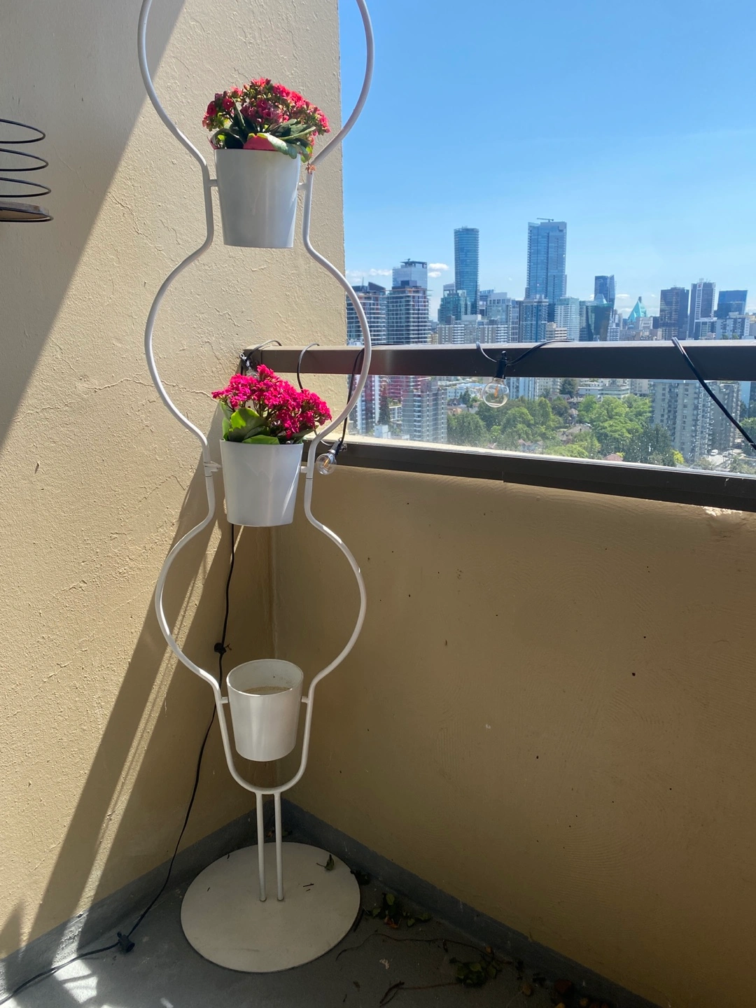 A charming metal plant stand. It features three white planters. The stand is made of a white metal. Perfect for displaying your favourite plants to create a pleasant atmosphere.
