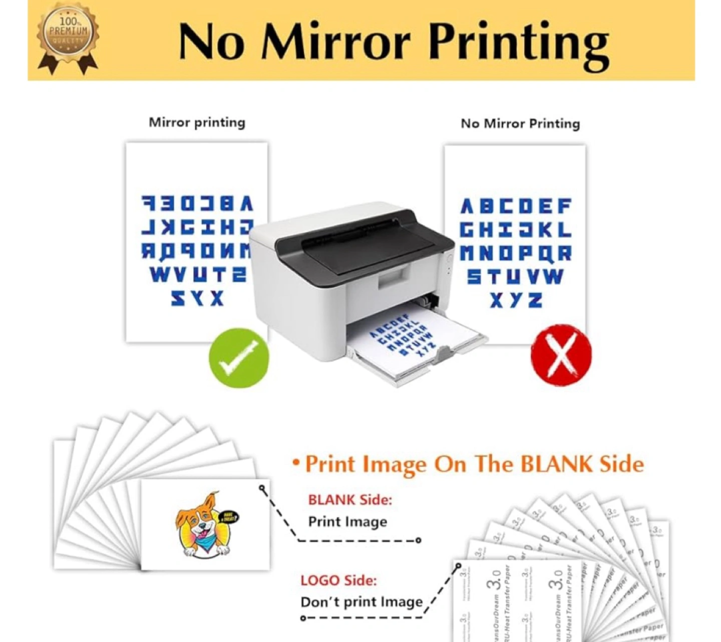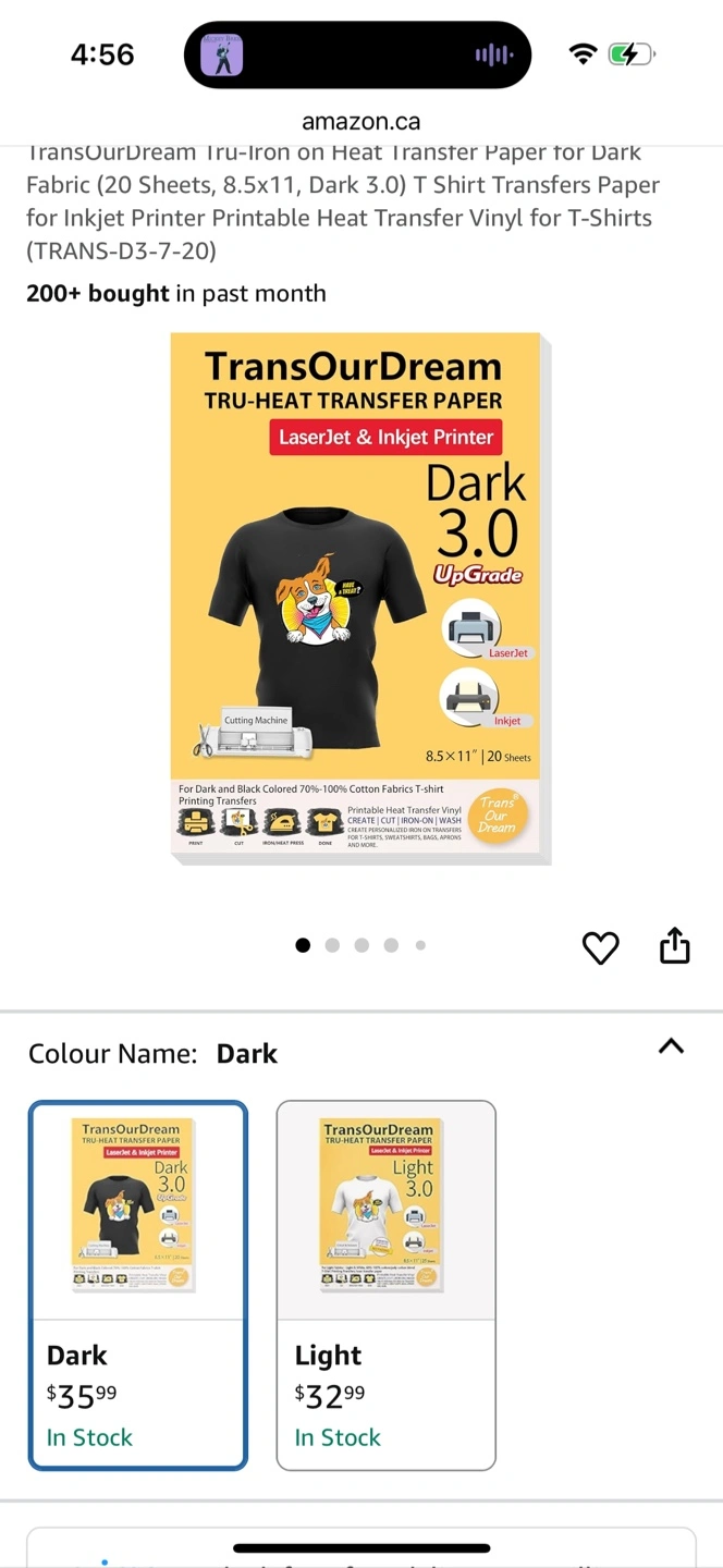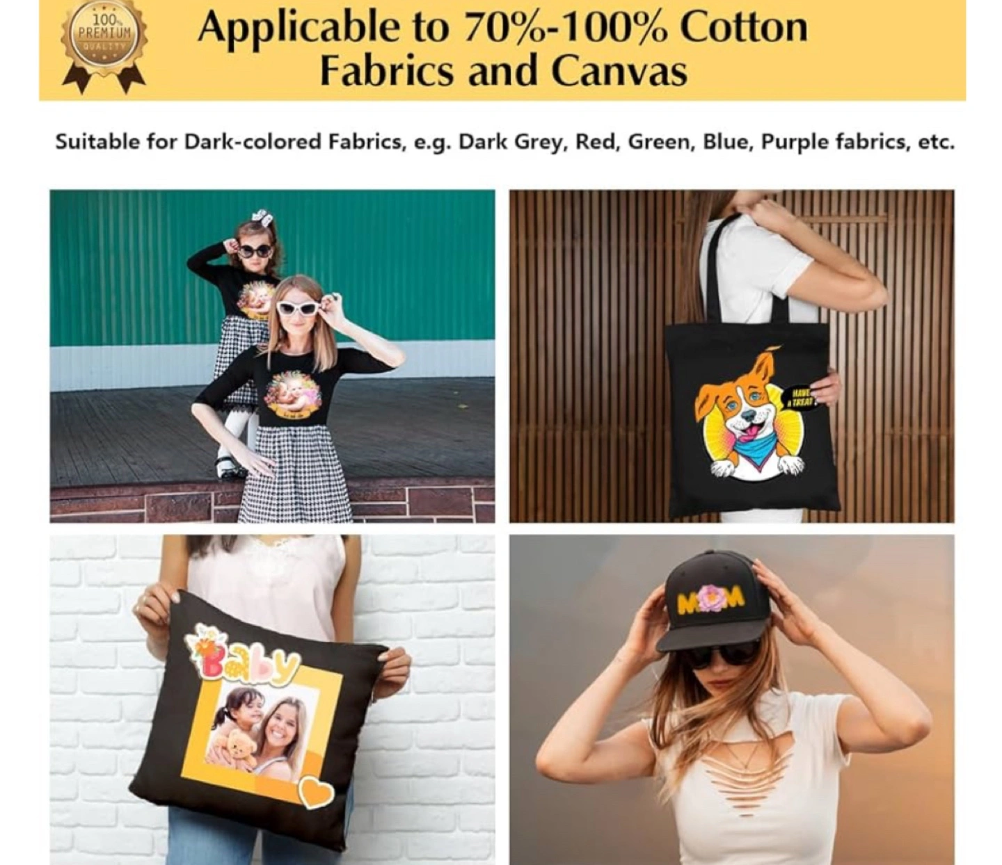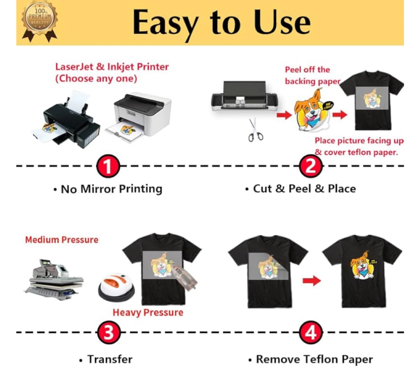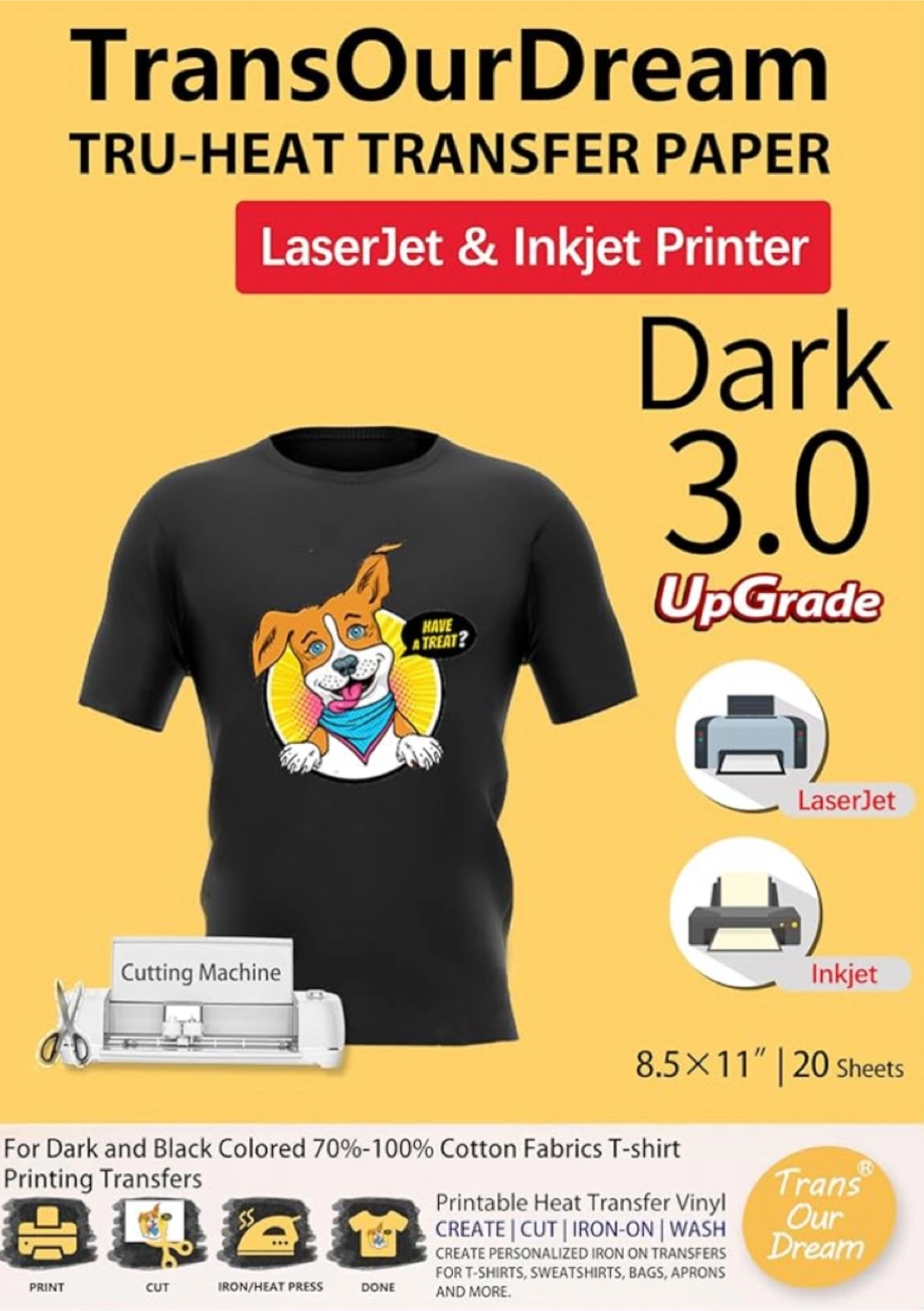 TRU-DARK HEAT TRANSFER PAPER: Compatible with both INKJET & LASER printers, scissors & cutting machine. The printing quality is quite vivid and vibrant. Easy to transfer and use. Machine washable with cold water in Full Cycle mode. No tumble dry. No peeling, no cracking after 30 washes. Pack of 20 Sheets 8.5x11" Dark 3.0 Transfer Paper and 2 Sheets Teflon Paper. Meet up & cash only pls Meet up is in Nobleton