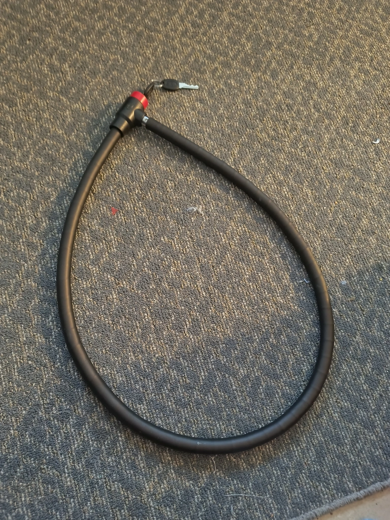 A sturdy bike lock, connected and secure, along with its key. Keeps your bike safe and sound, so you can just relax. The key attaches to the lock in the image.