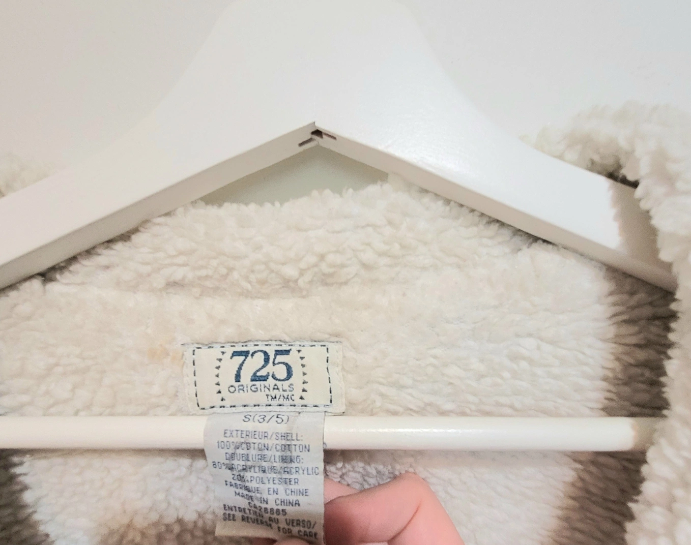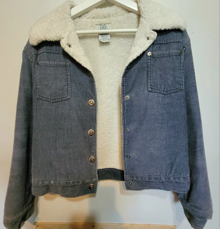 Blue corduroy jacket. Features a soft, fluffy interior lining. Snap closures down the front. Perfect for a chilly evening stroll.