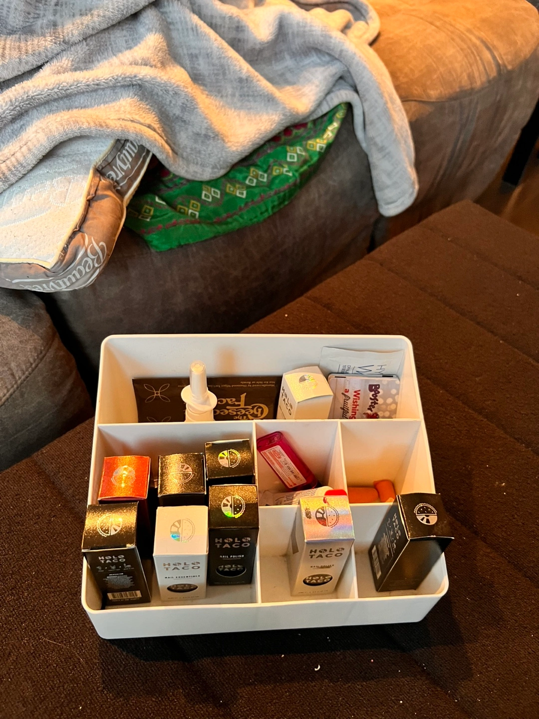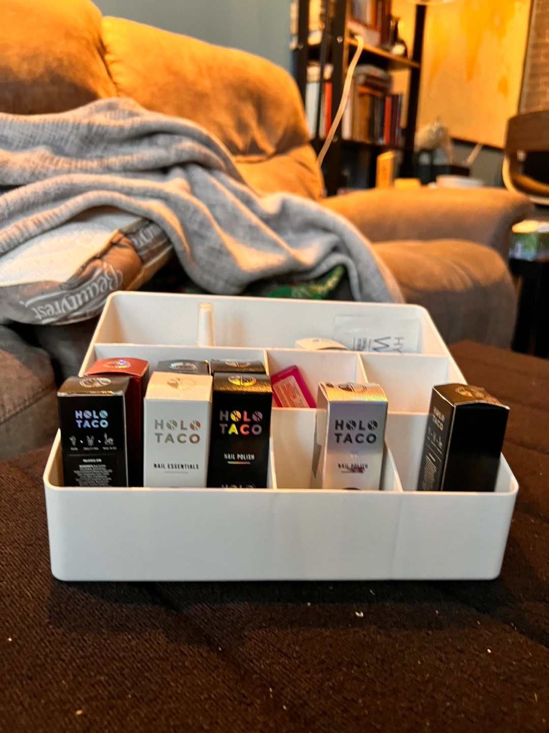 A white organizer. I used it to organize my nail polishes but it can be used to anything. Very good quality/ sturdy plastic organizer
