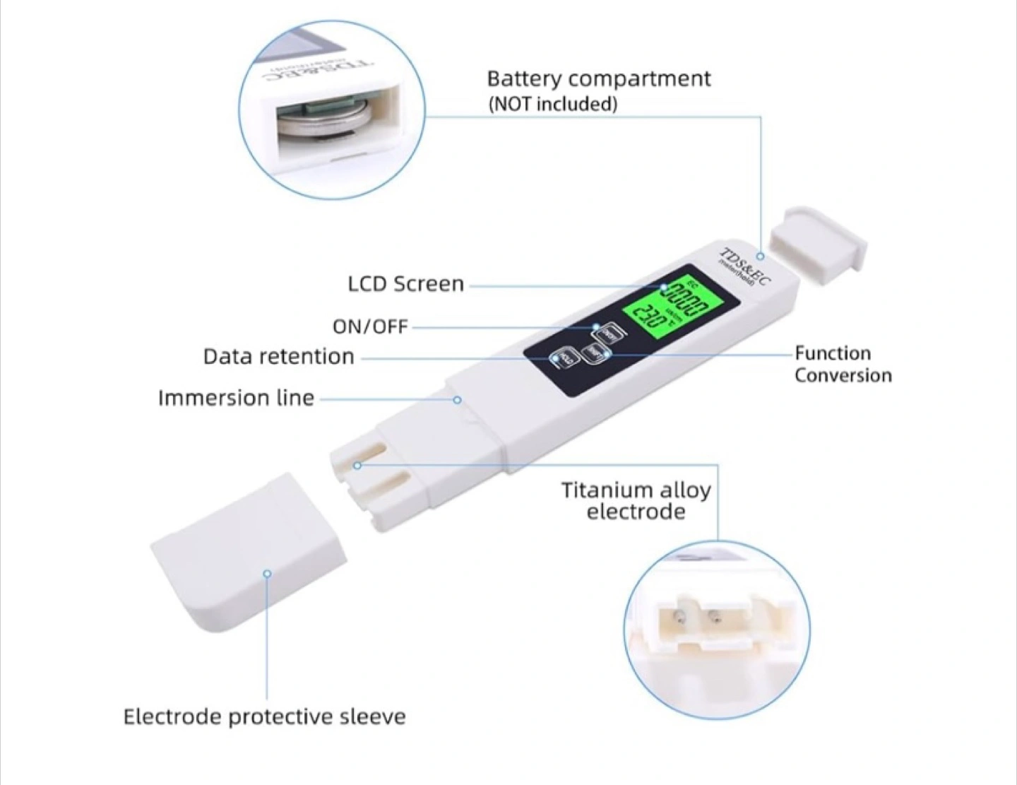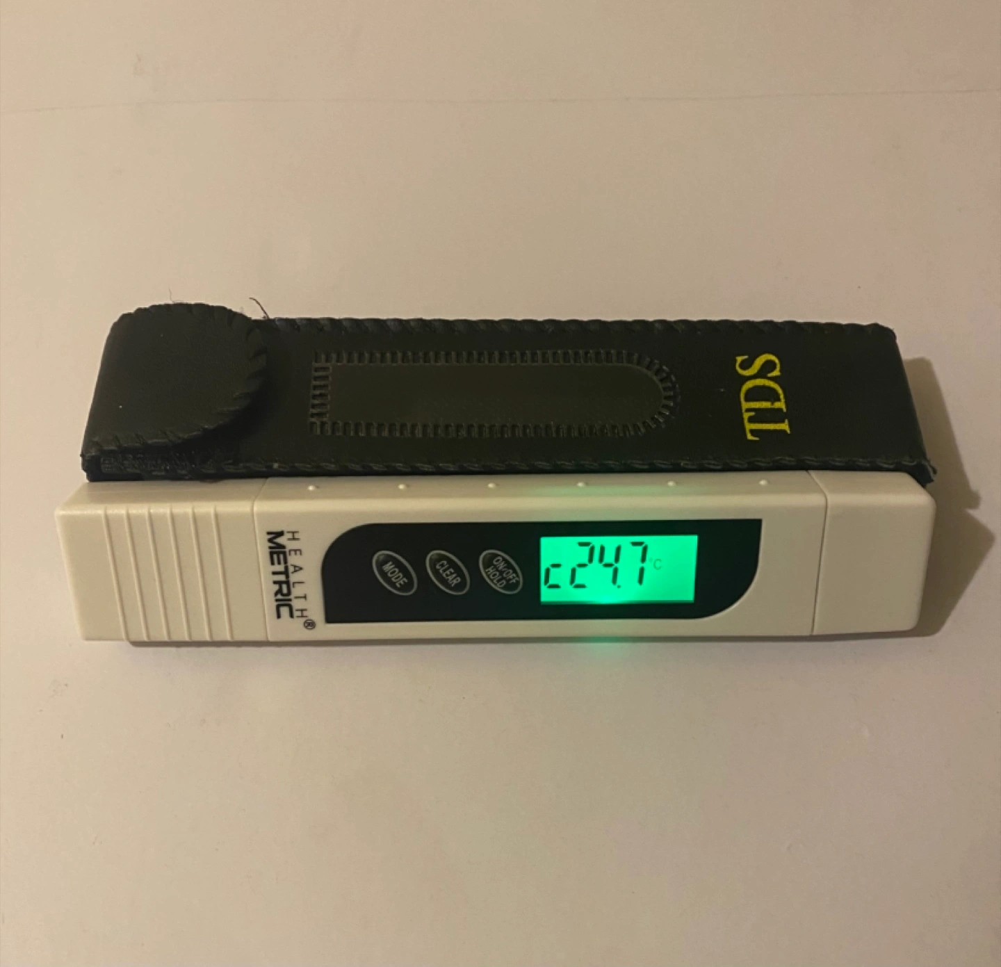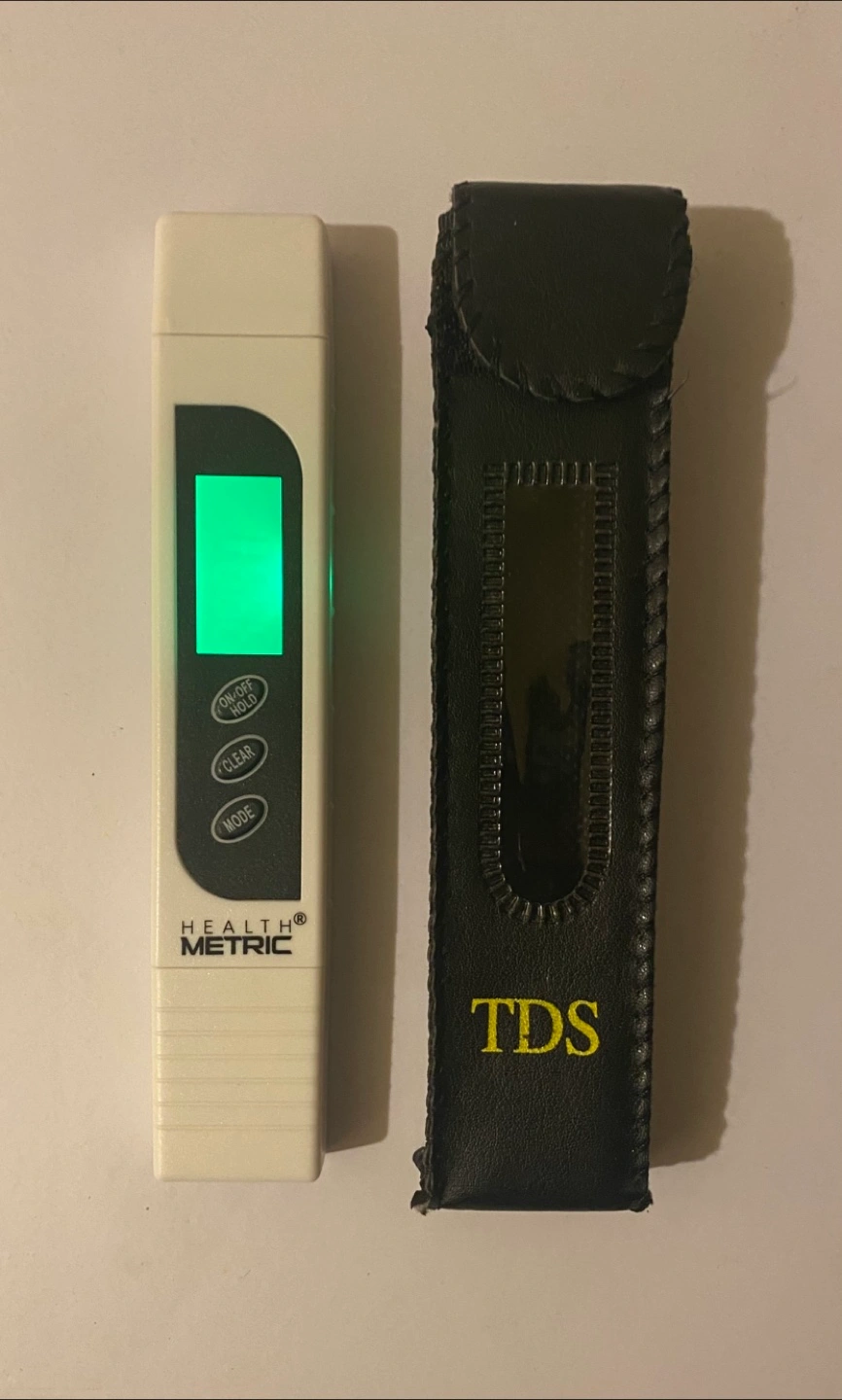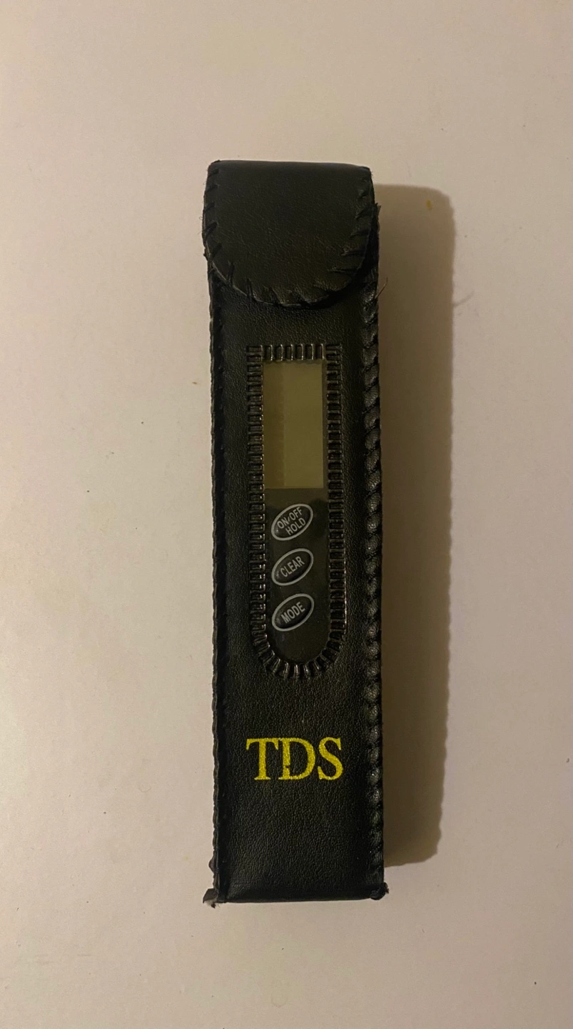 Digital meter. White colour. Comes with a case. LCD screen. Allows you to measure the water quality.