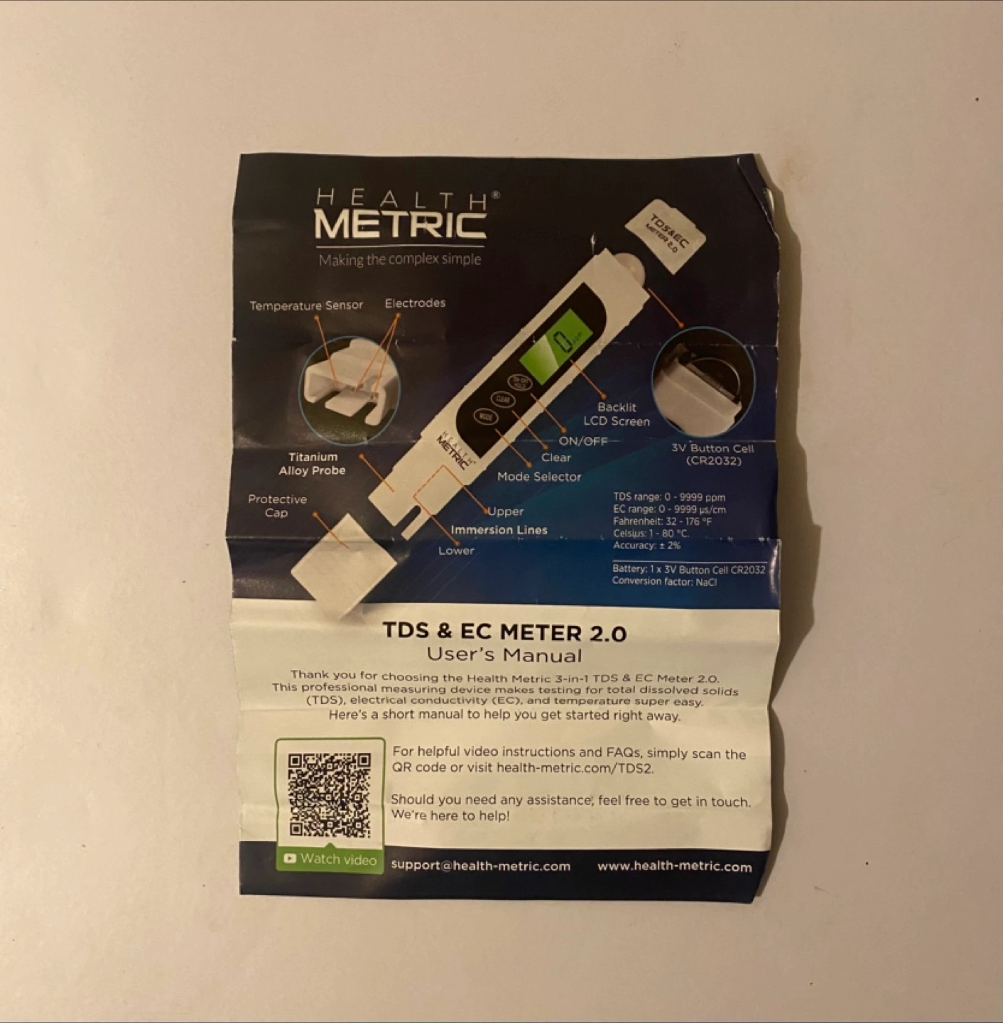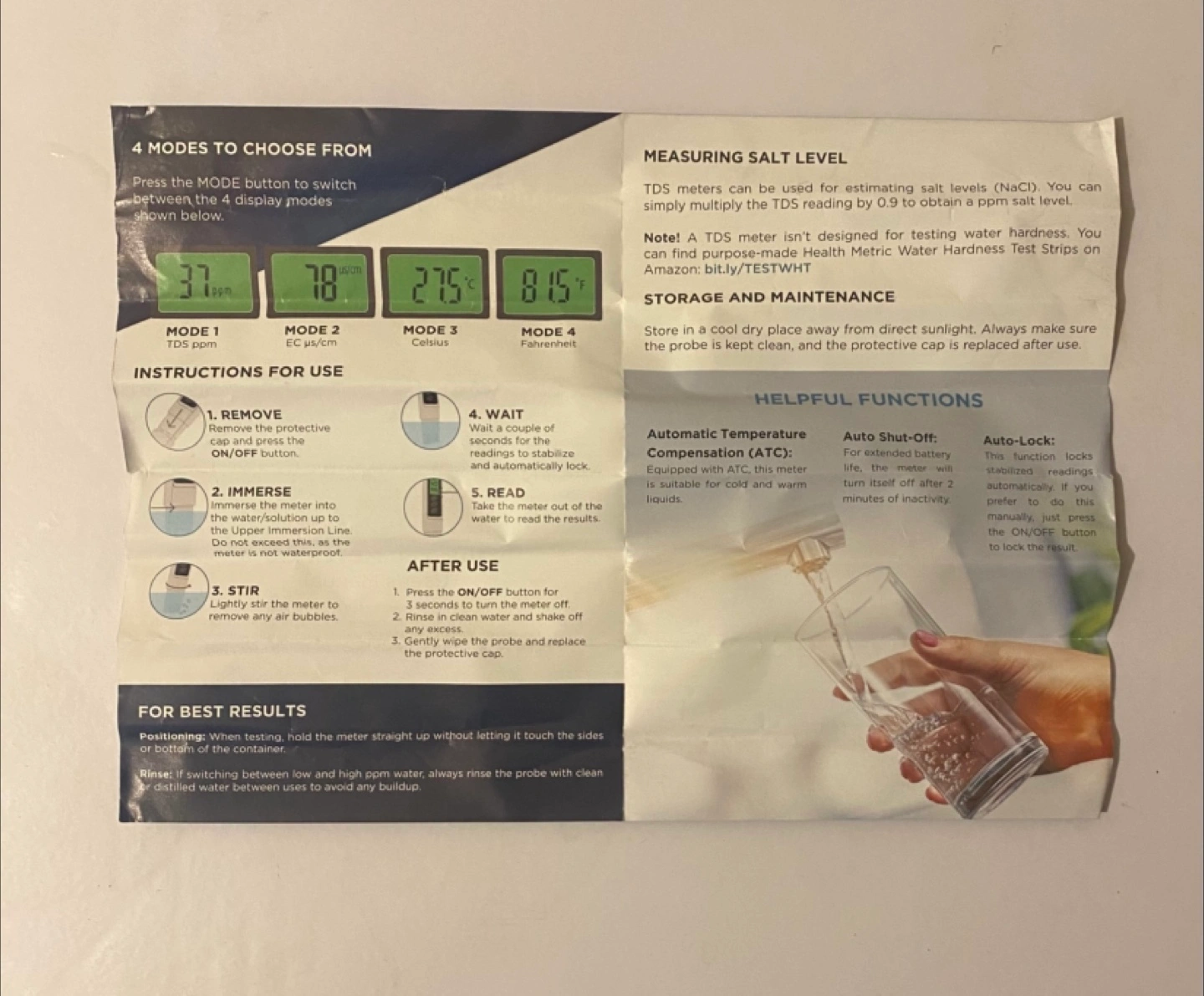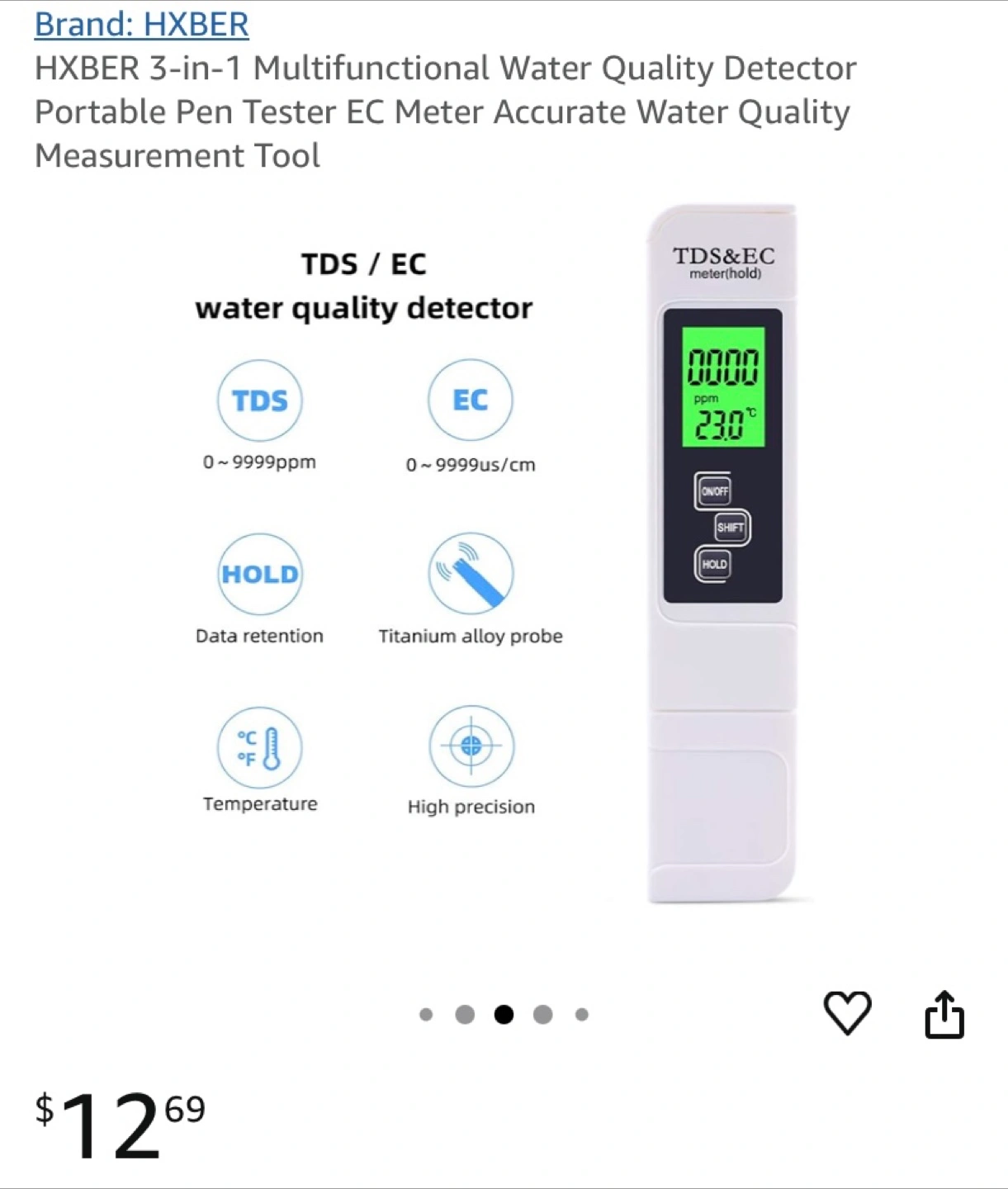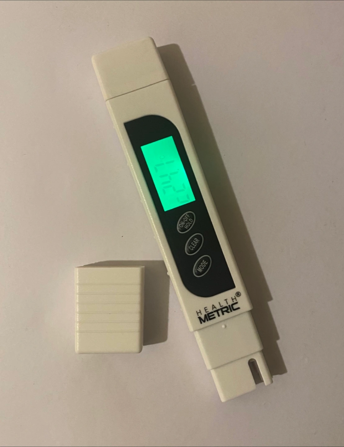 Digital meter. White colour. Comes with a case. LCD screen. Allows you to measure the water quality.