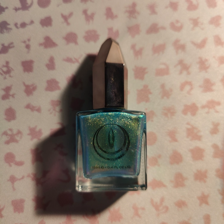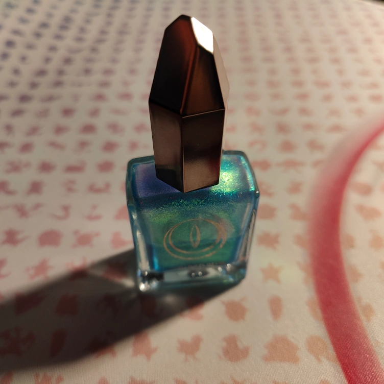 A beautiful shade of nail polish in a glass bottle. The bottle features a unique cap design. Nail polish is half full.