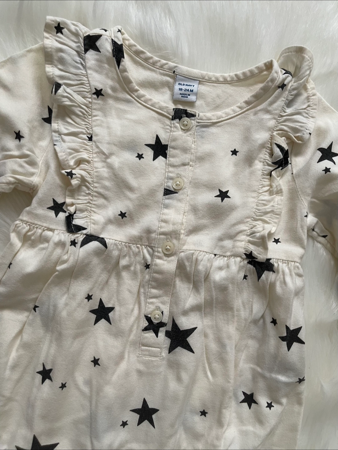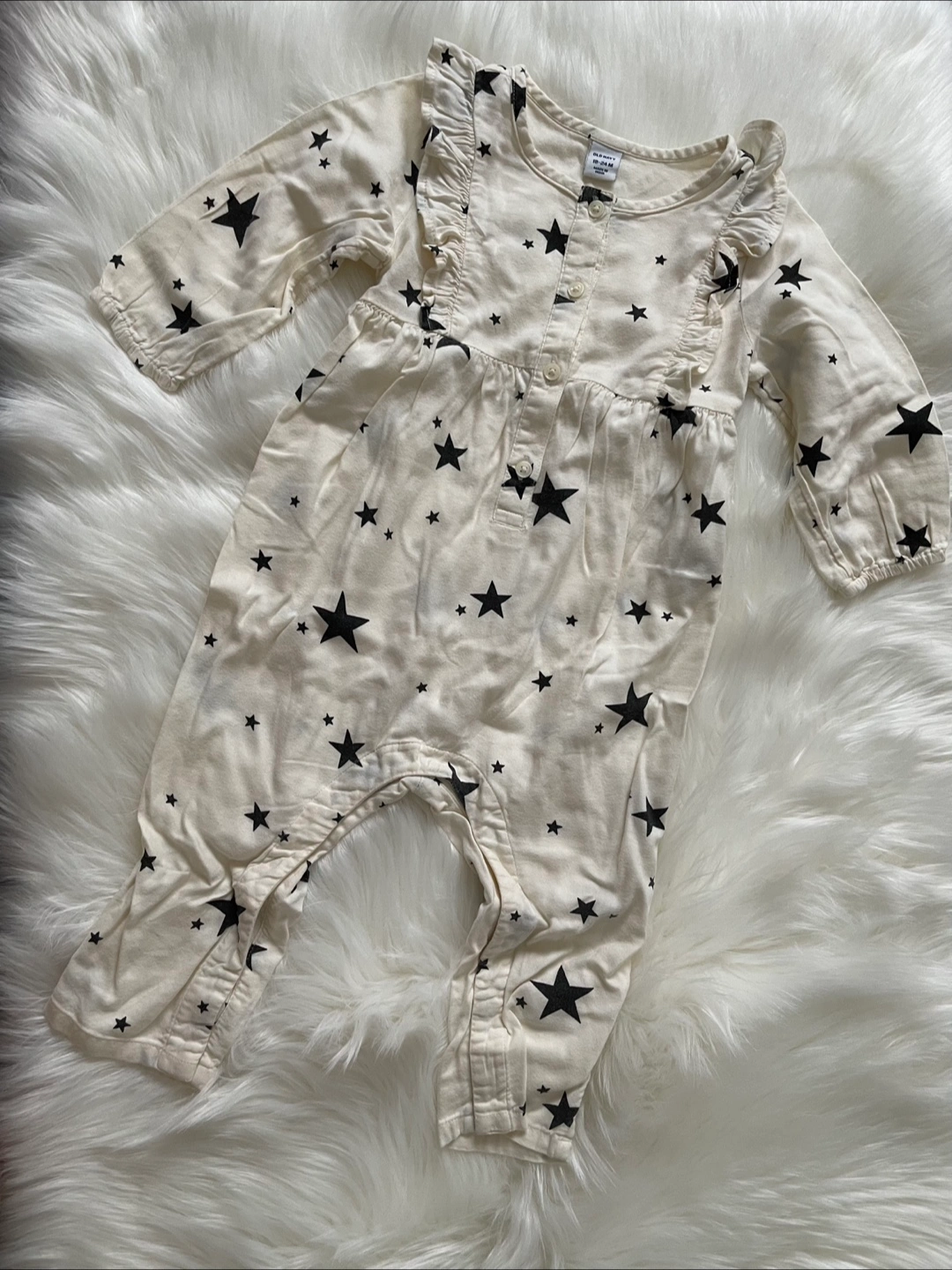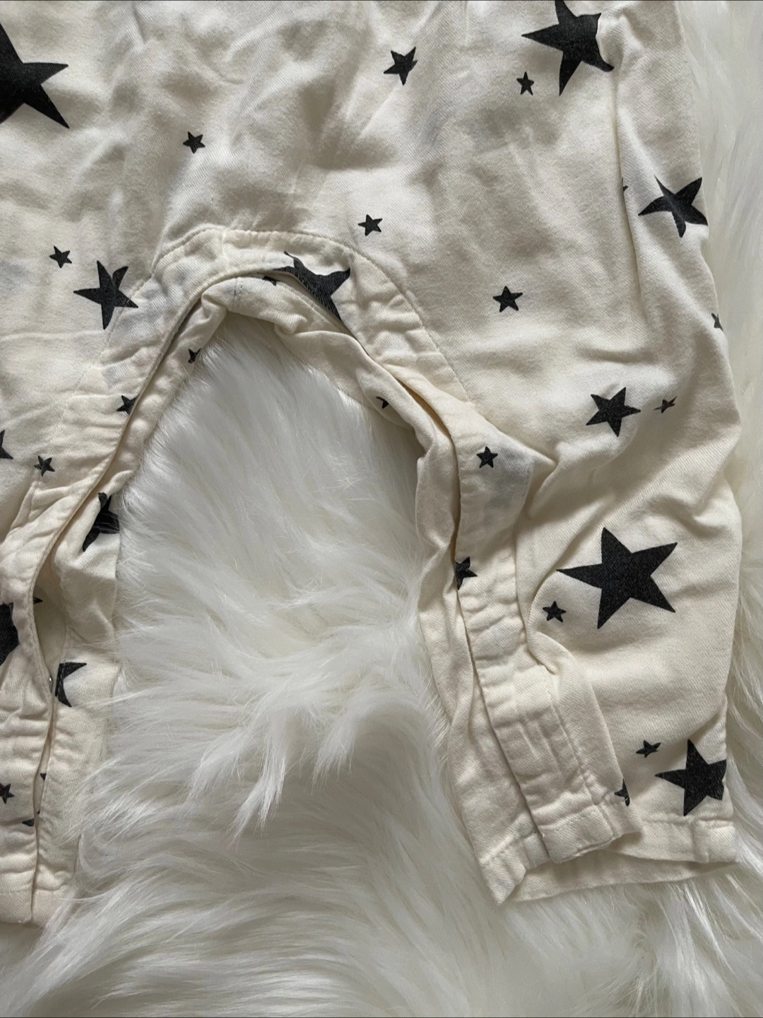 A cute one-piece in an off-white colour. Adorned with black stars, a ruffle trim, and buttons down the front. This outfit is perfect for a peaceful night's sleep. Excellent used condition.