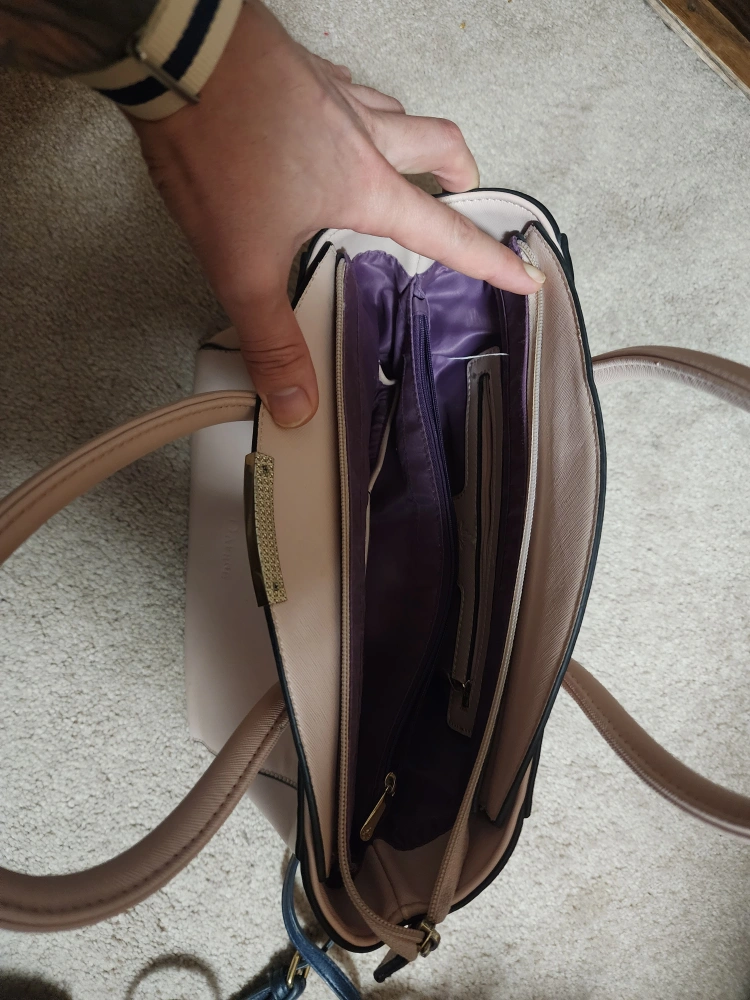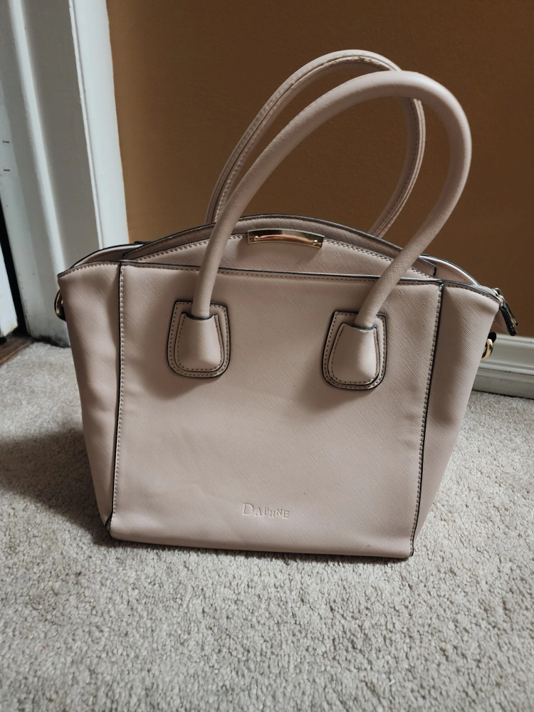 A pink handbag. Features two top handles. Interior with multiple compartments, including a zippered pocket. Perfect for organizing your essentials and staying stylish throughout your day.