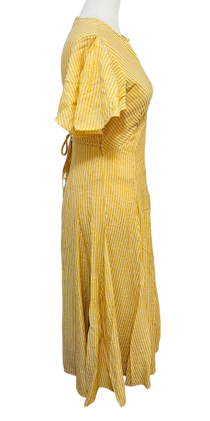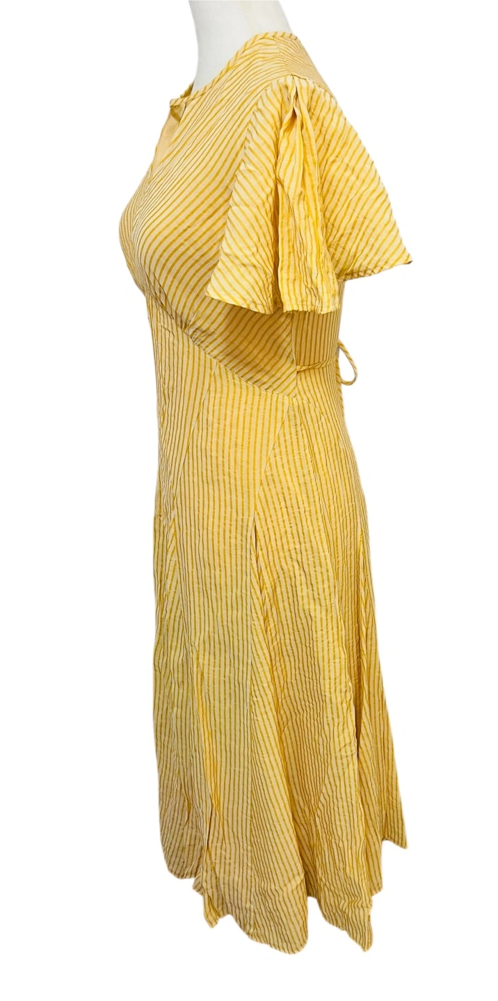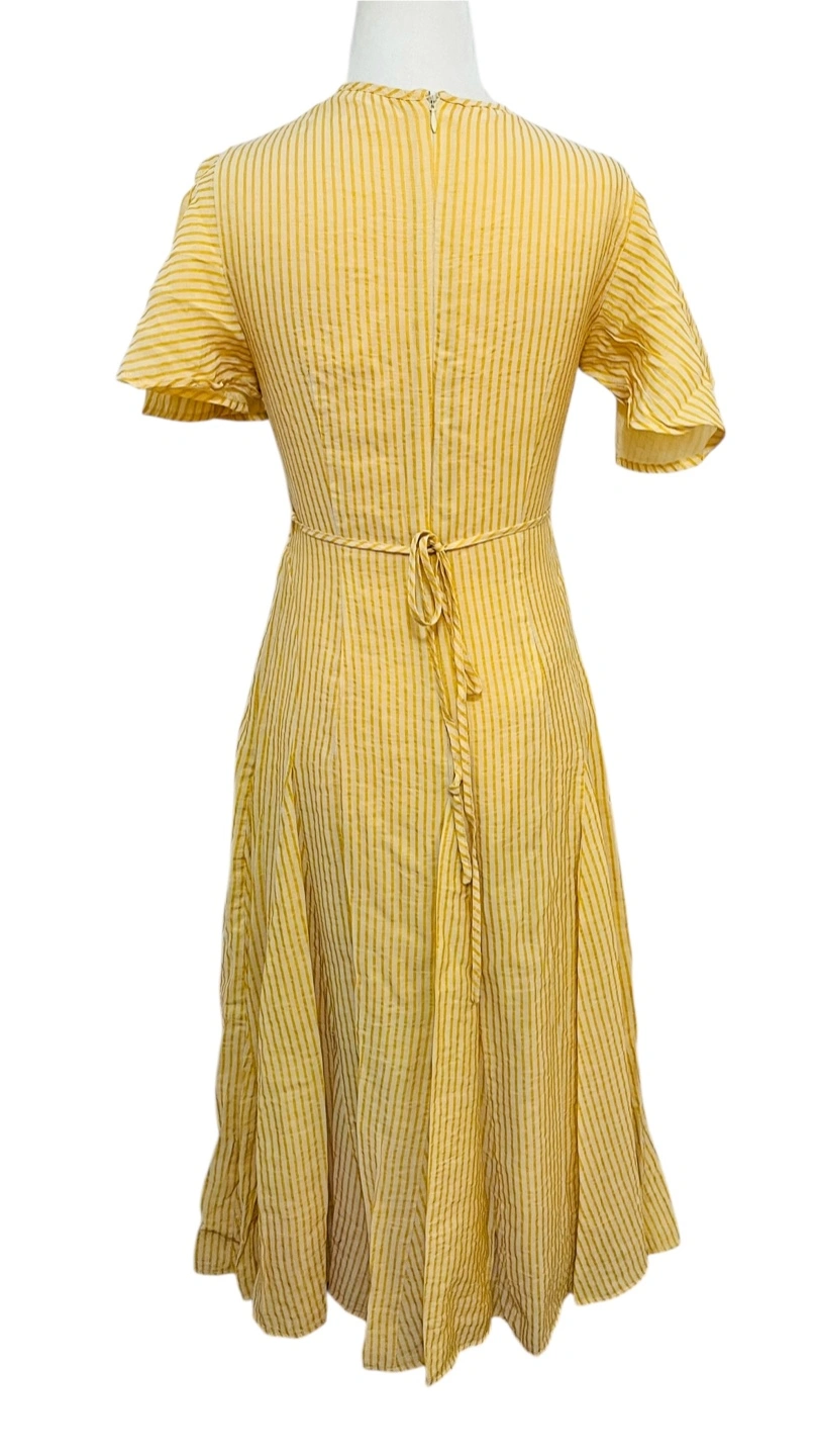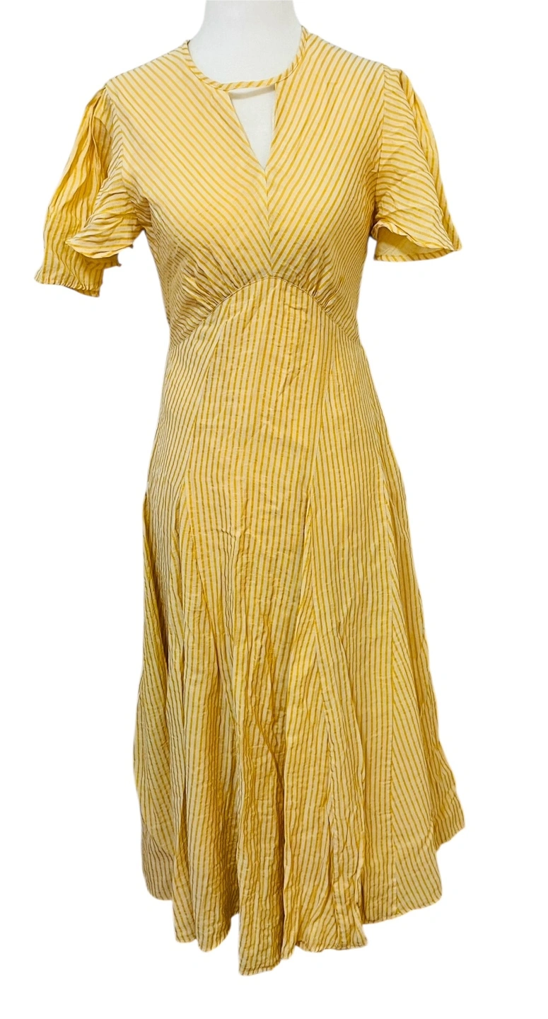 Golden hour glow meets effortless elegance in this charming midi dress. A vision in sunshine yellow, this dress features delicate stripes that add a touch of texture and visual interest. The unique cutout neckline offers a modern twist, while the tie-back detail allows for a customized and flattering fit. The flowing silhouette drapes beautifully, creating a graceful and feminine look. Imagine yourself twirling at a garden party, sipping cocktails on a breezy patio, or enjoying a romantic dinner under the stars in this radiant dress. Style: A-Line Dress Length: Midi Color: Yellow Department: Women Sleeve Length: Short Sleeve Pattern: Striped Occasion: Casual, Party/Cocktail Material: Polyester Neckline: V-Neck Fabric Type: Woven Character: Retro, Bohemian, Cottagecore, Sunshine, Golden Hour Season: Spring, Summer Sleeve Type: Flutter Sleeve Good Condition PU Ottawa & Strasburg, Kitchener Keywords: midi dress, yellow dress, striped dress, cutout dress, tie back dress, summer dress, casual dress, party dress, women's dress, size medium, Even Though, boho dress, bohemian dress, retro dress