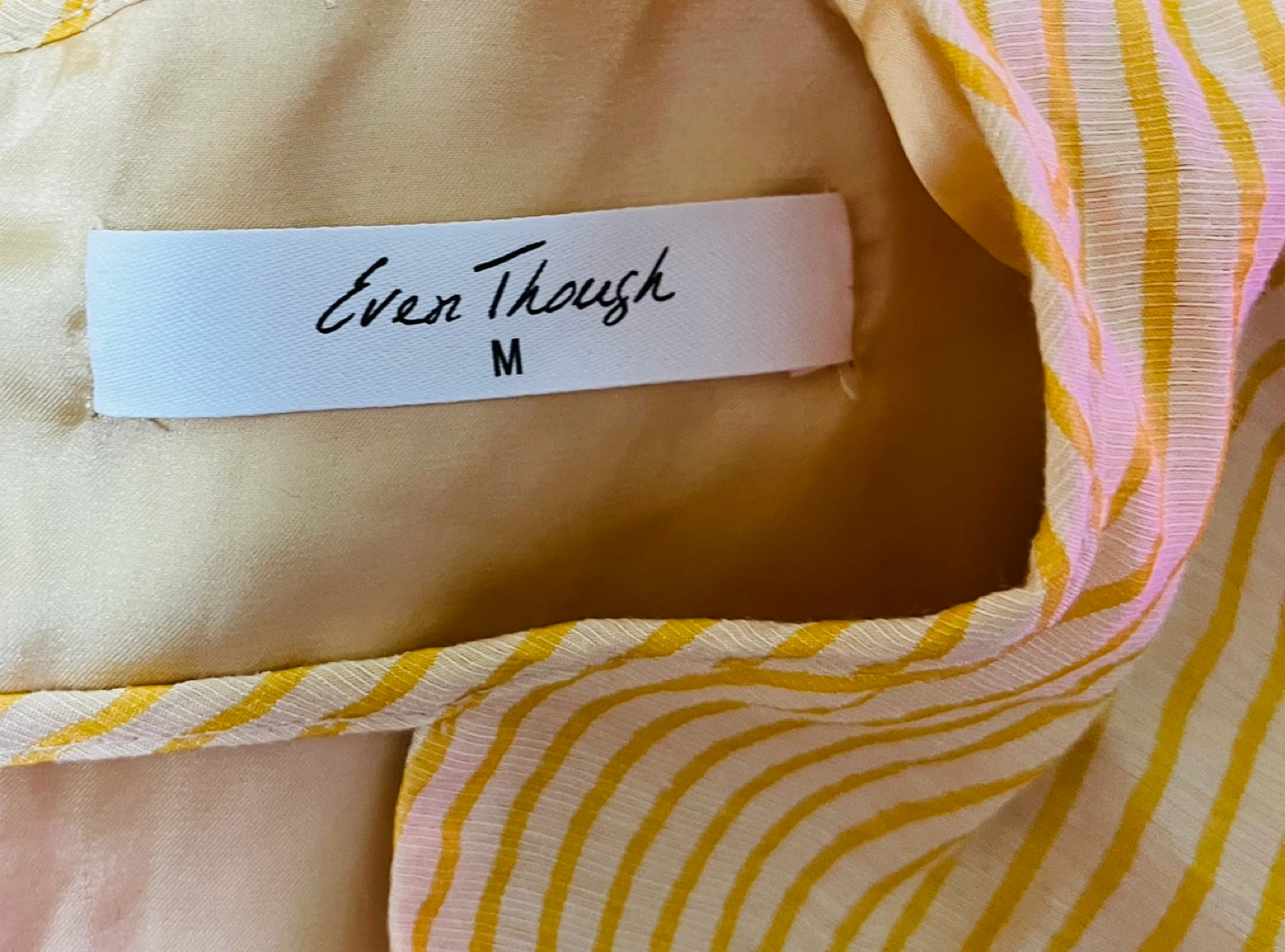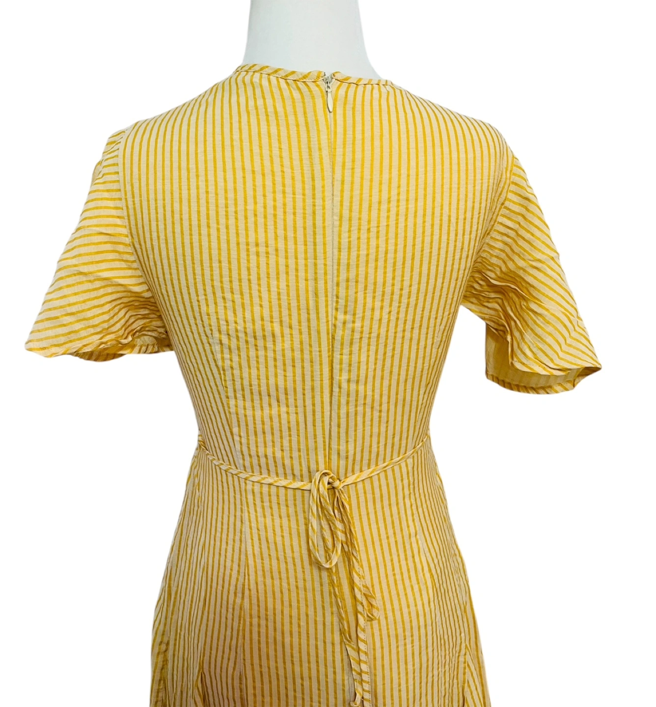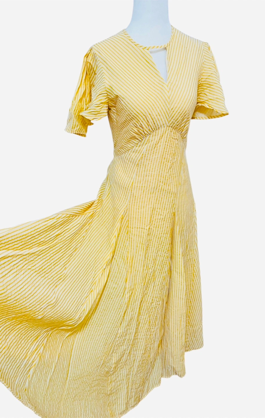 Golden hour glow meets effortless elegance in this charming midi dress. A vision in sunshine yellow, this dress features delicate stripes that add a touch of texture and visual interest. The unique cutout neckline offers a modern twist, while the tie-back detail allows for a customized and flattering fit. The flowing silhouette drapes beautifully, creating a graceful and feminine look. Imagine yourself twirling at a garden party, sipping cocktails on a breezy patio, or enjoying a romantic dinner under the stars in this radiant dress. Style: A-Line Dress Length: Midi Color: Yellow Department: Women Sleeve Length: Short Sleeve Pattern: Striped Occasion: Casual, Party/Cocktail Material: Polyester Neckline: V-Neck Fabric Type: Woven Character: Retro, Bohemian, Cottagecore, Sunshine, Golden Hour Season: Spring, Summer Sleeve Type: Flutter Sleeve Good Condition PU Ottawa & Strasburg, Kitchener Keywords: midi dress, yellow dress, striped dress, cutout dress, tie back dress, summer dress, casual dress, party dress, women's dress, size medium, Even Though, boho dress, bohemian dress, retro dress
