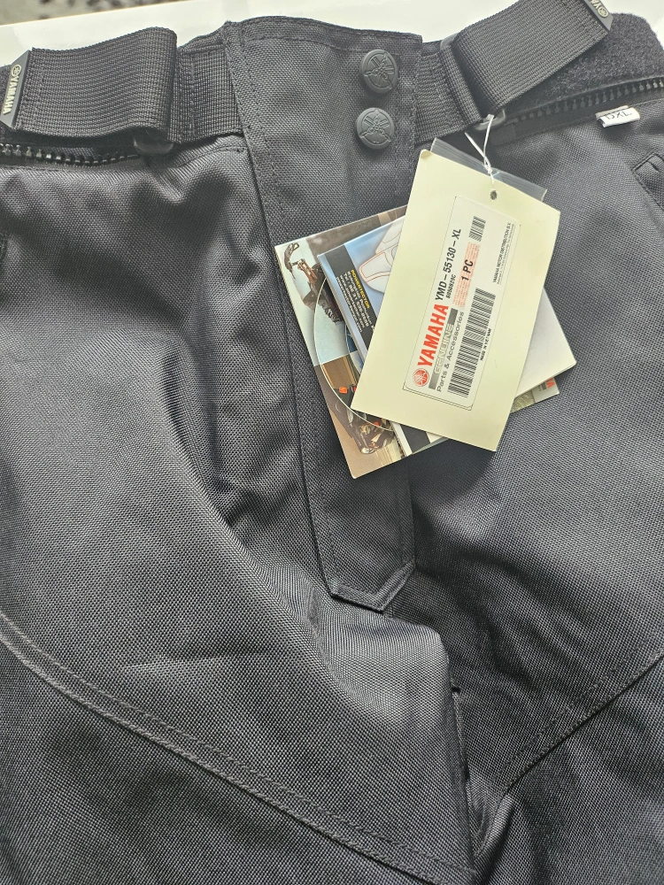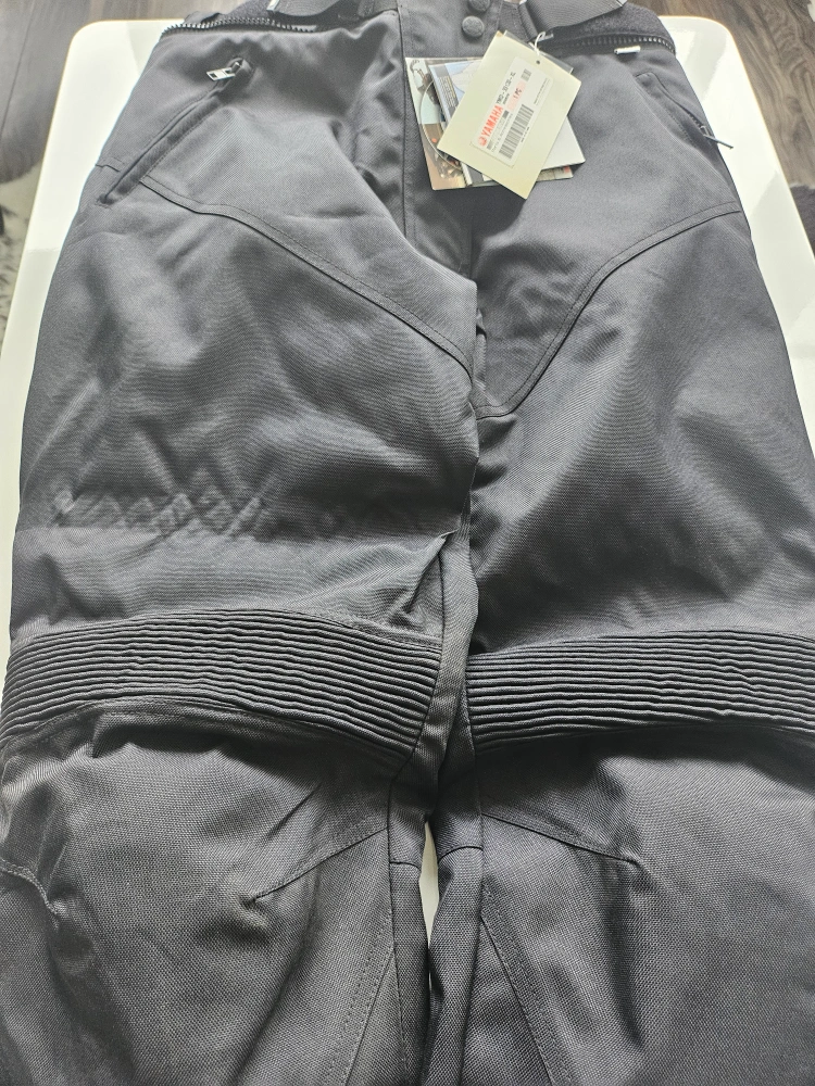 Durable black motorcycle pants. Features several pockets. With zippers and button closure. A great addition to your riding gear, offering both style and function.