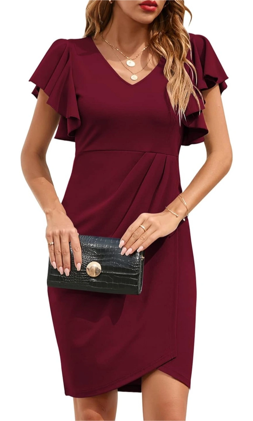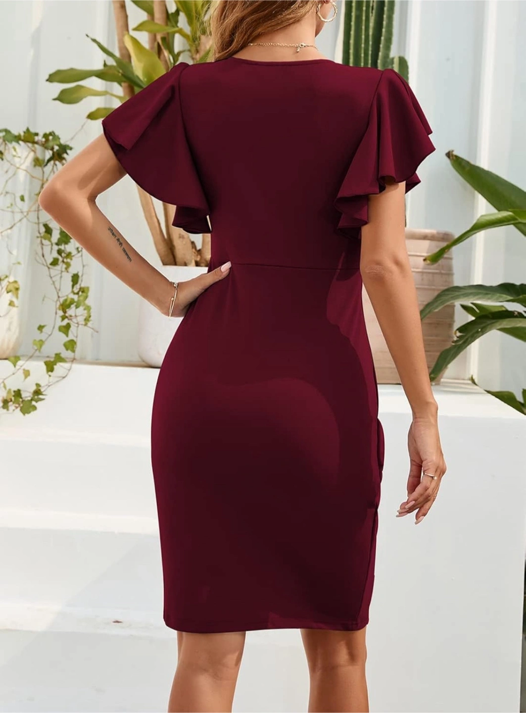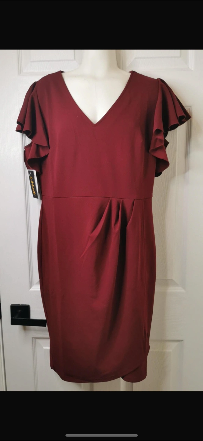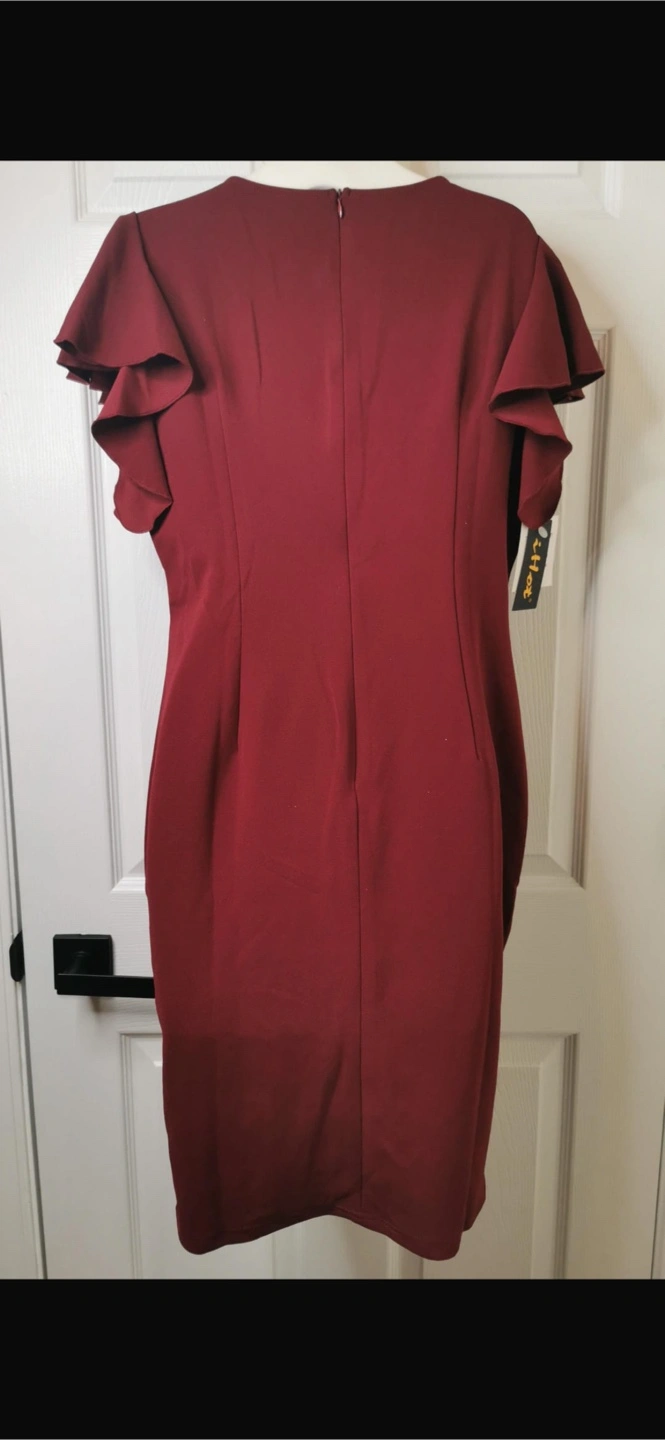 New with tag! Retails for $59 Maroon dress with short, flutter sleeves. Features a V-neckline. The dress has a bodycon fit with a wrap style skirt. Perfect for any event, this dress makes you feel fabulous.