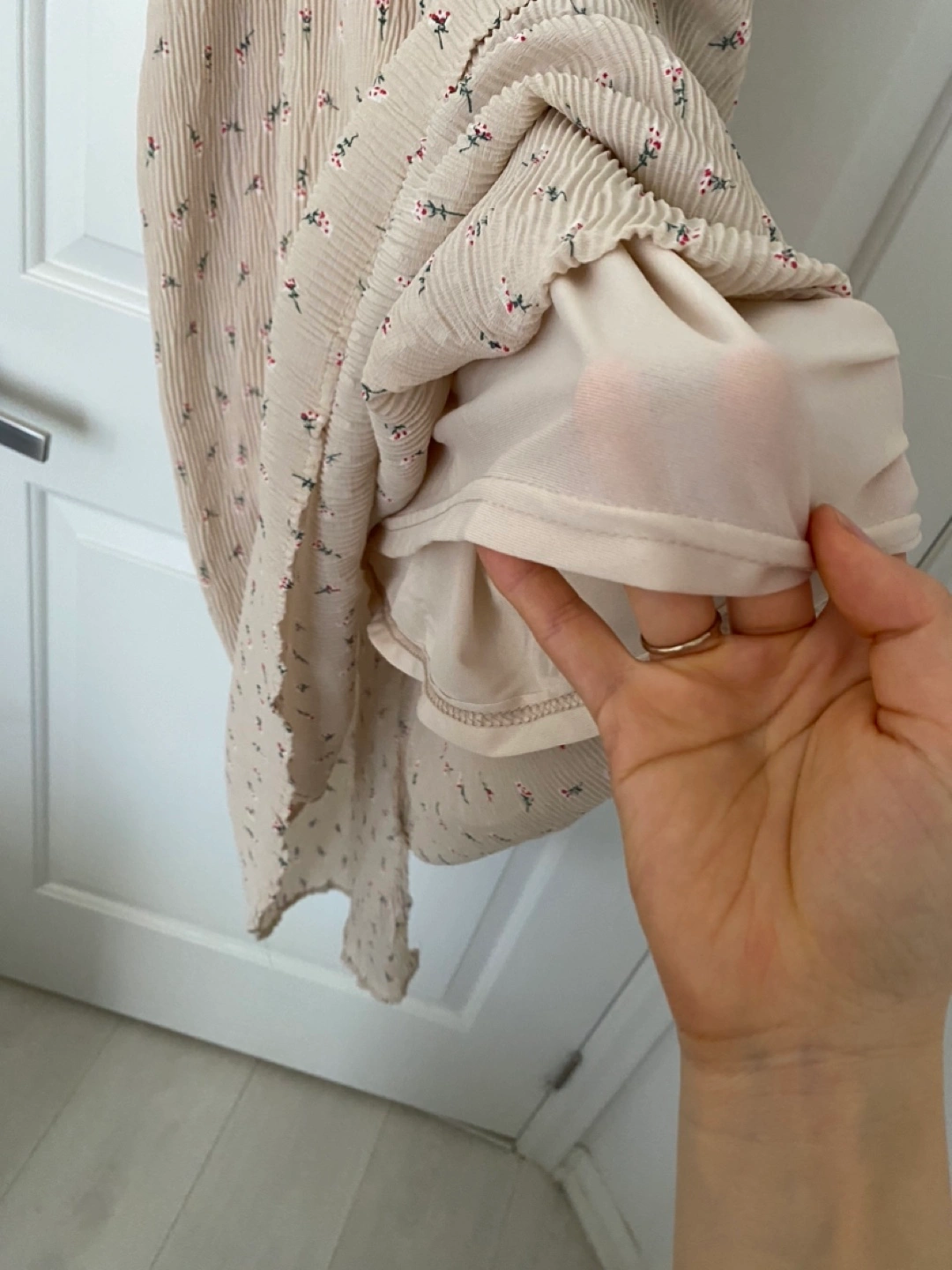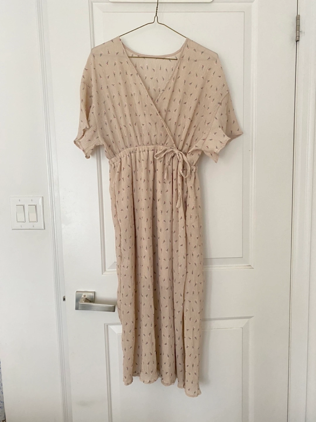 Dress in a cream color. Decorated with small flowers. The dress has pleats and a belt. It would be wonderful to wear while sipping tea and reading a book. Bought for vacation didn’t end up going. I can meet at Adelaide east & sherbourne or king station most of the days!