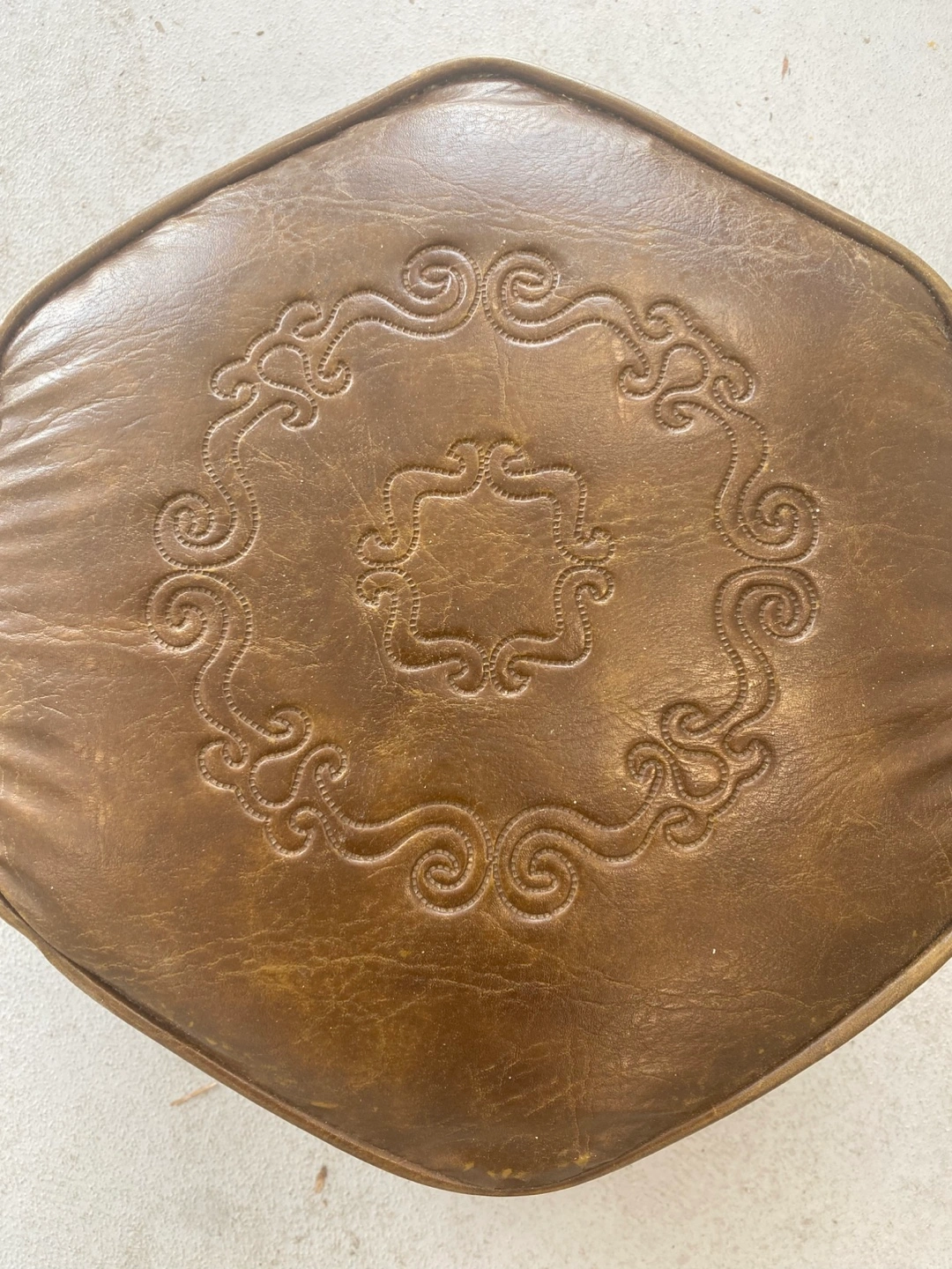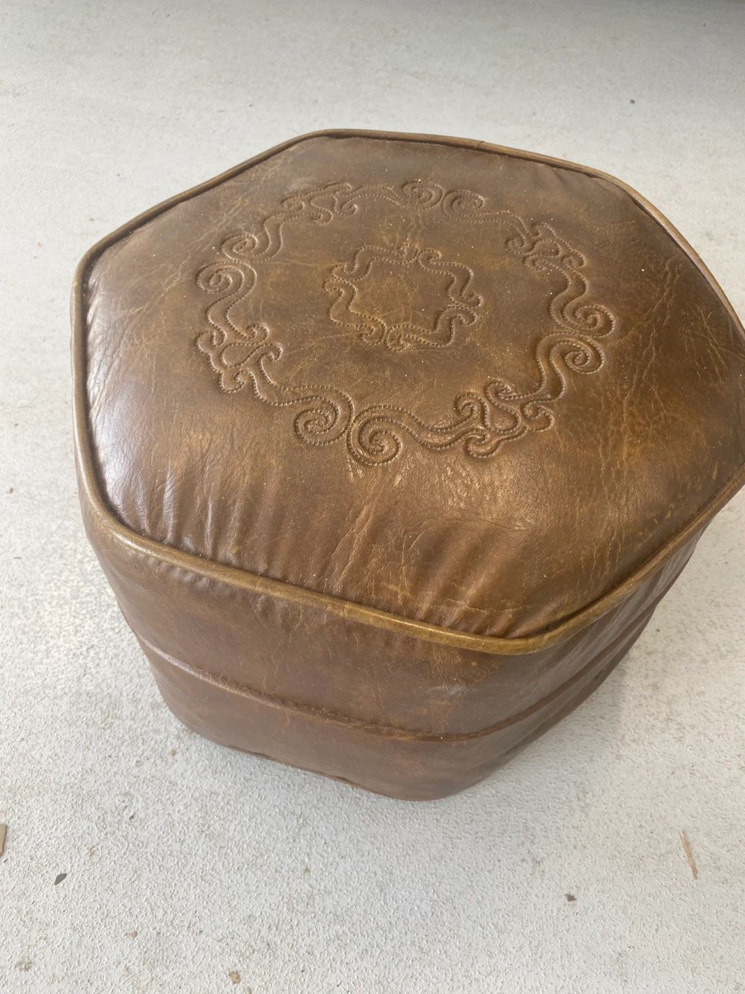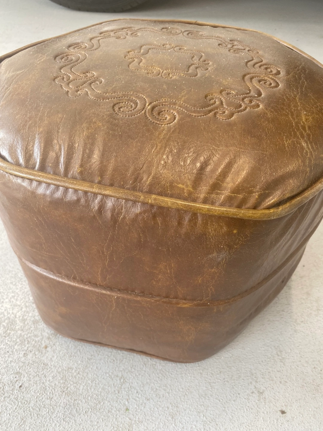 A vintage ottoman. Brown in colour. Featuring ornate design on the top. A stylish accent piece for any living space, creating a cozy and inviting atmosphere is its primary function.