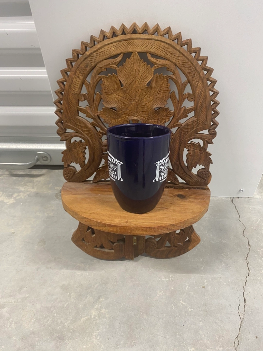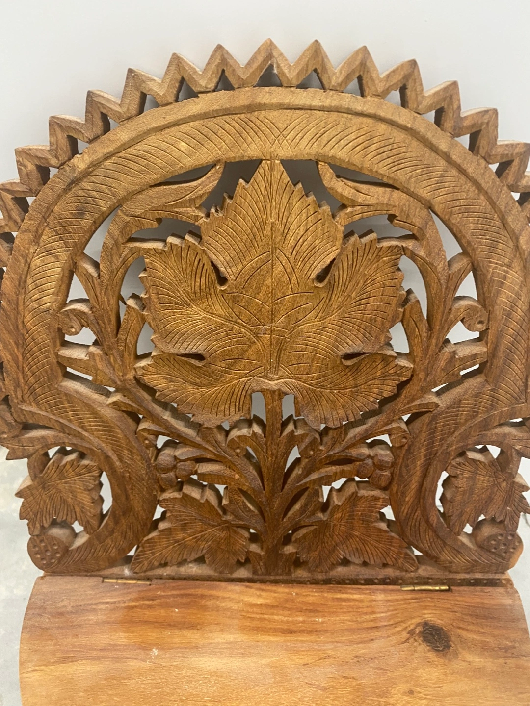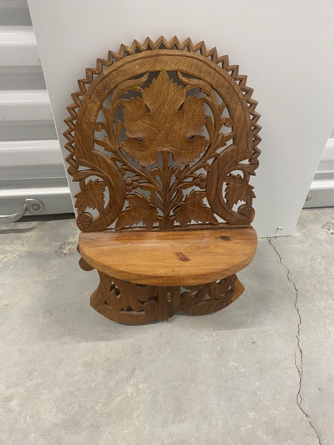 Wooden wall shelf. Carved design. Floral and leaf motifs. It would be a lovely addition for displaying a small plant or decorative item.