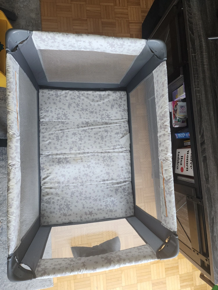 Foldable for easy transport (comes with bag). We have an extra mattress we added in for comfort (see pics, it's kept wrapped for now). selling with the mattress. Smoke-free and Pet-free home.