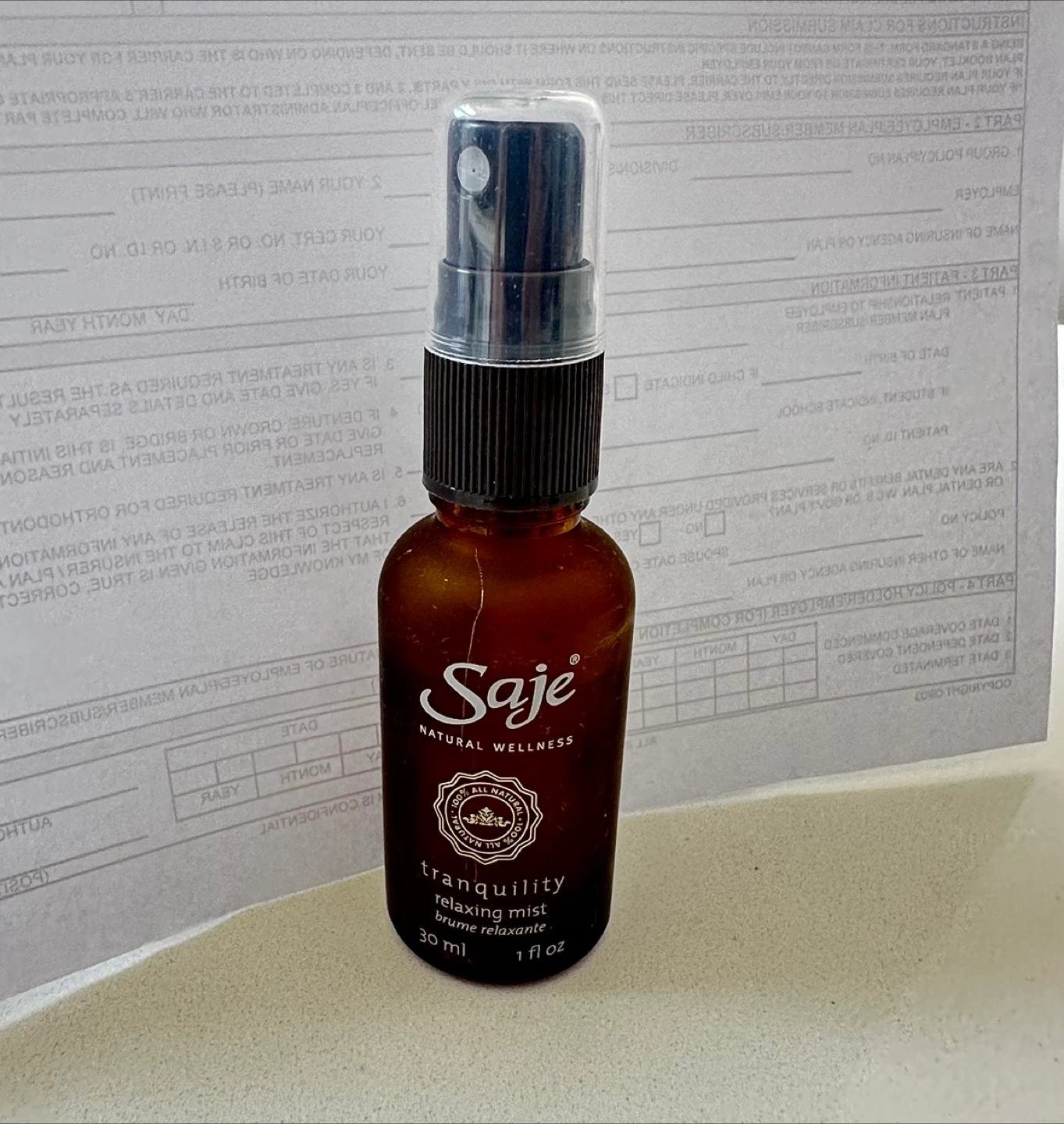 A Saje Natural Wellness tranquility relaxing mist. Features a brown bottle with a black spray top. The product information is printed on the bottle. Using this mist can help bring a sense of peace to your space.
